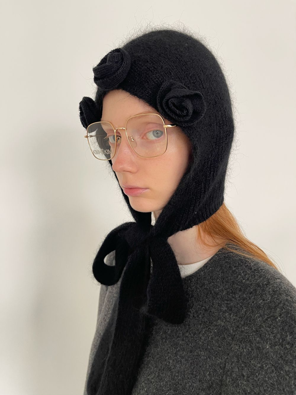 PFF GIRL Black Wool Handmade Floral Earmuff Hood