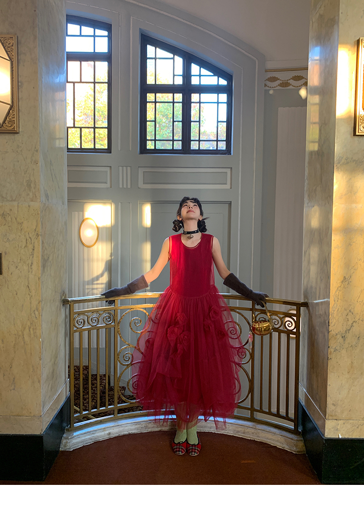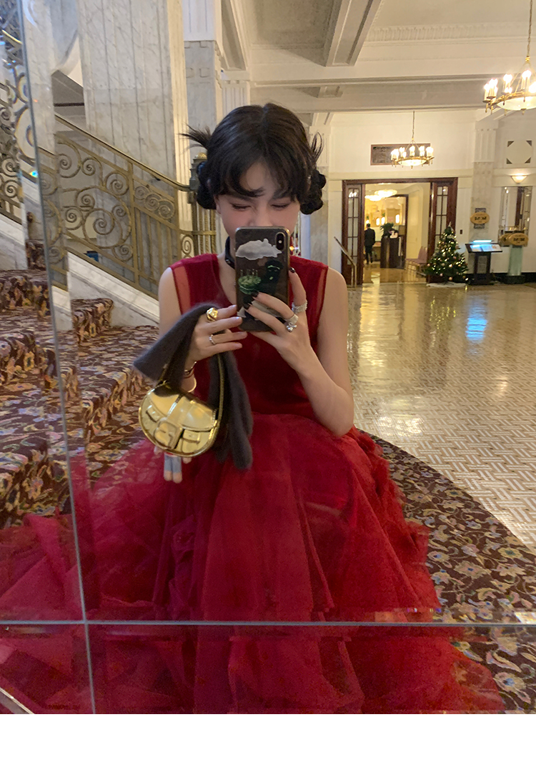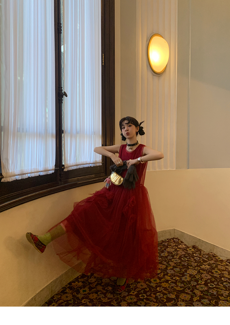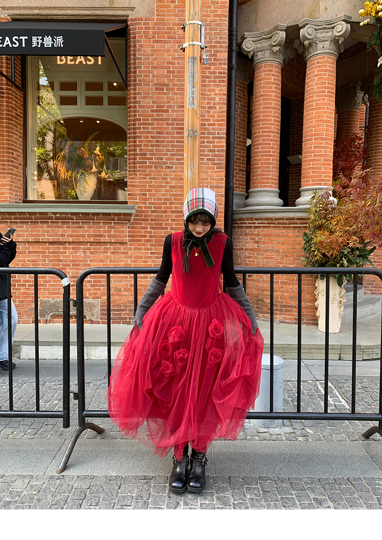 LRIB Red Flower Complex Layered Mesh Velvet Skirt / Dress