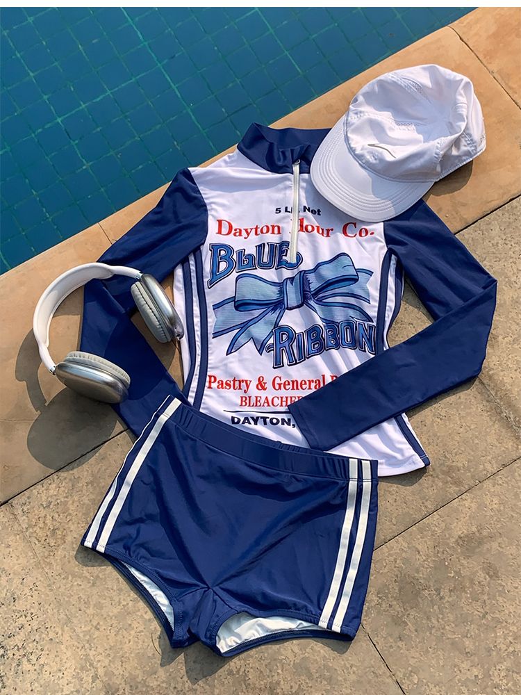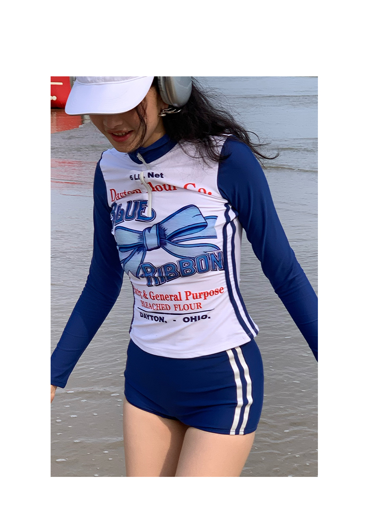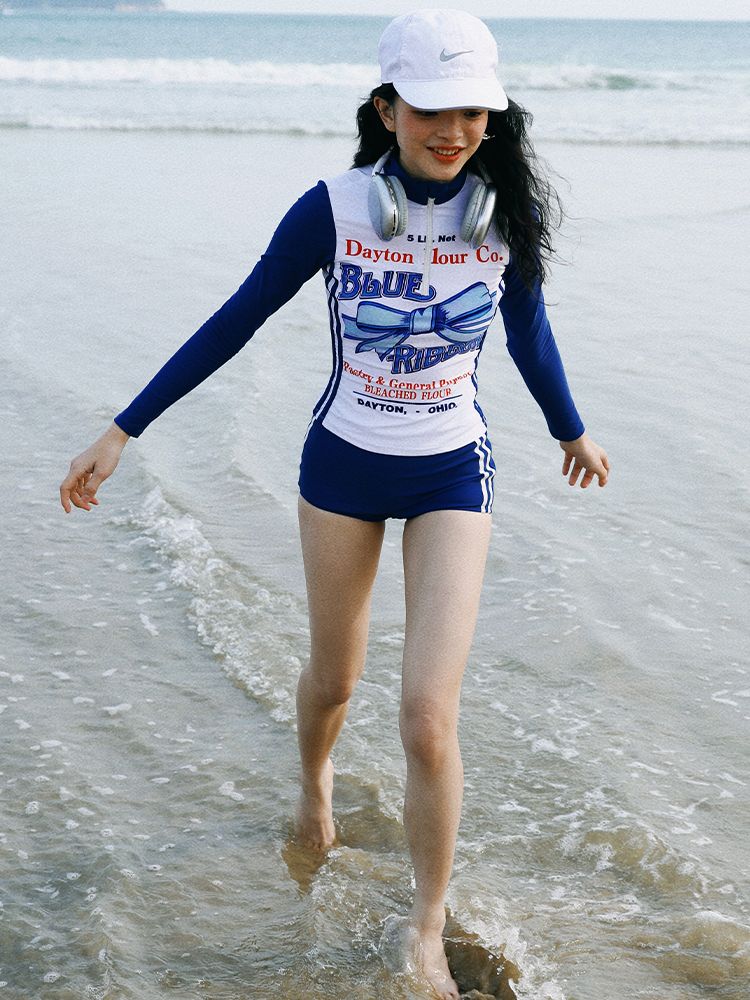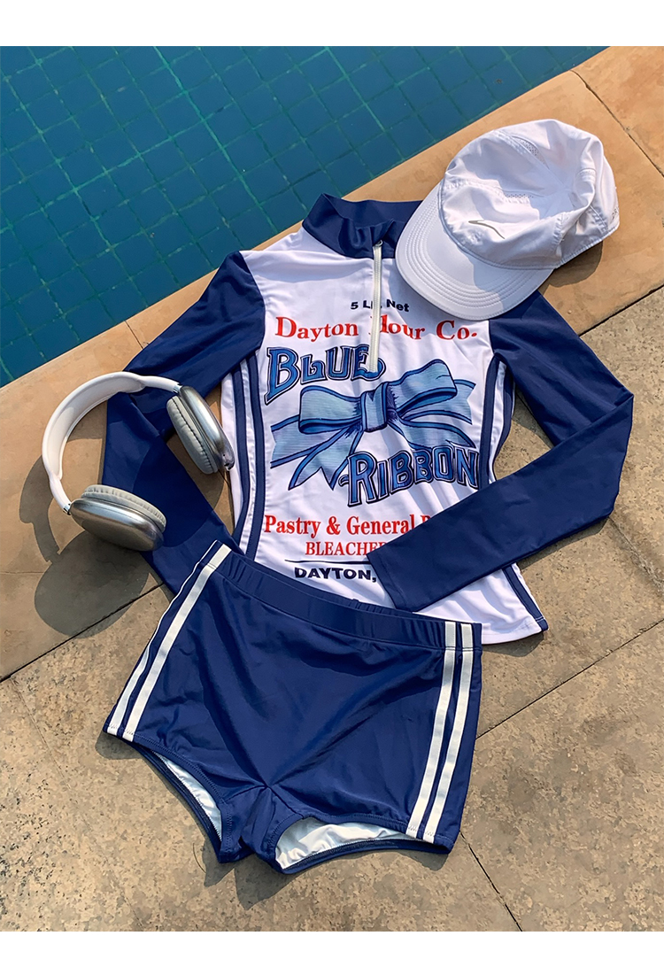 MOF Blue Bow Long-sleeved Split Sports Sun Protection Swimsuit