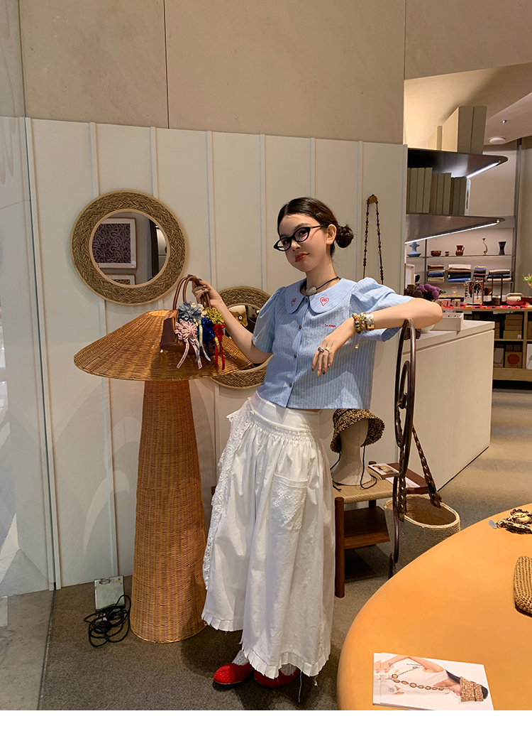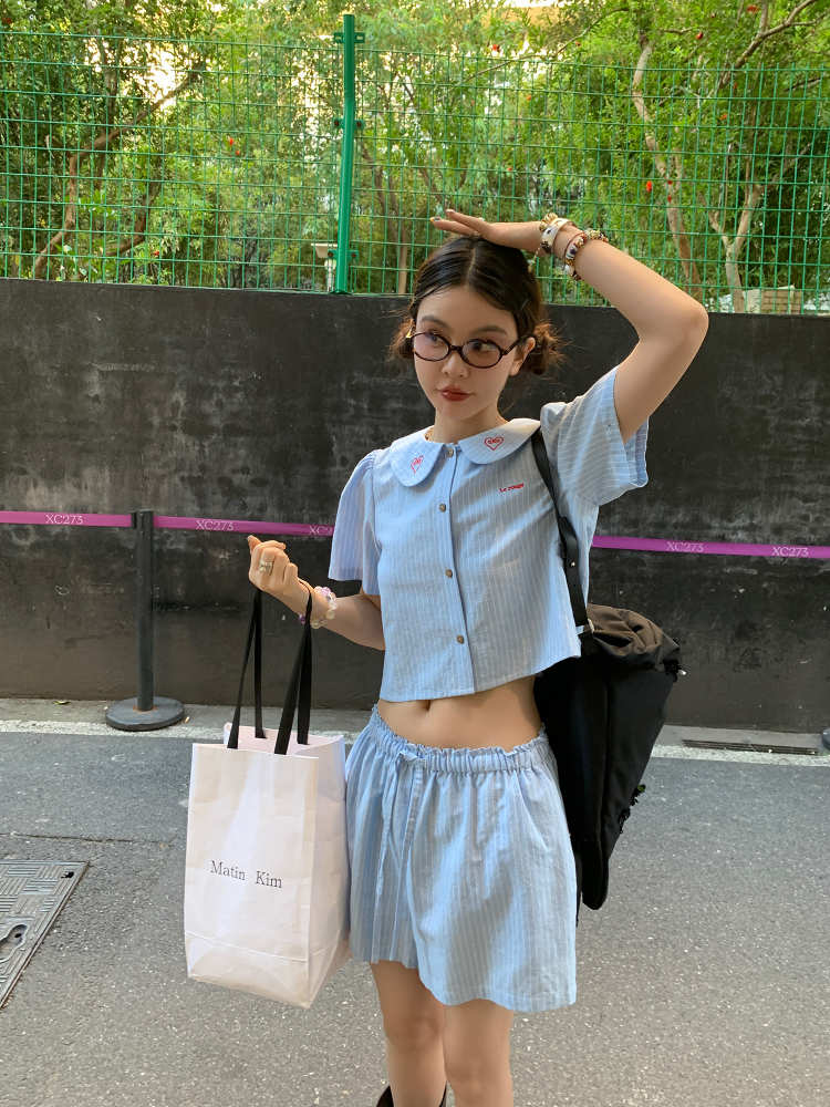 LRIB Blue White Striped Heartfelt Embroidered Short Sleeve Top Shorts Set