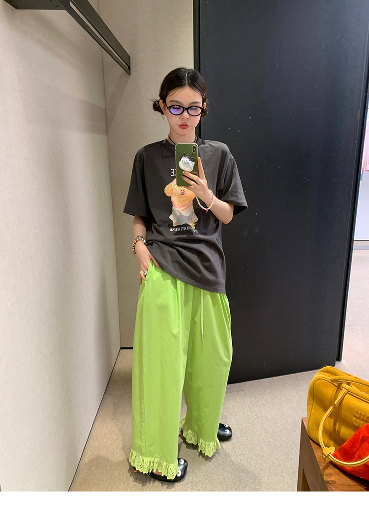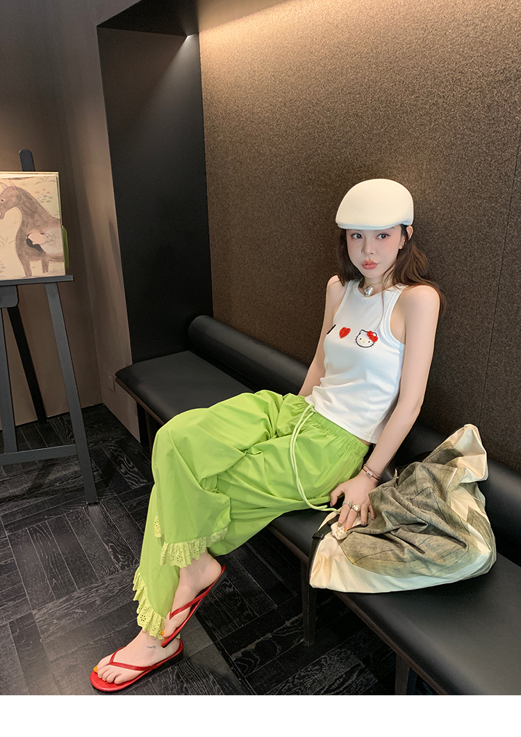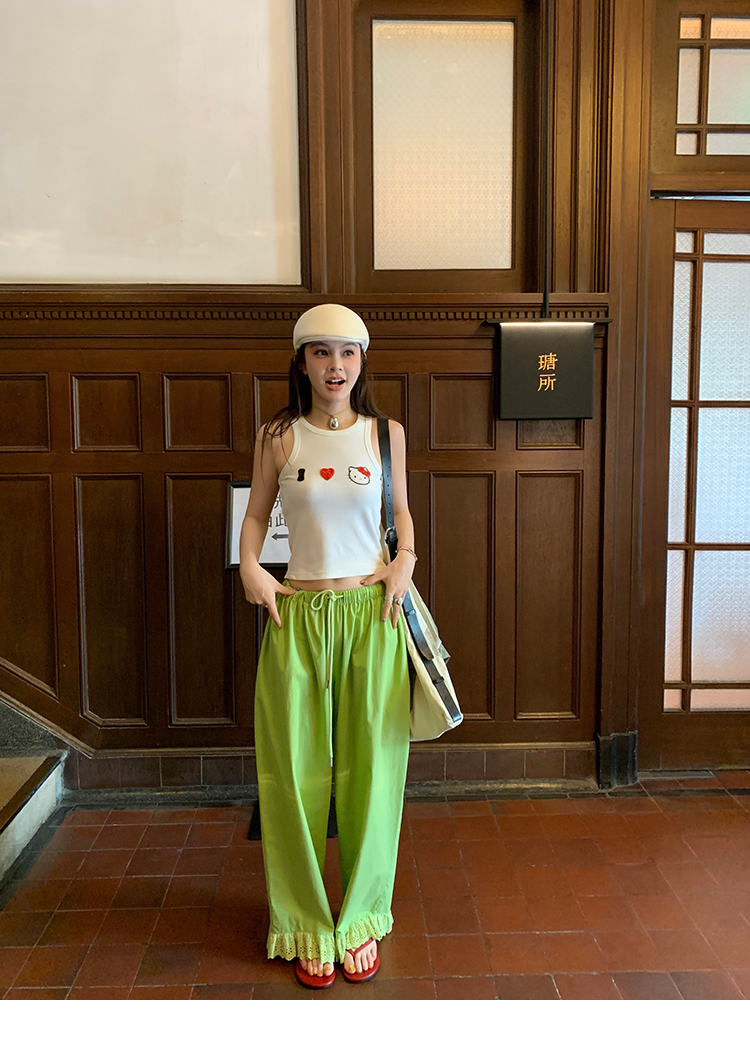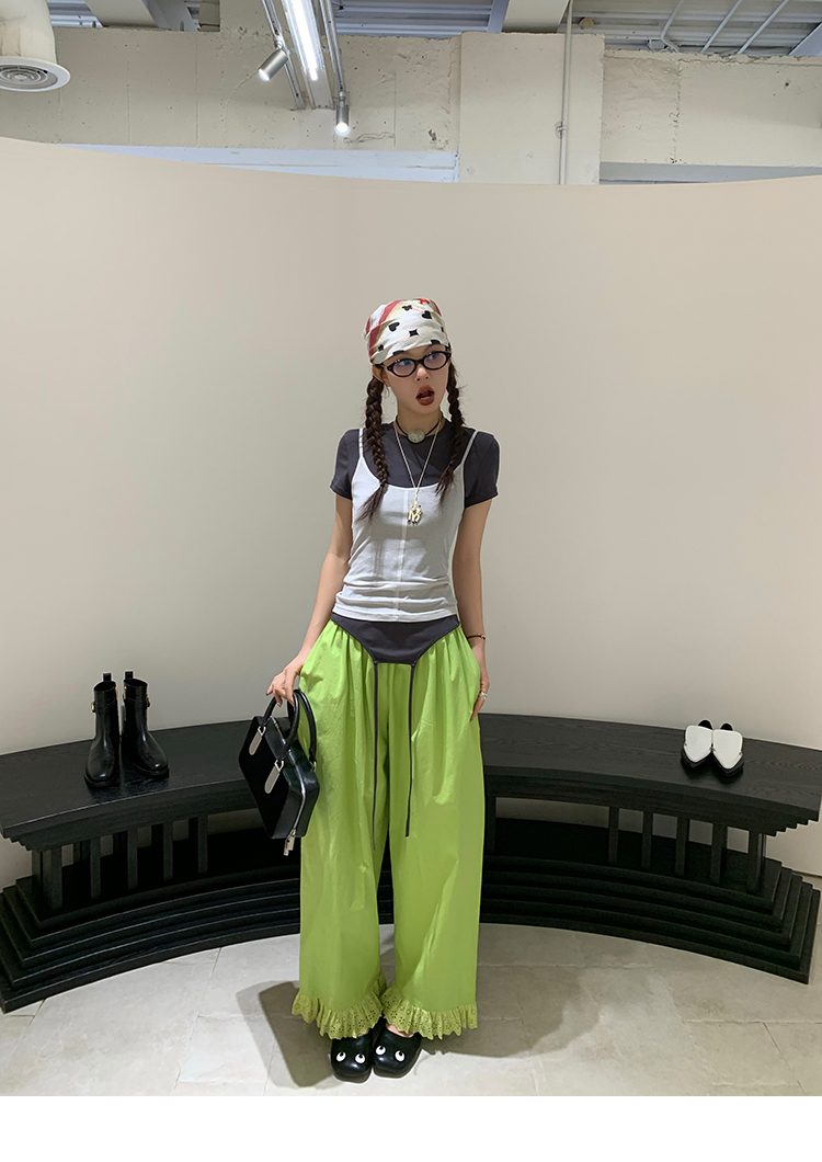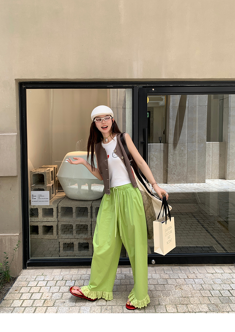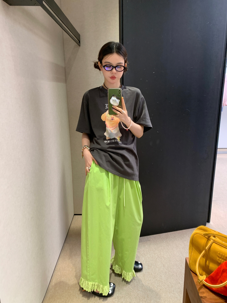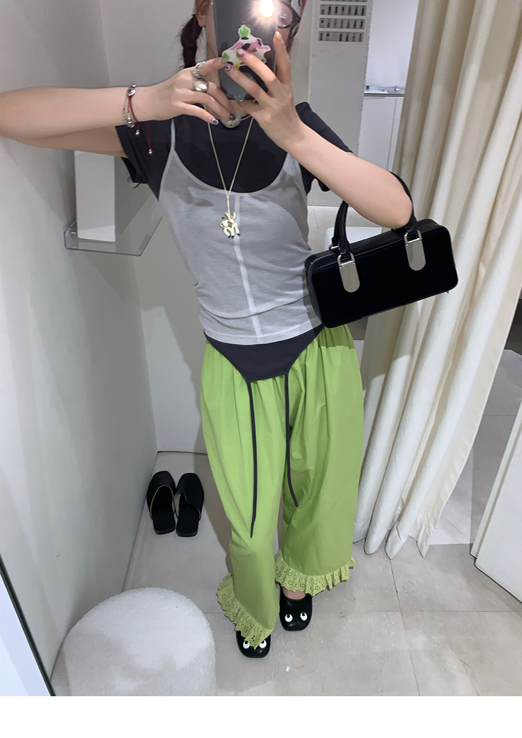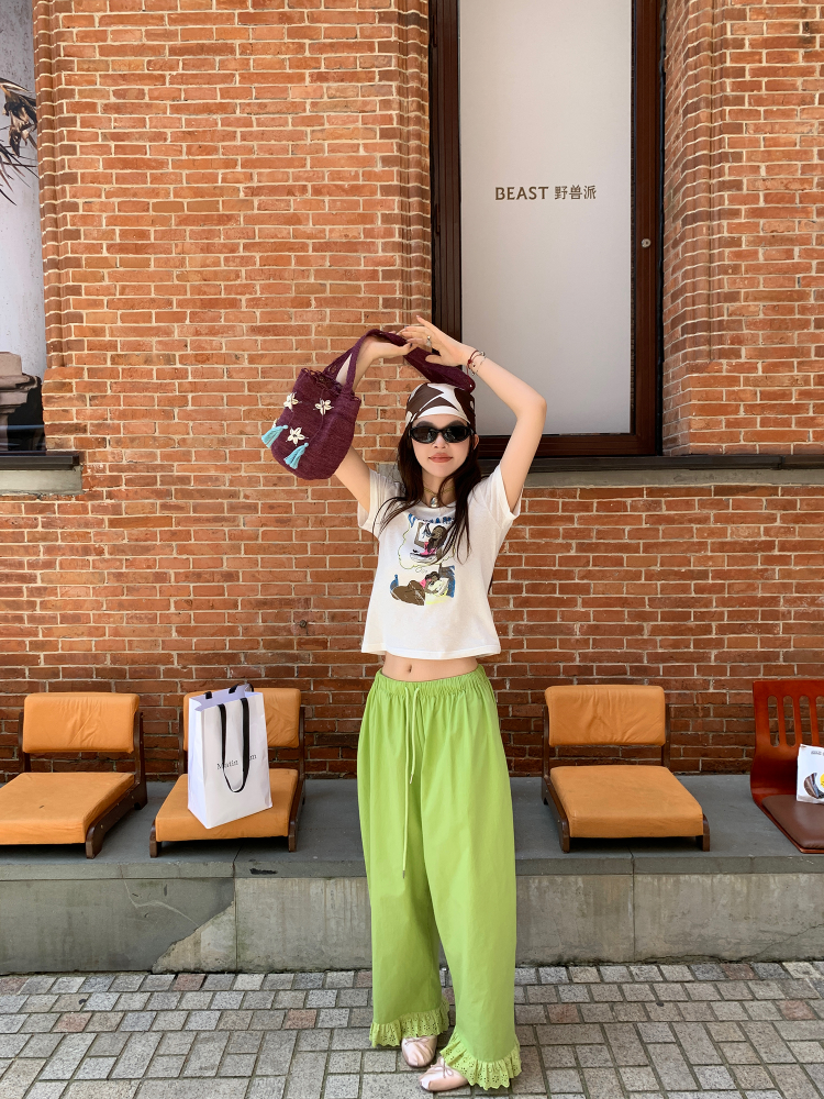 LRIB Fresh Apple Green Versatile Lace Lace Rope Casual Long Pants