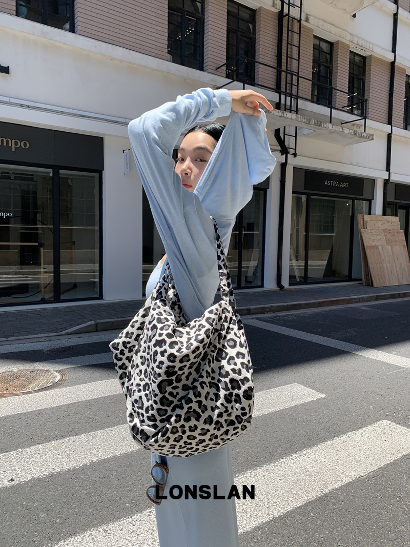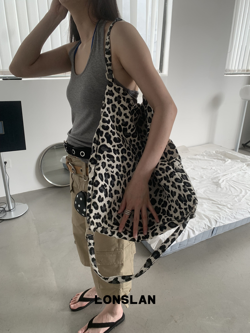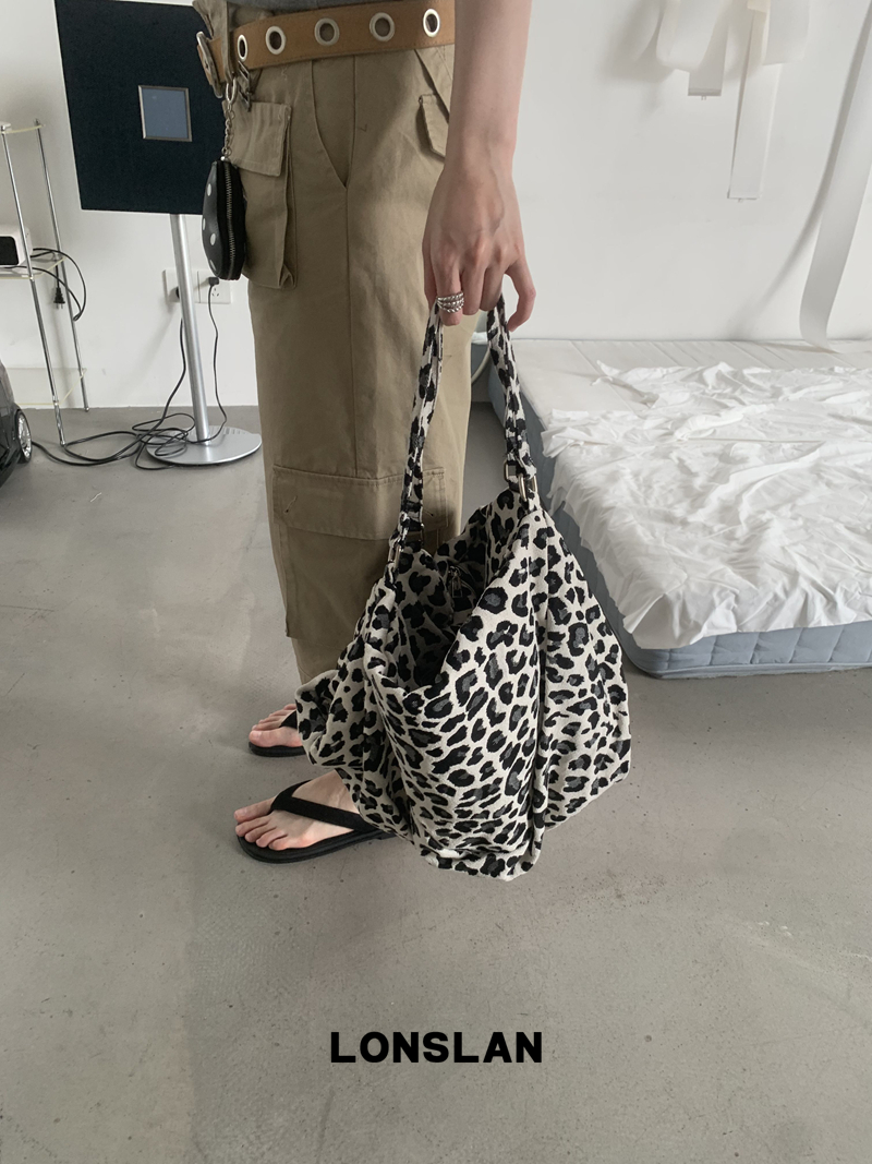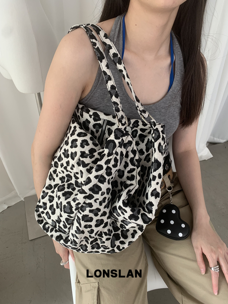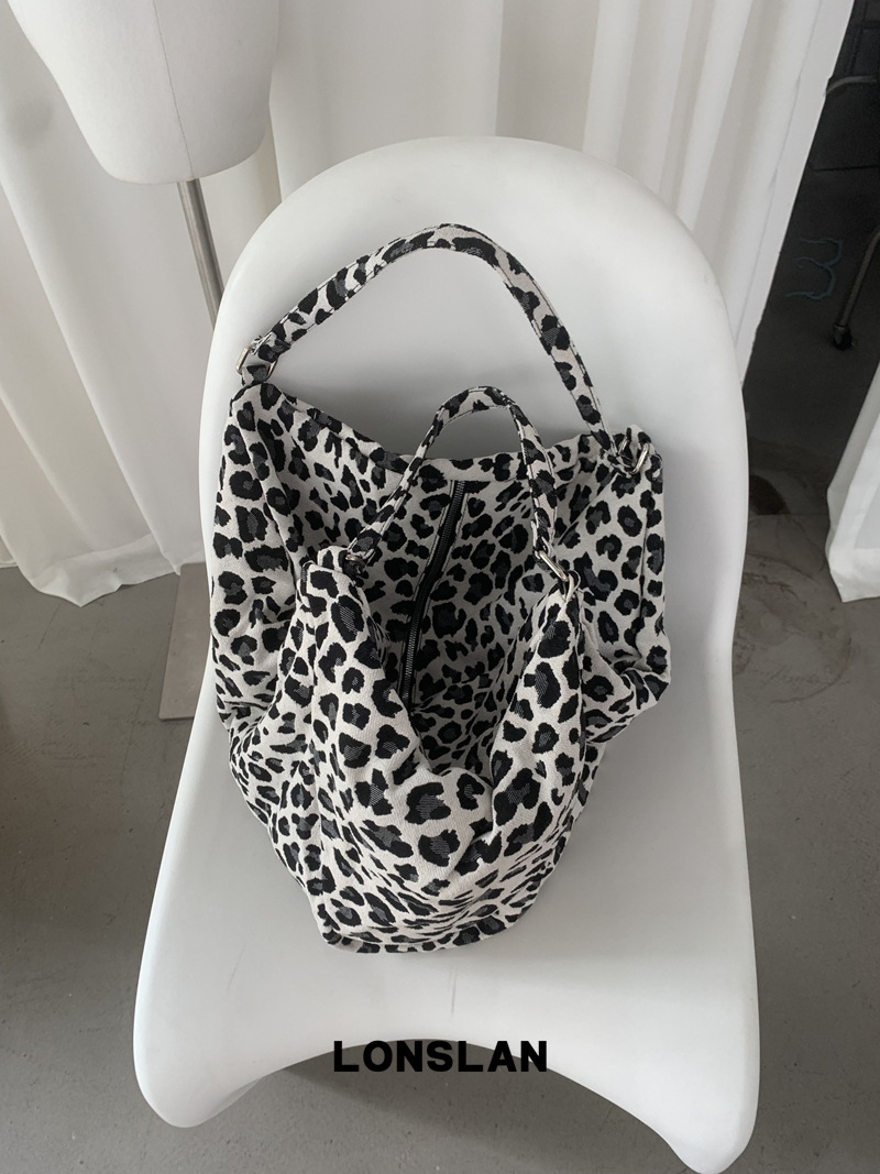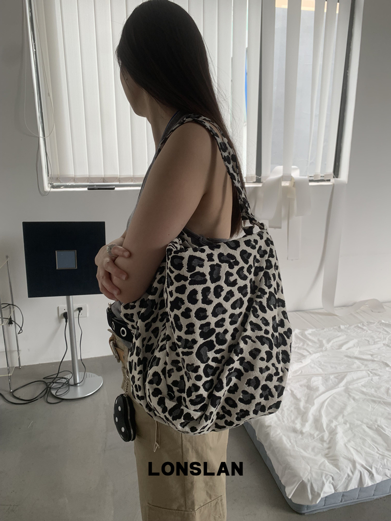 LONSLAN Black and White Leopard Print Fabric Shoulder Bag