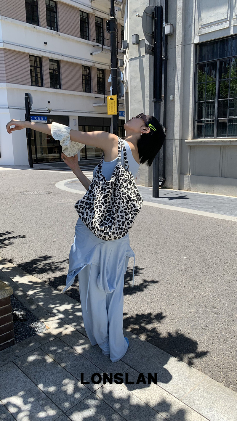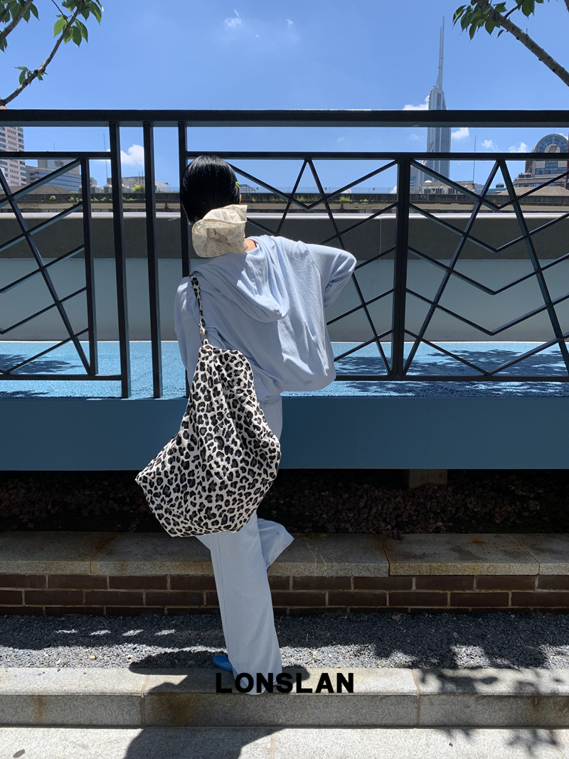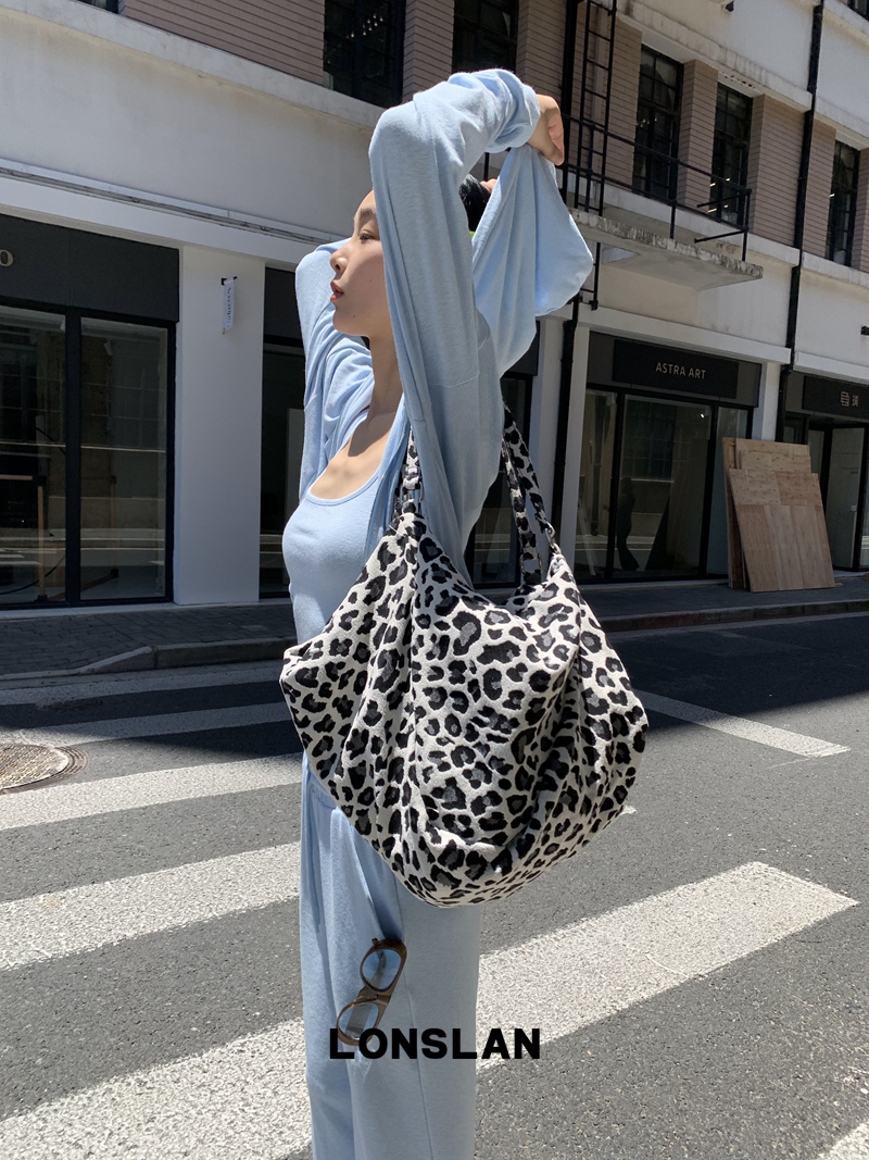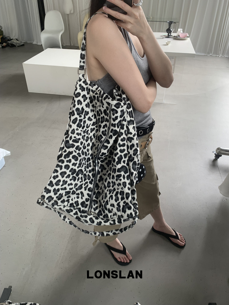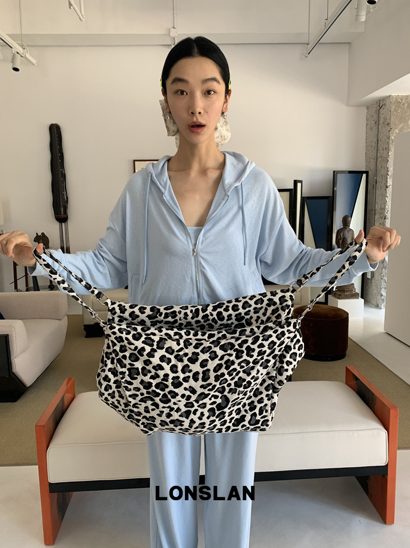 LONSLAN Black and White Leopard Print Fabric Shoulder Bag