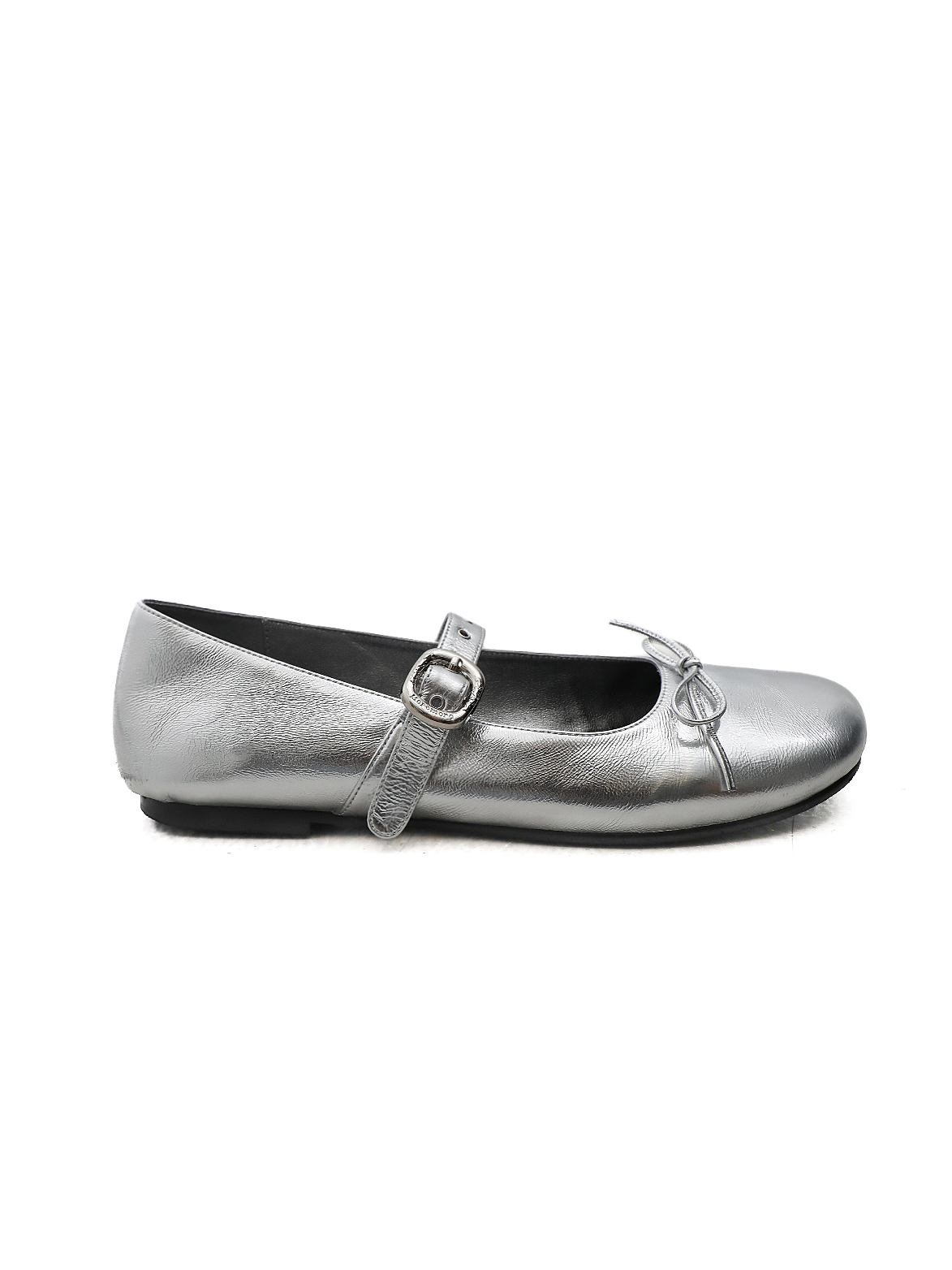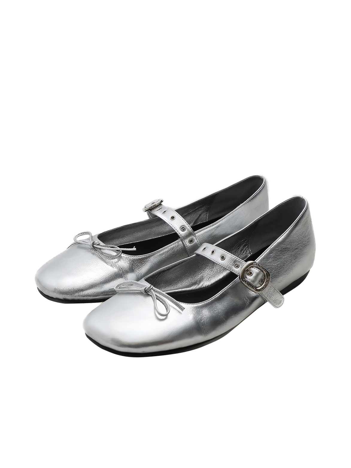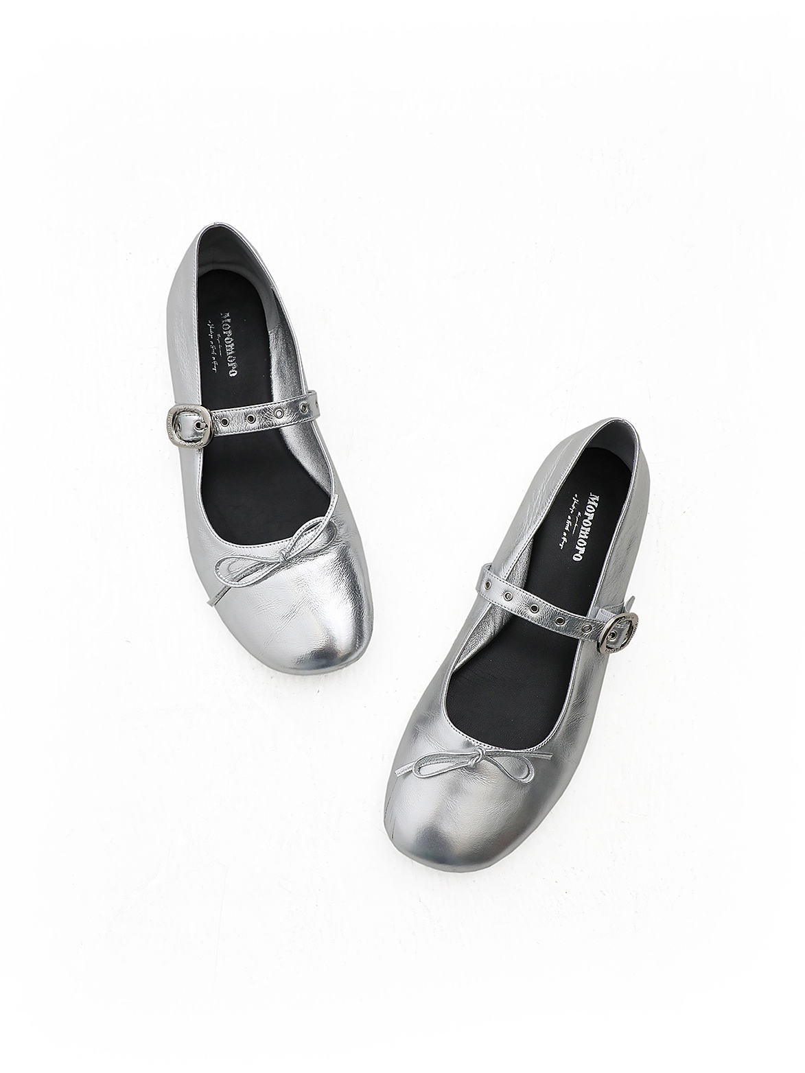 Moromoro top-tier leather bow decorative sheepskin silver ballet shoes