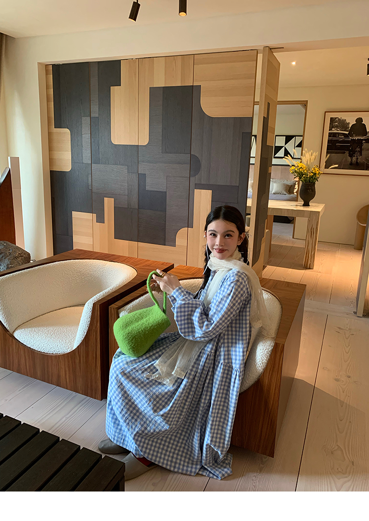 LRIB retro literary blue and white plaid stand collar long sleeve dress