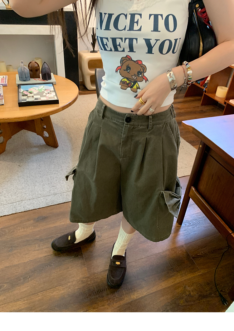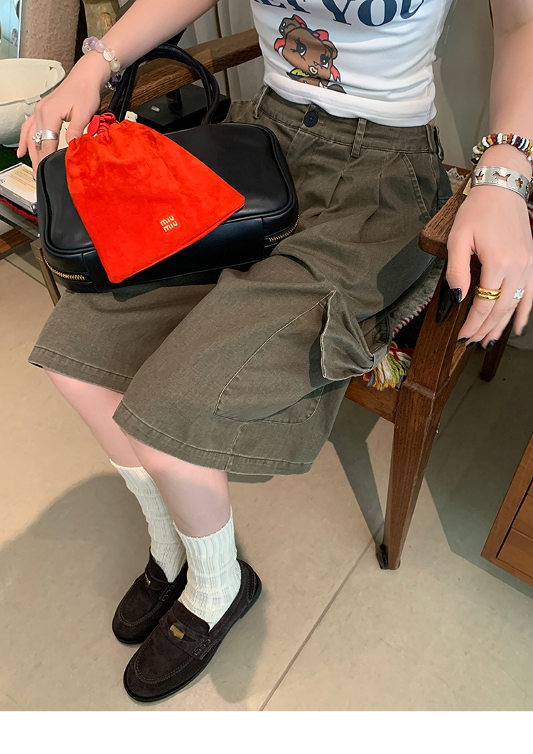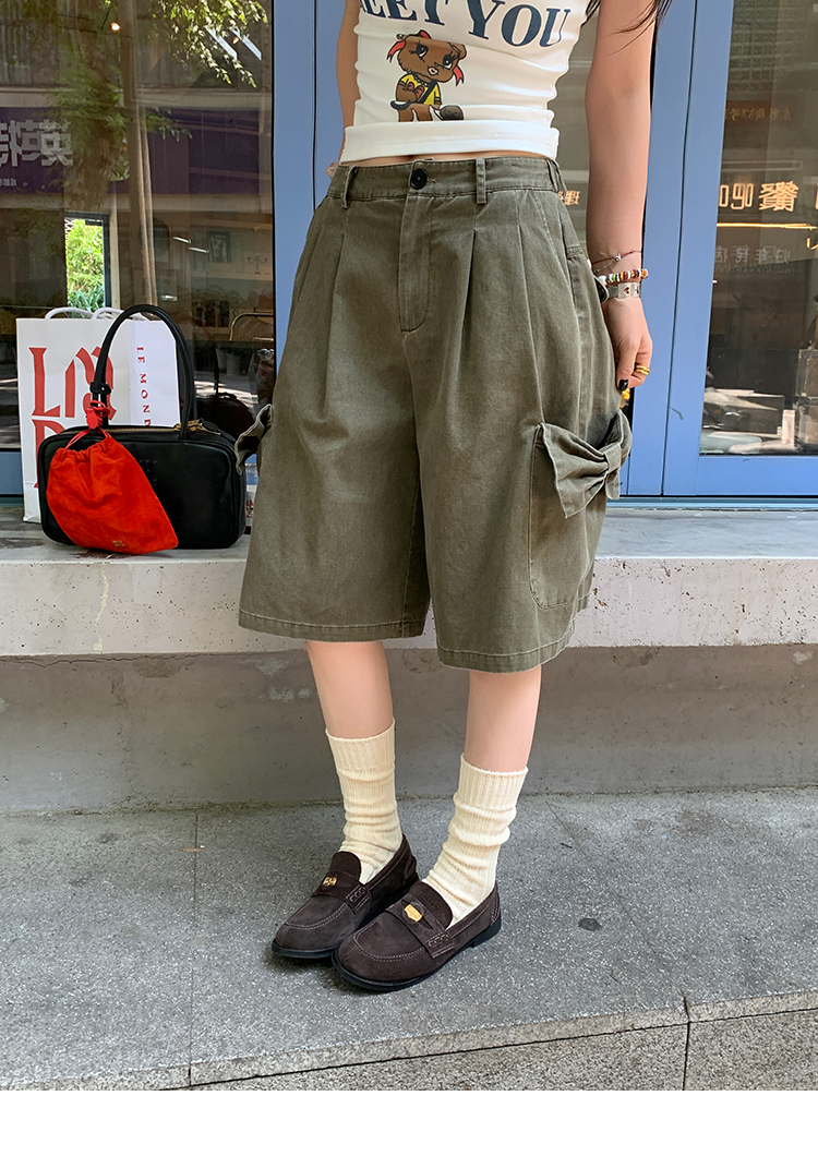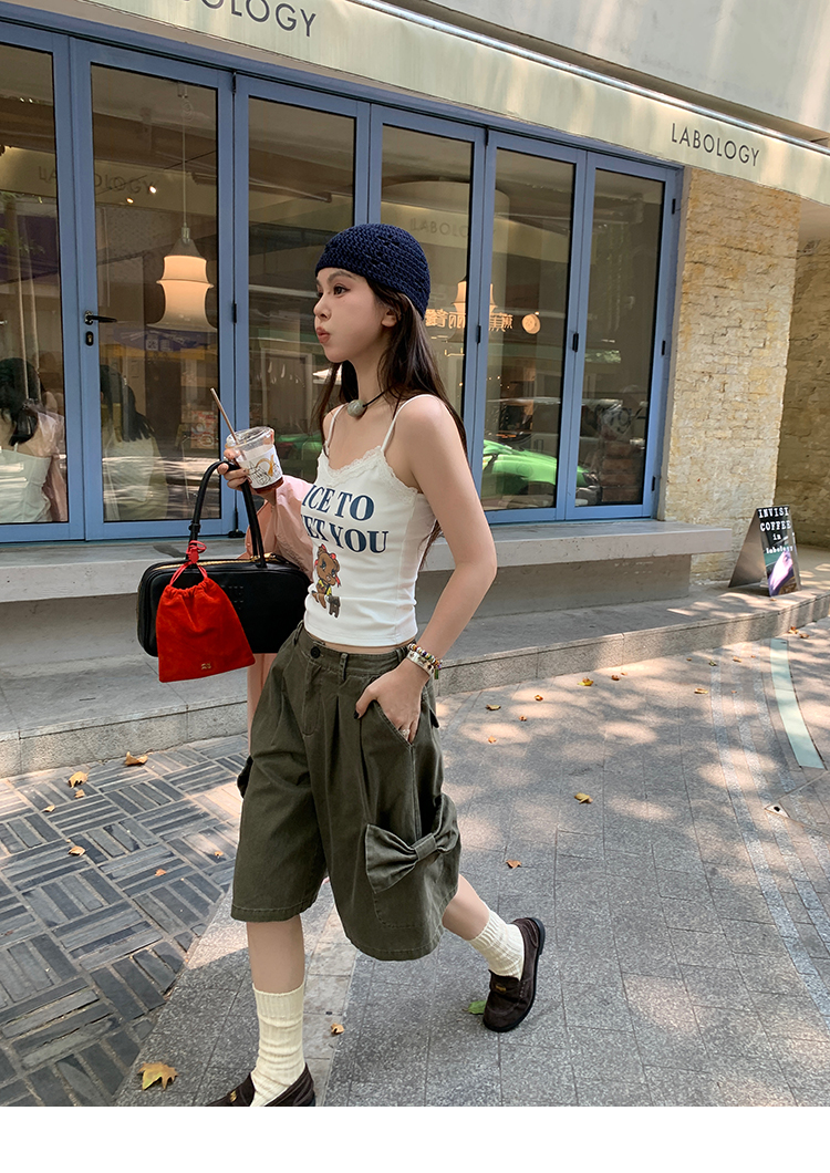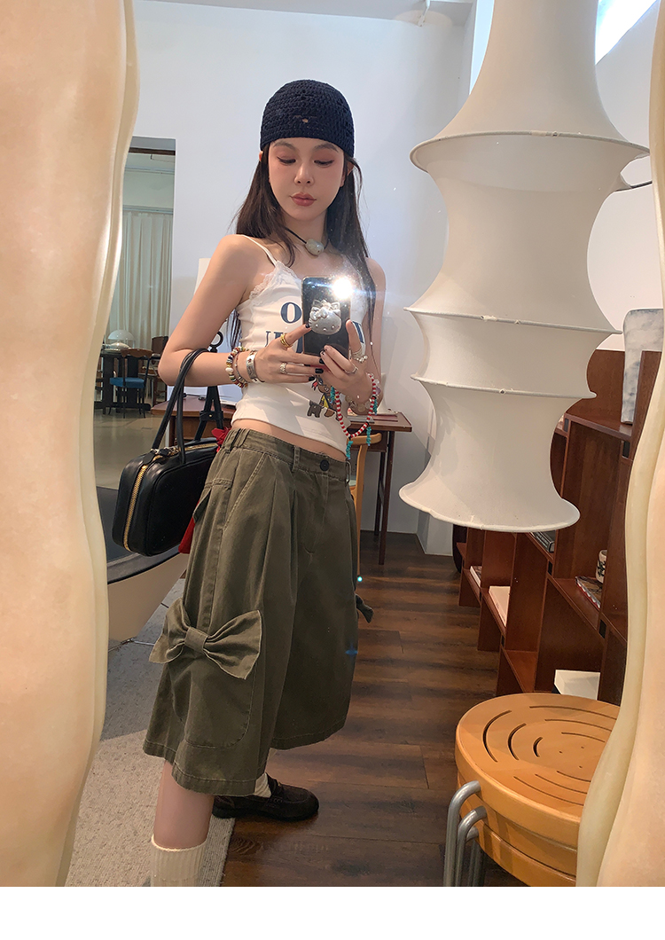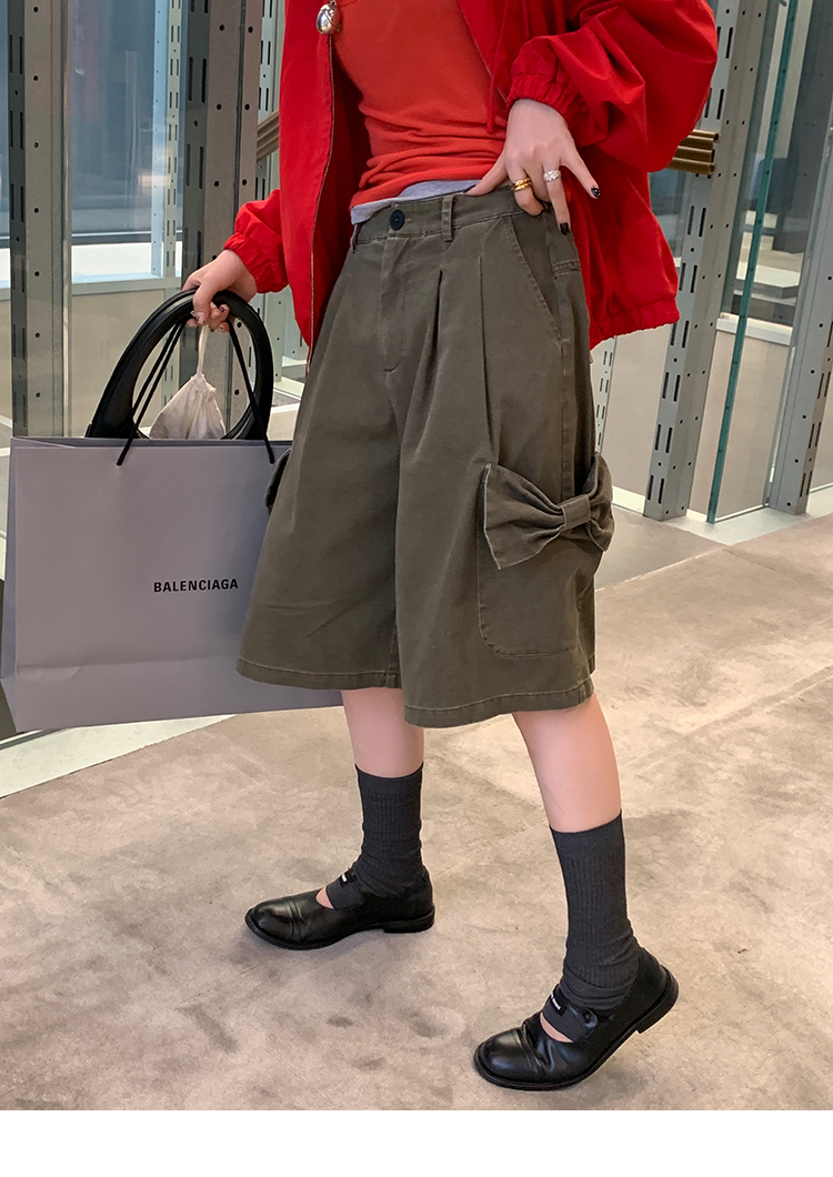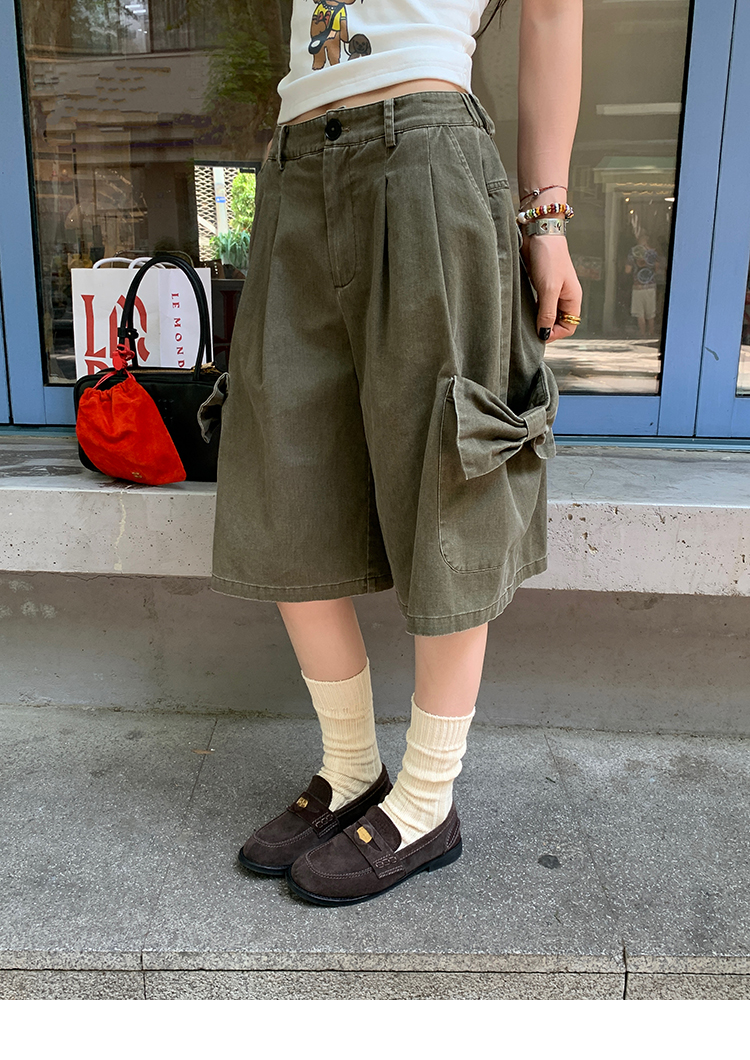 LRIB blogger distressed washed army green bow pocket wide-leg pants