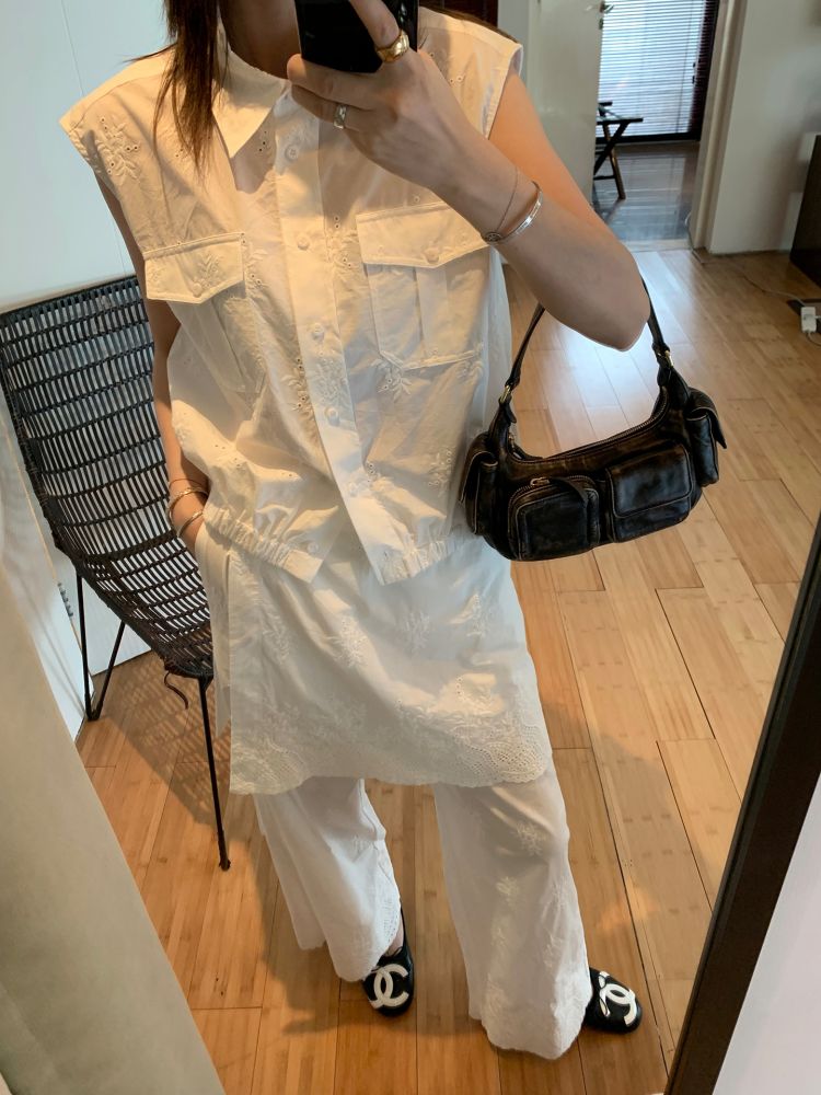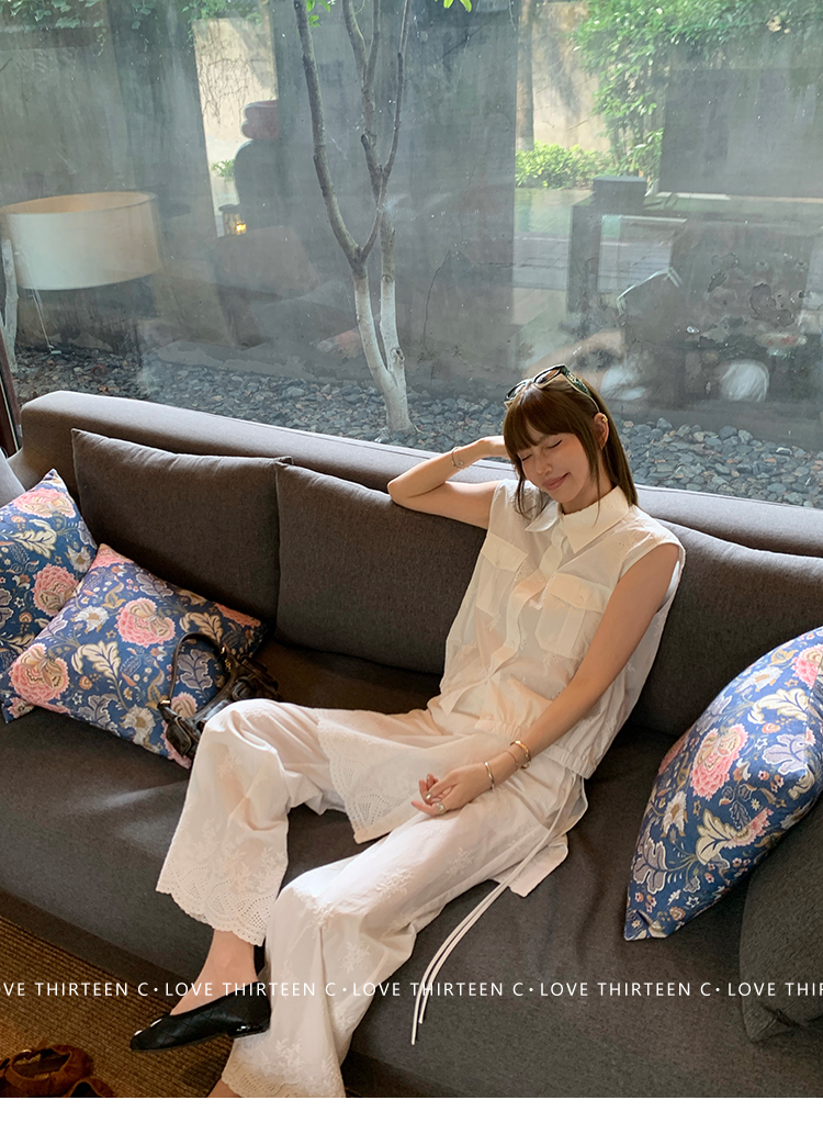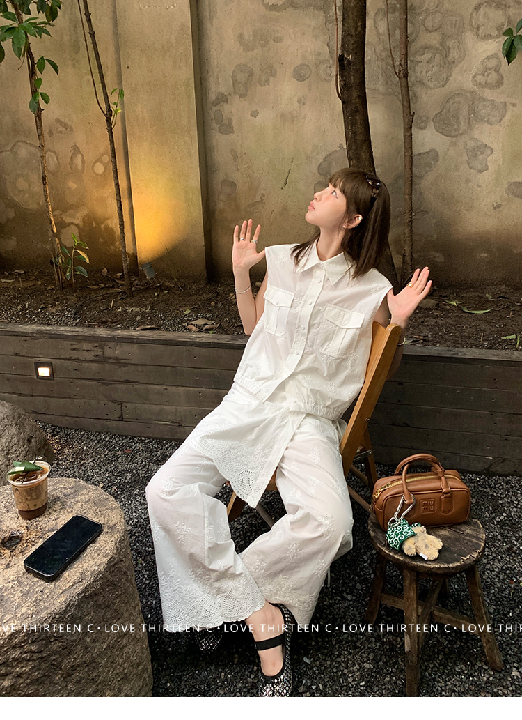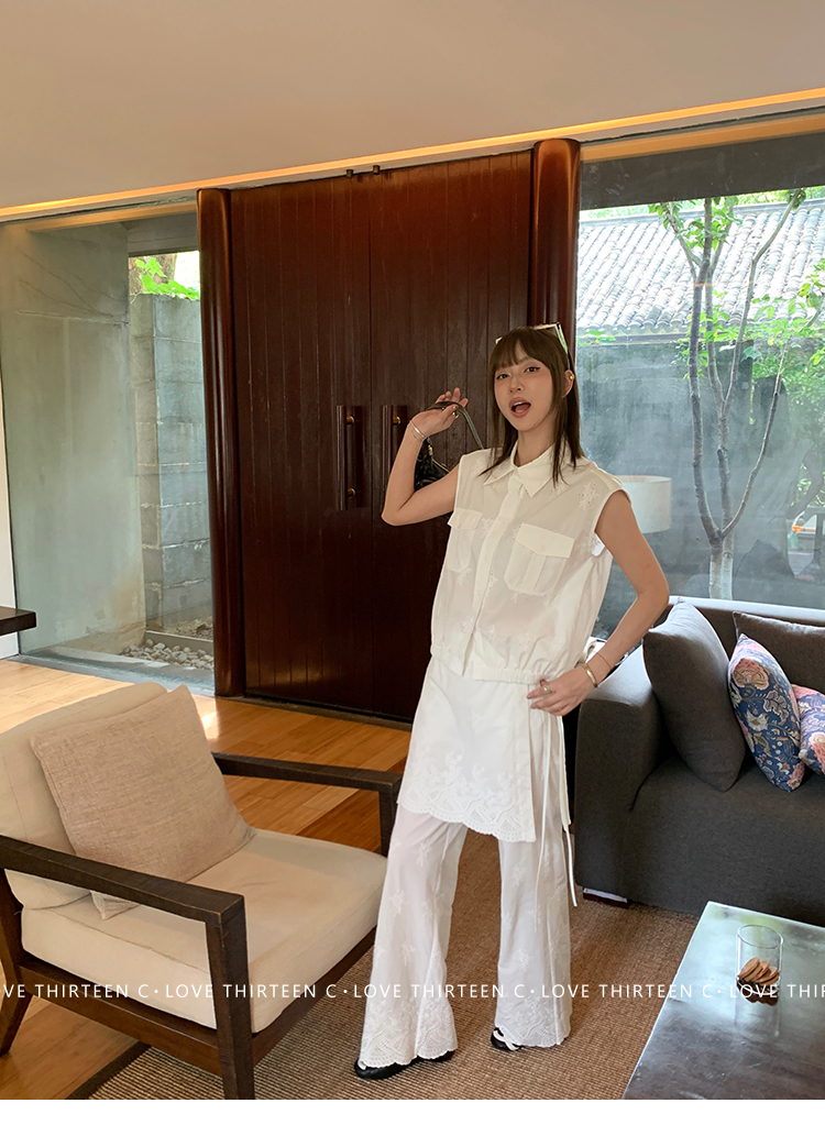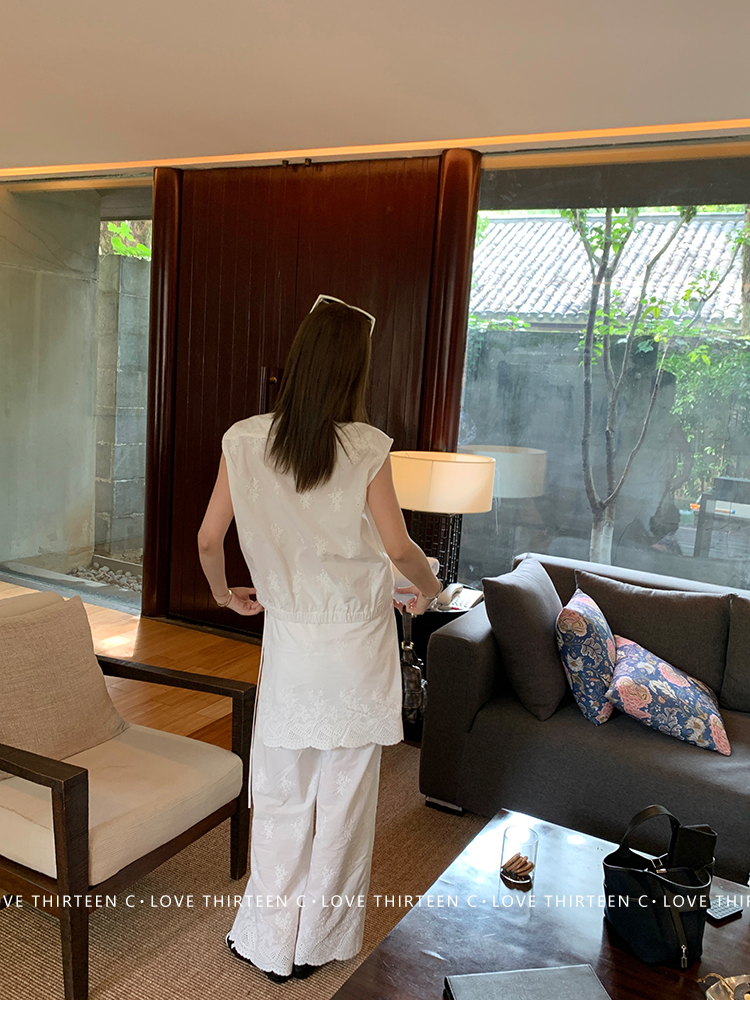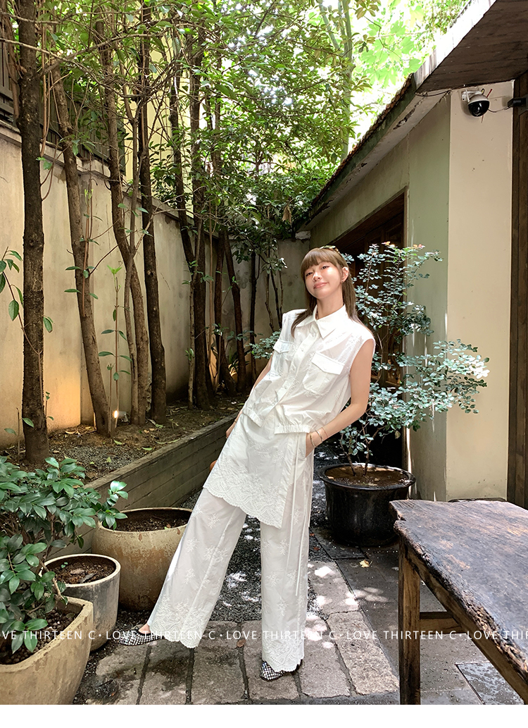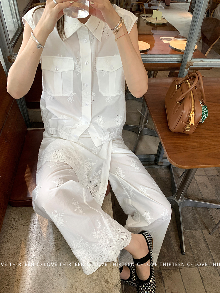 TC allwhite cotton embroidered work sleeveless shirt + curtain pants set