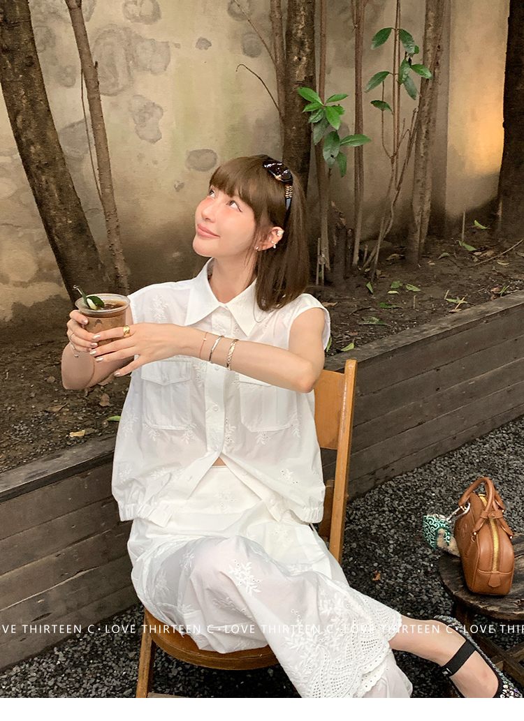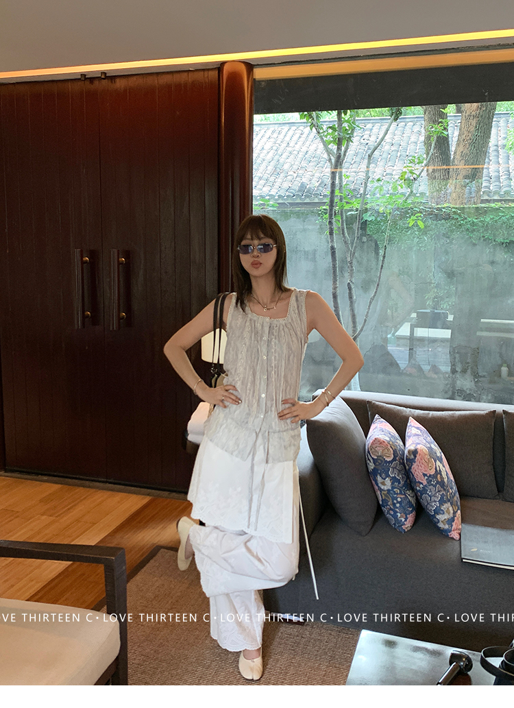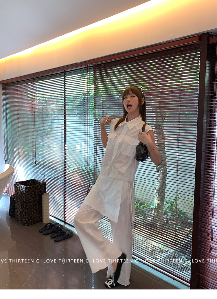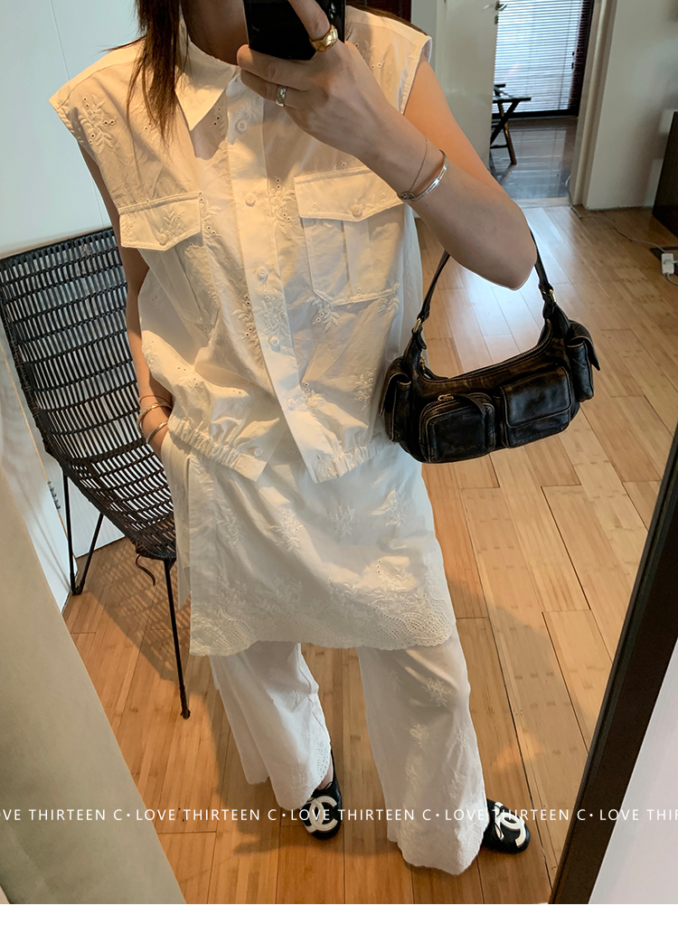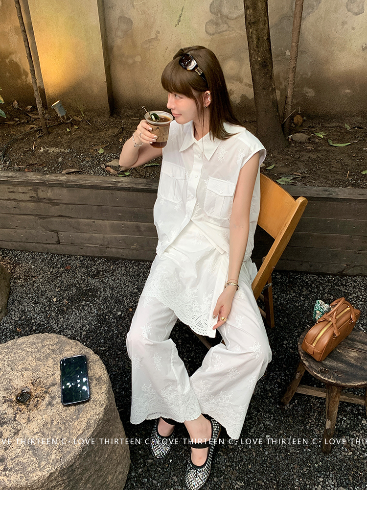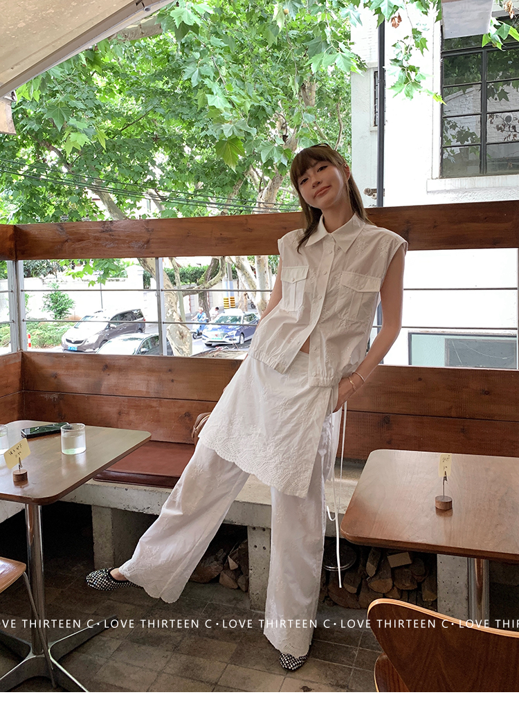 TC allwhite cotton embroidered work sleeveless shirt + curtain pants set