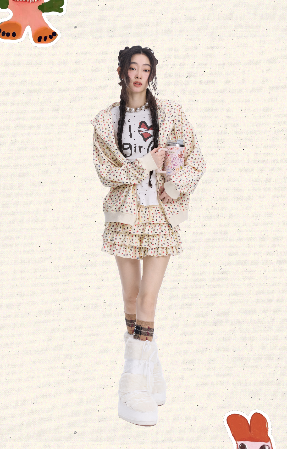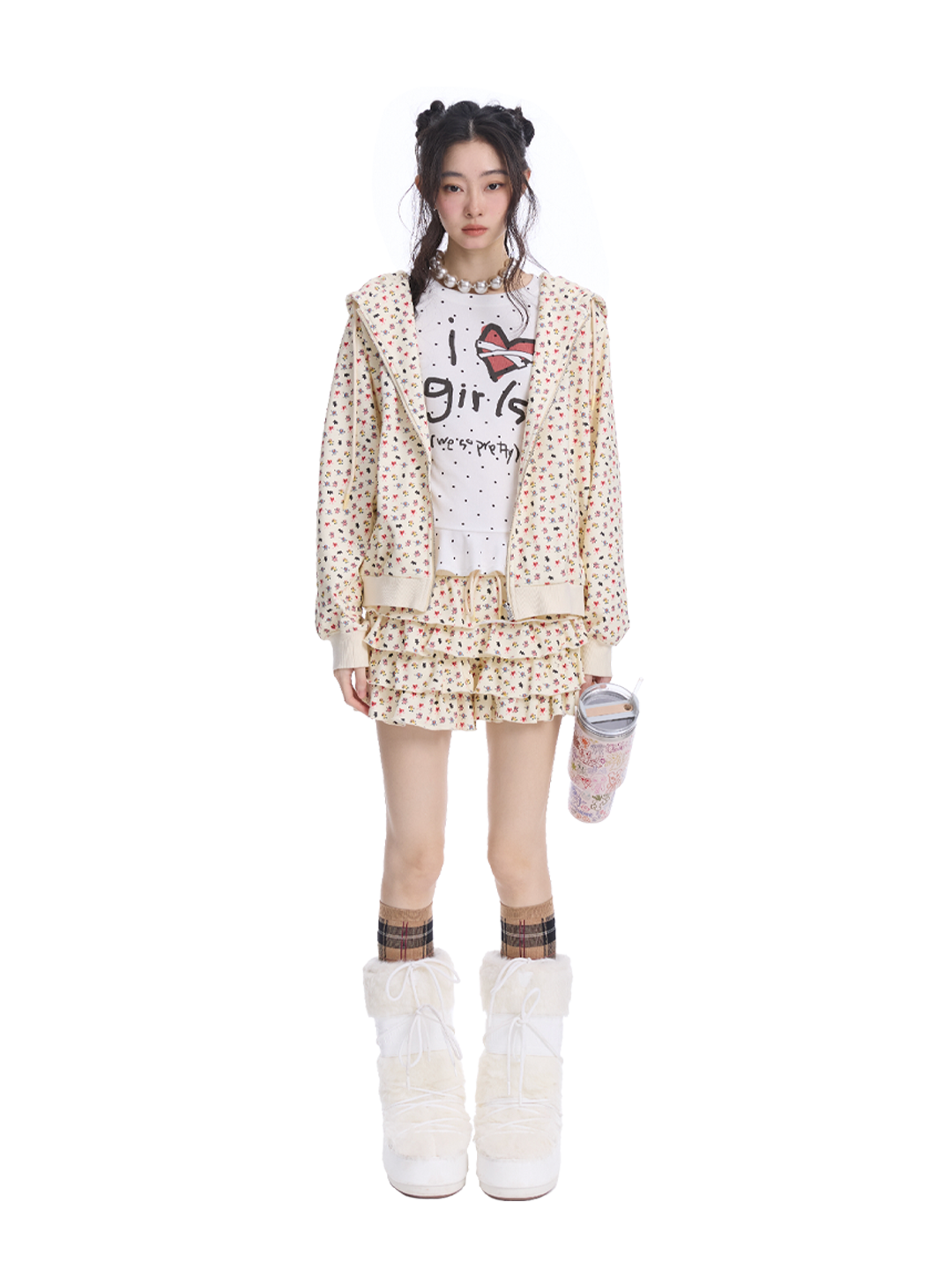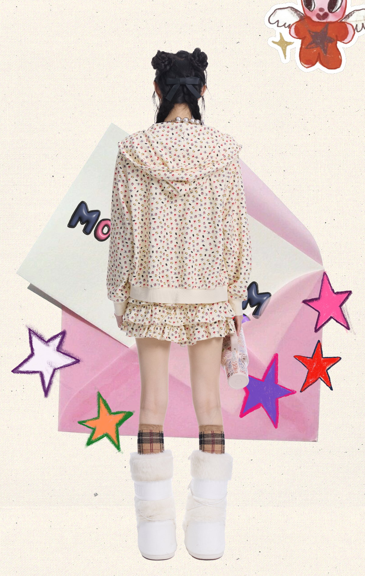MOF Beige Floral Sweatshirt Cardigan Shorts Set