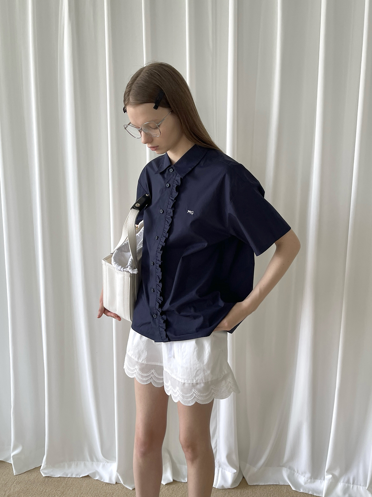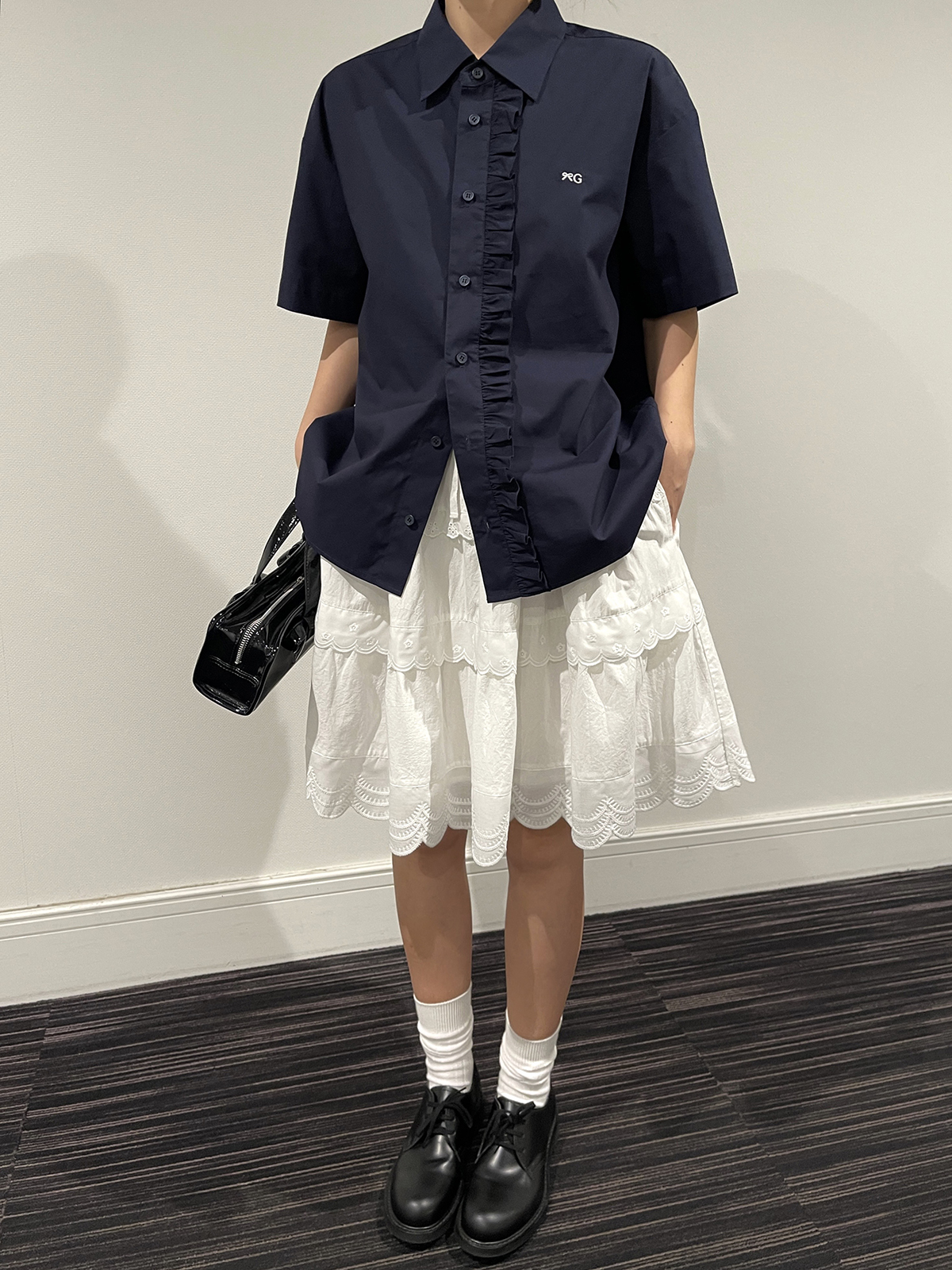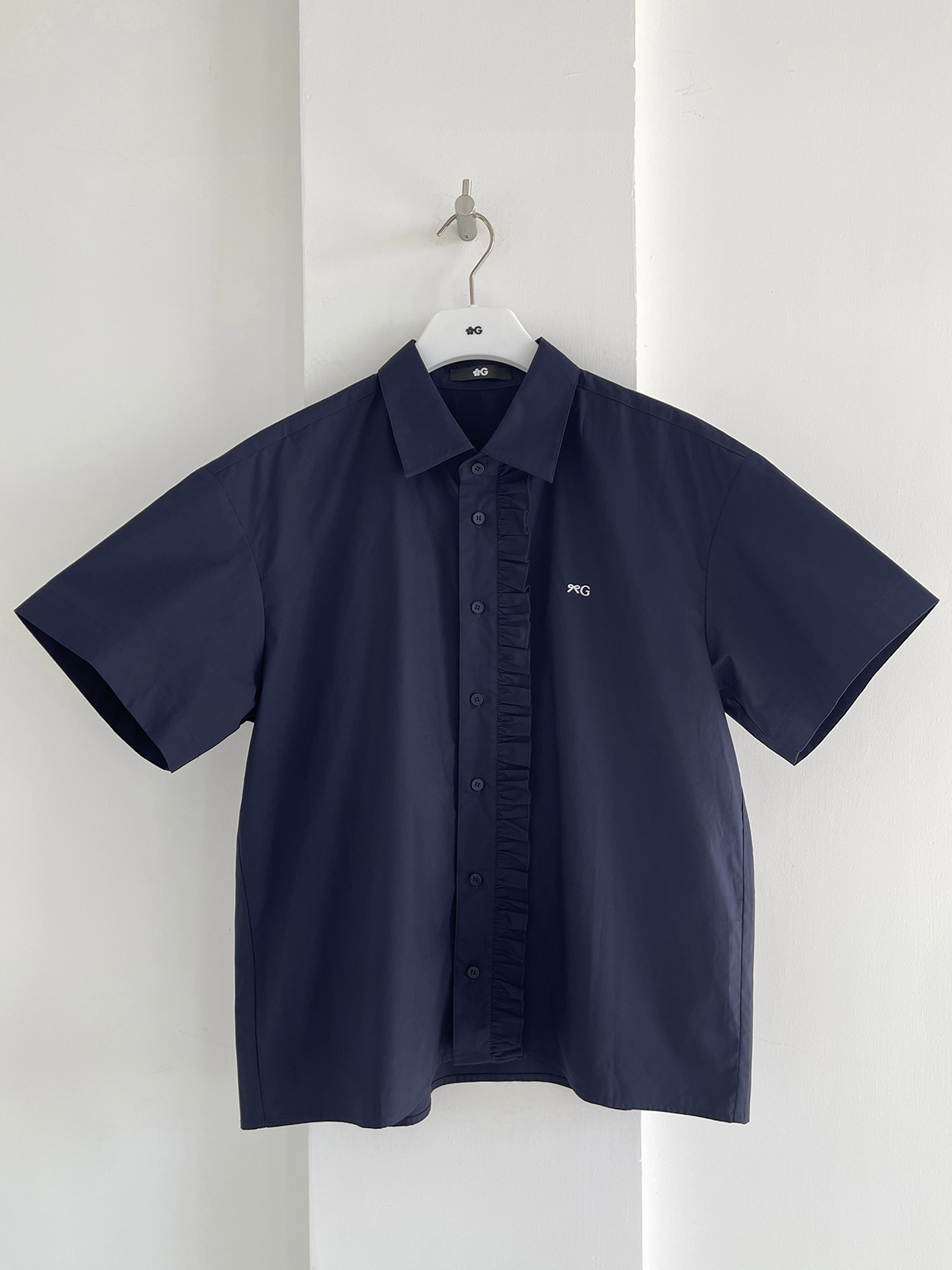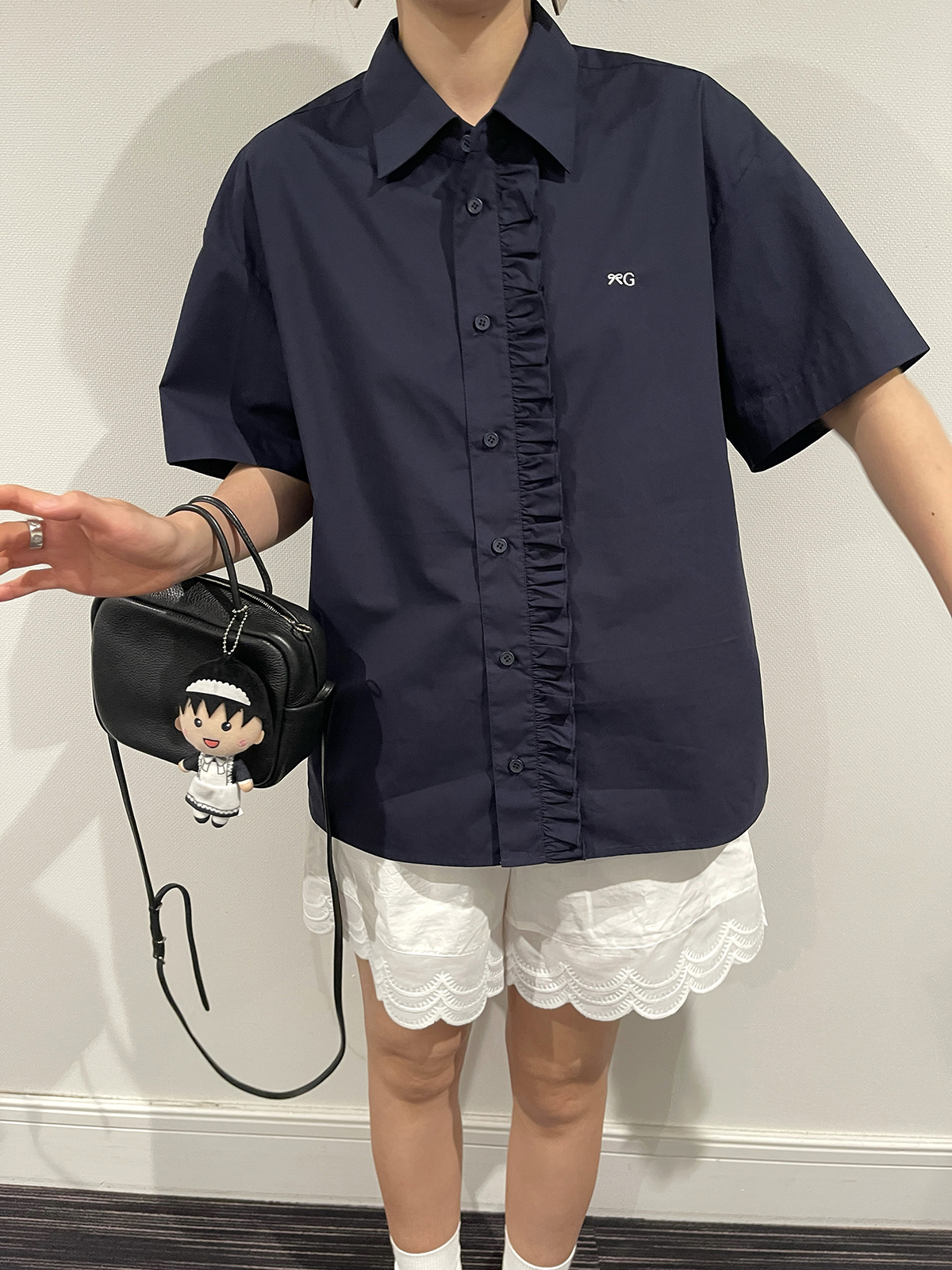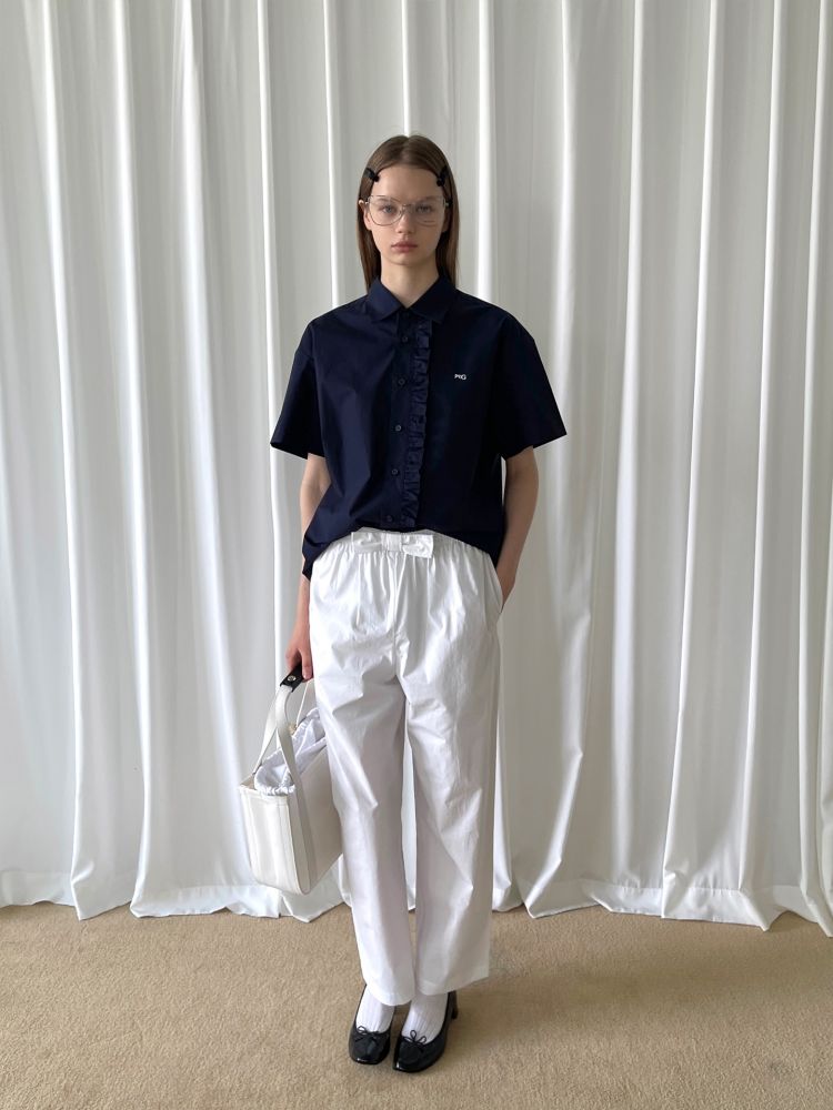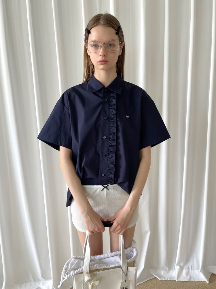 PFF GIRL navy blue lace front loose short-sleeved shirt