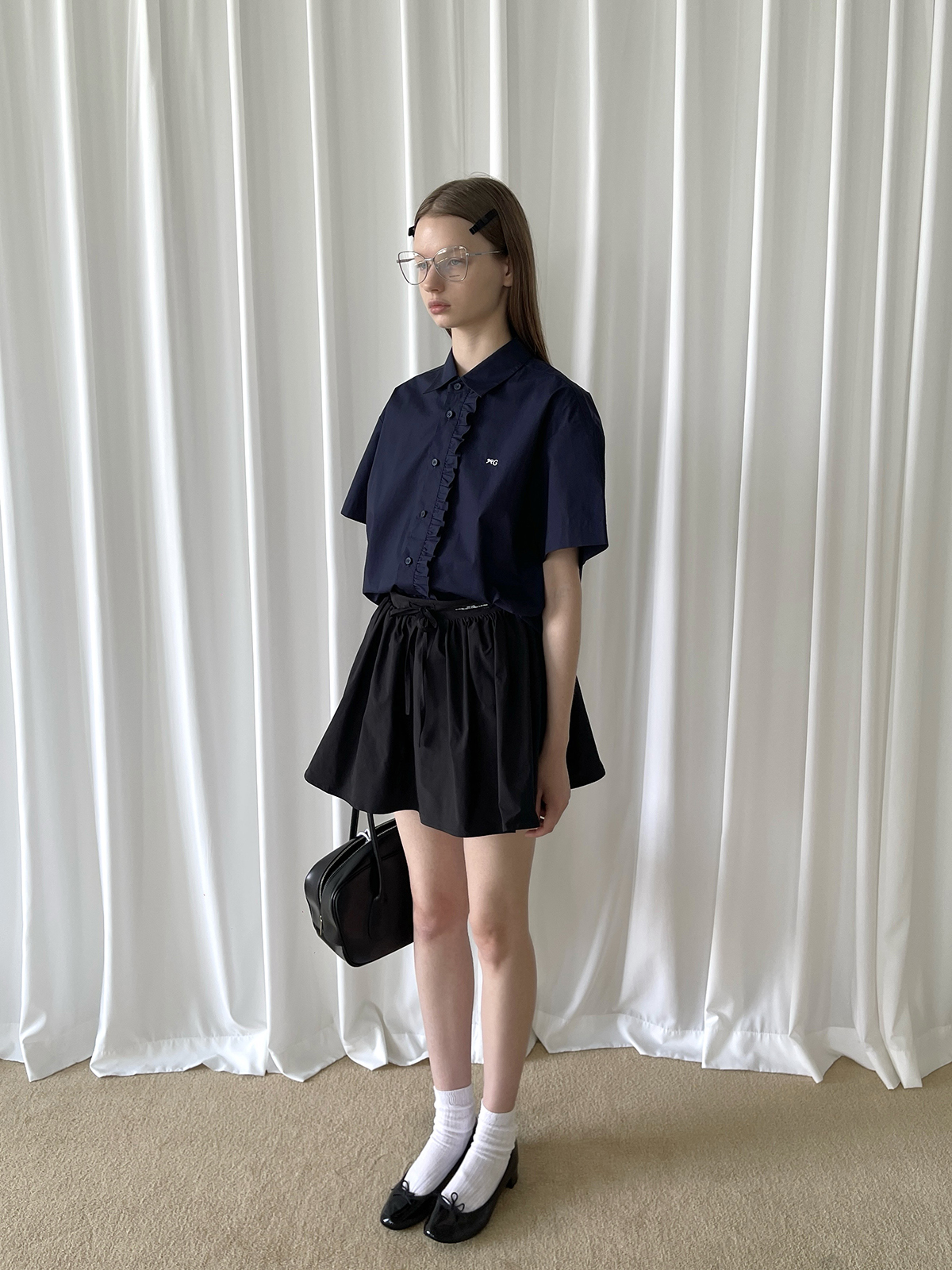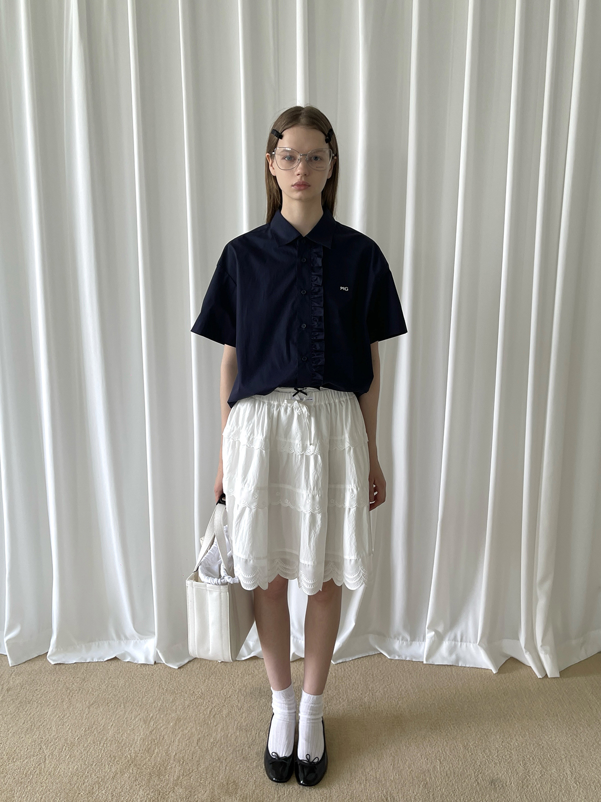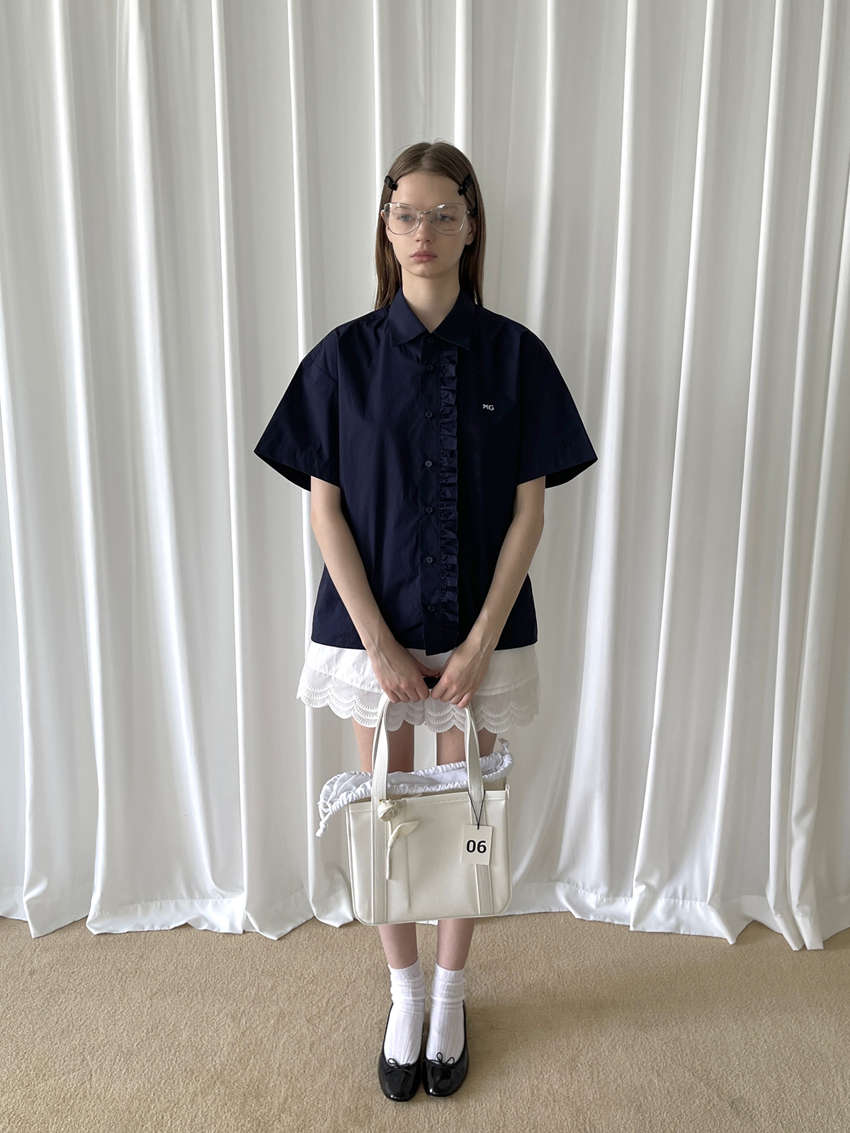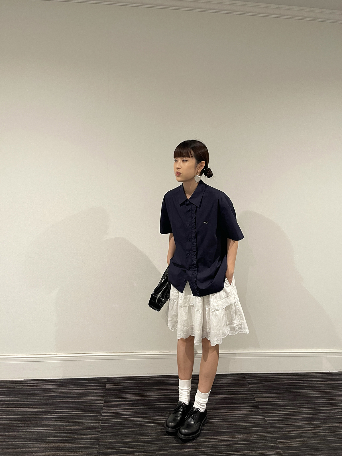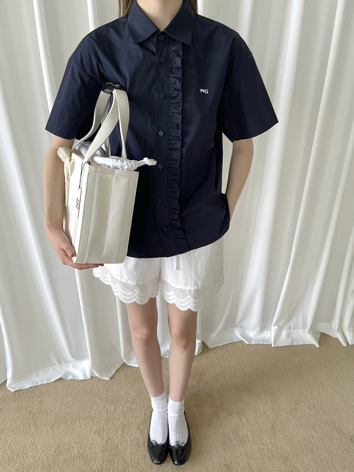 PFF GIRL navy blue lace front loose short-sleeved shirt