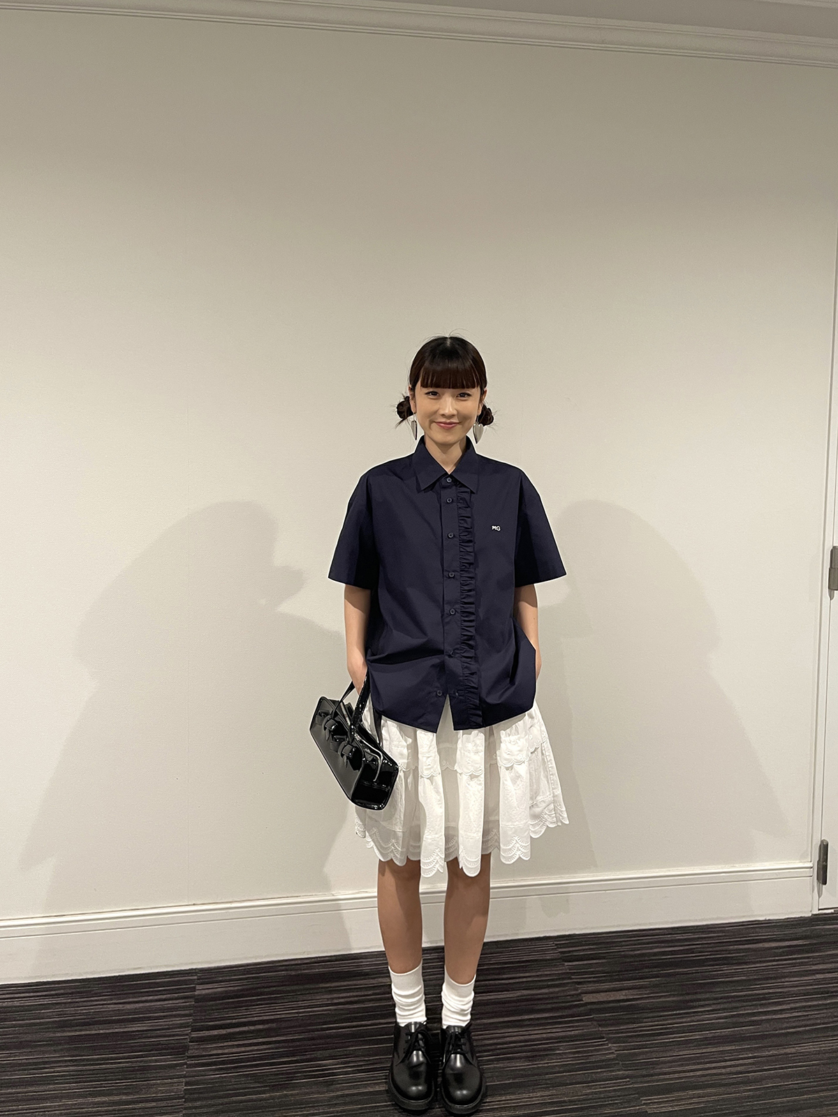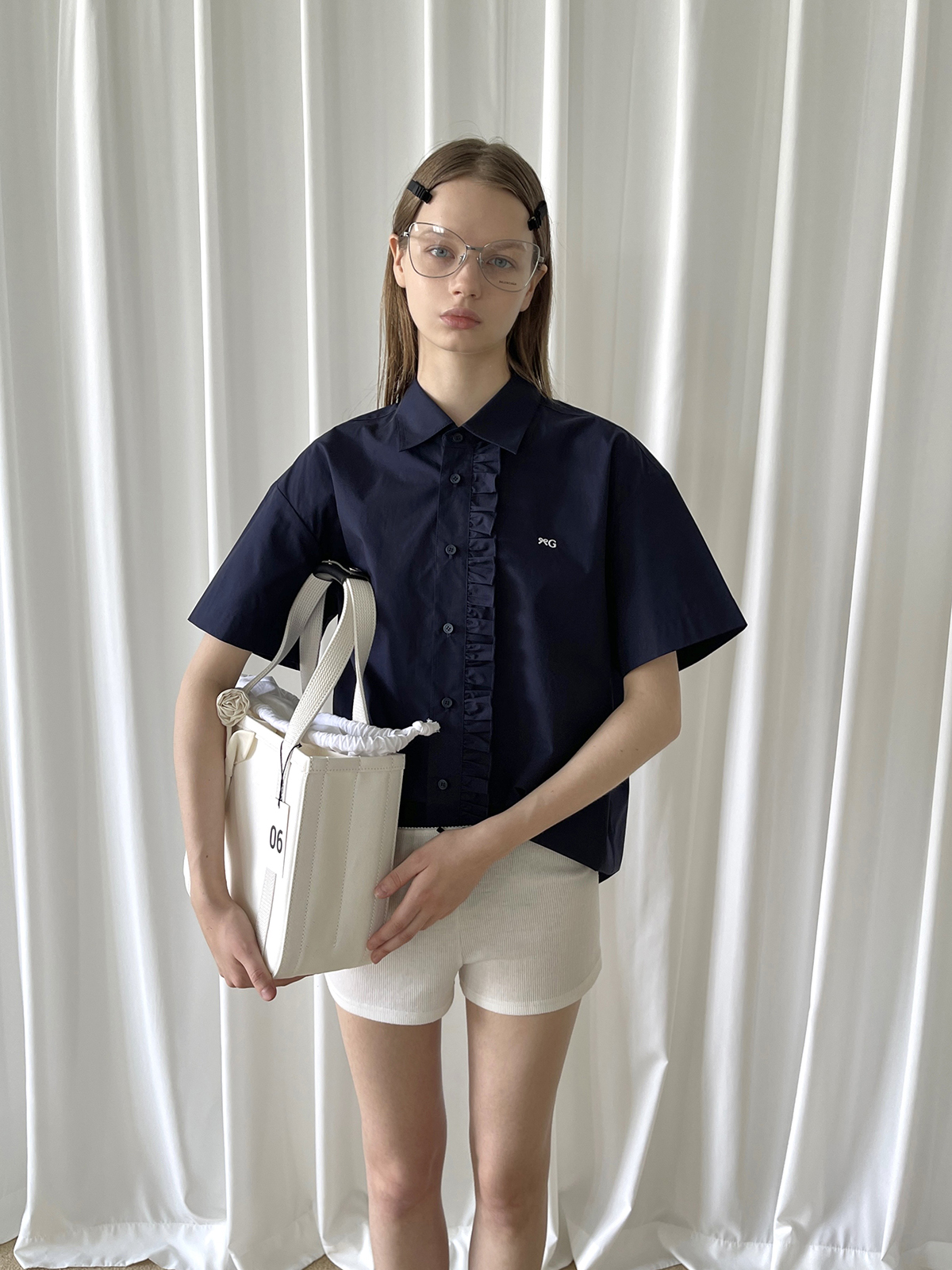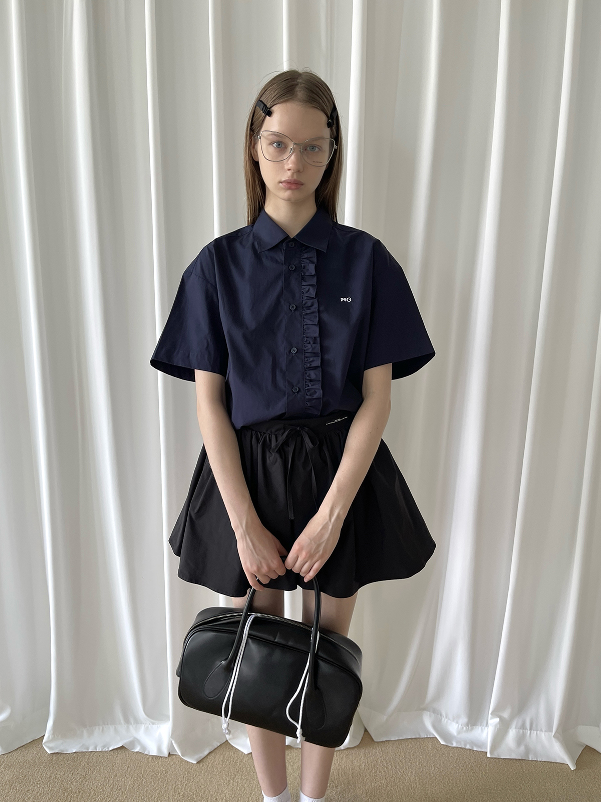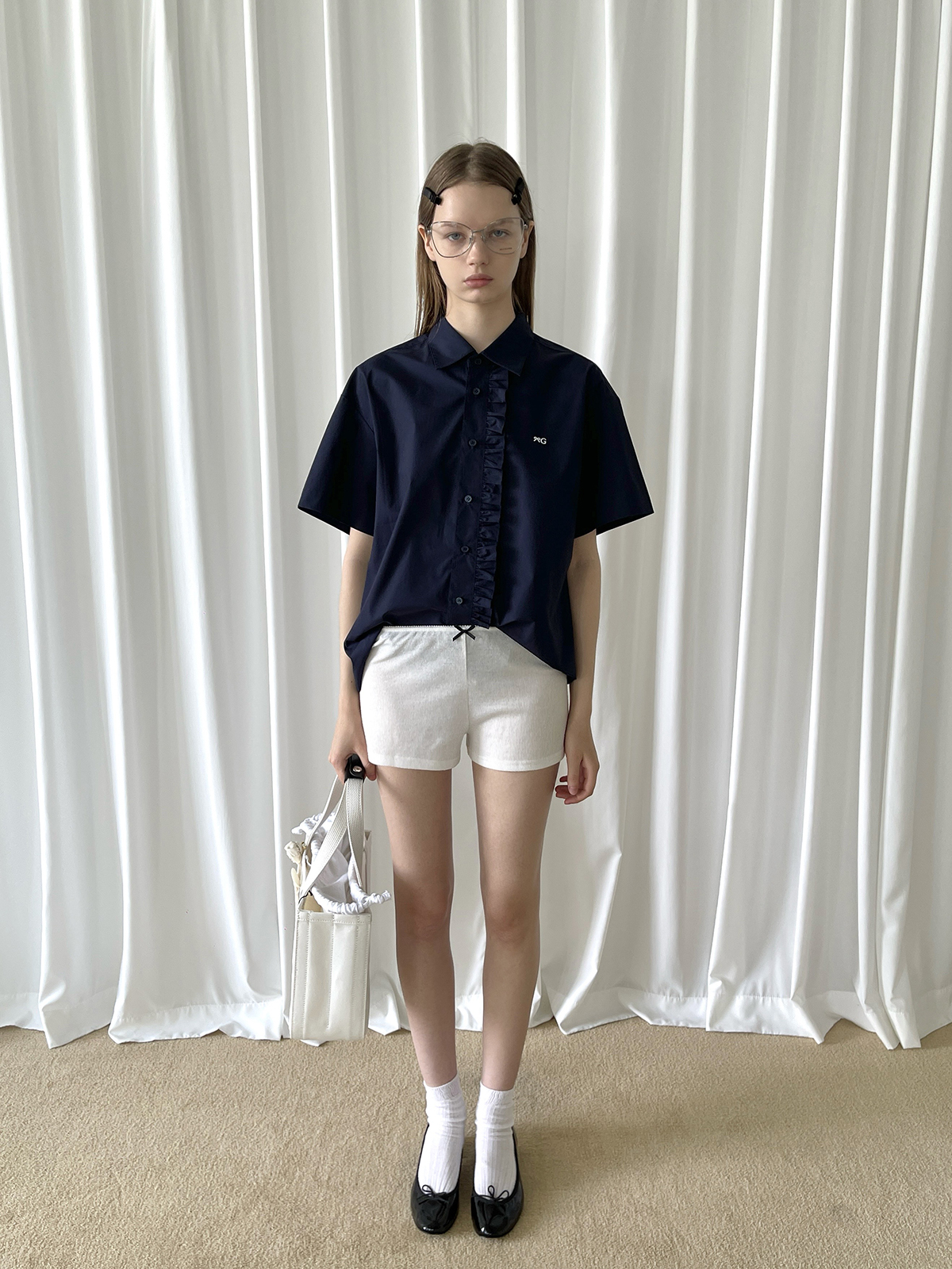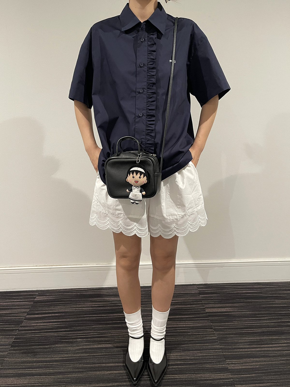 PFF GIRL navy blue lace front loose short-sleeved shirt