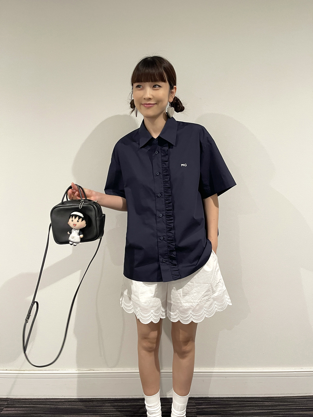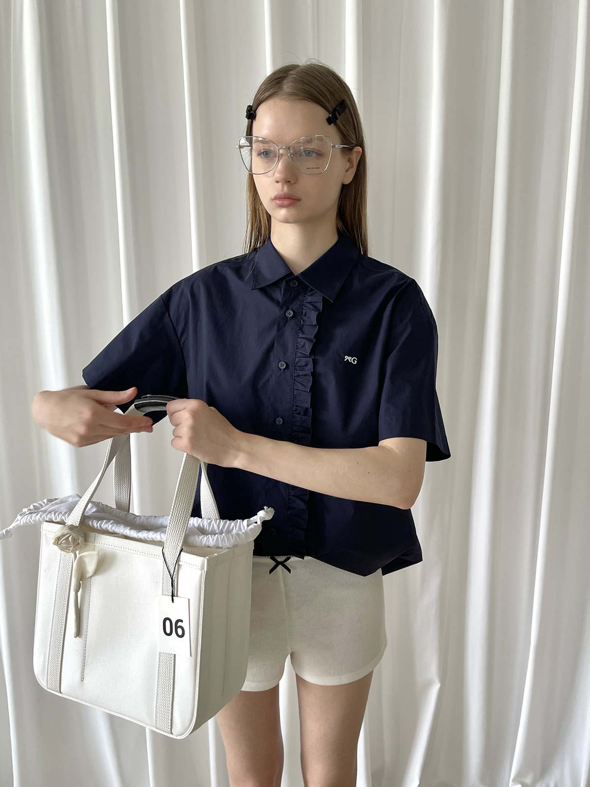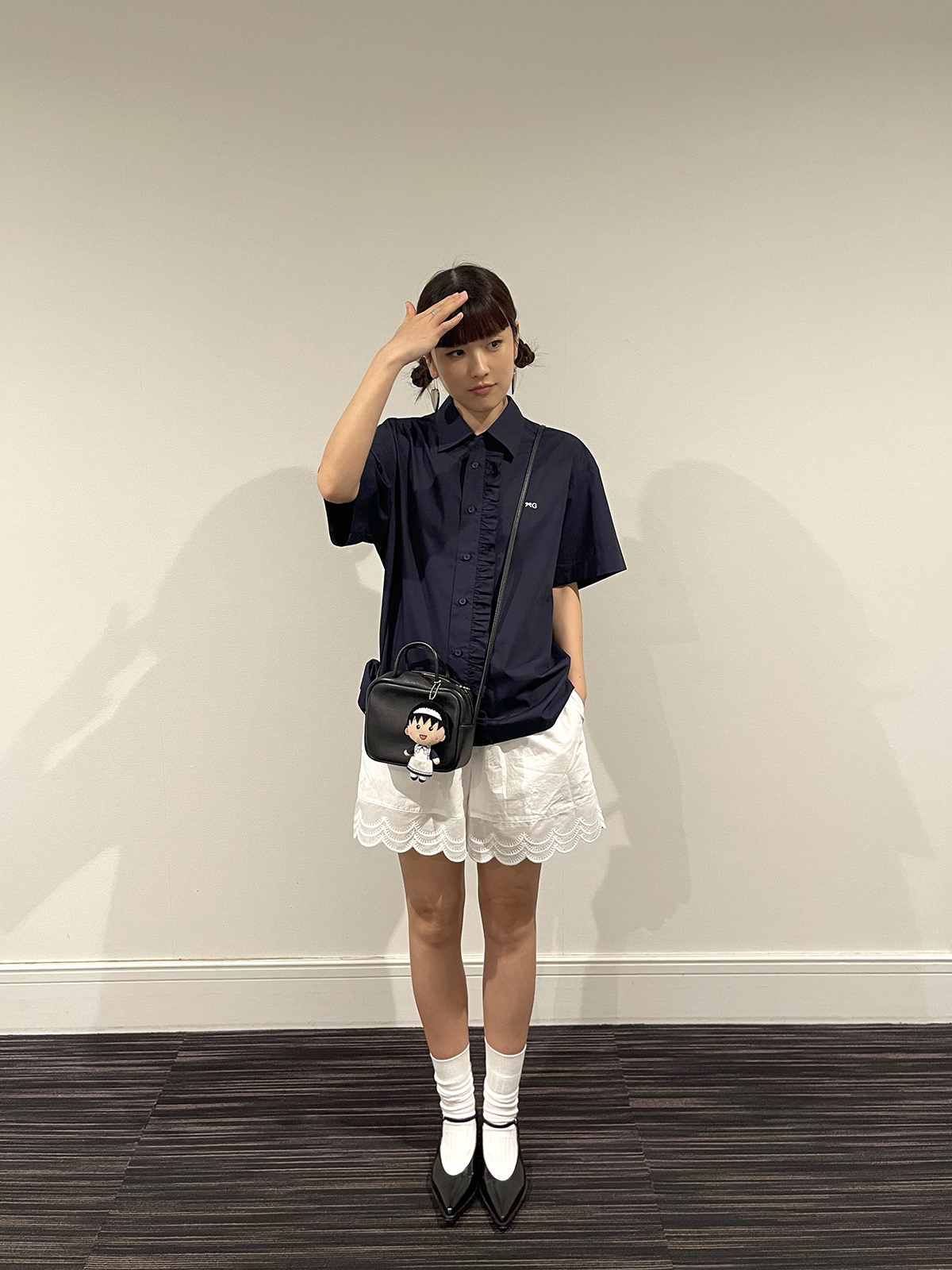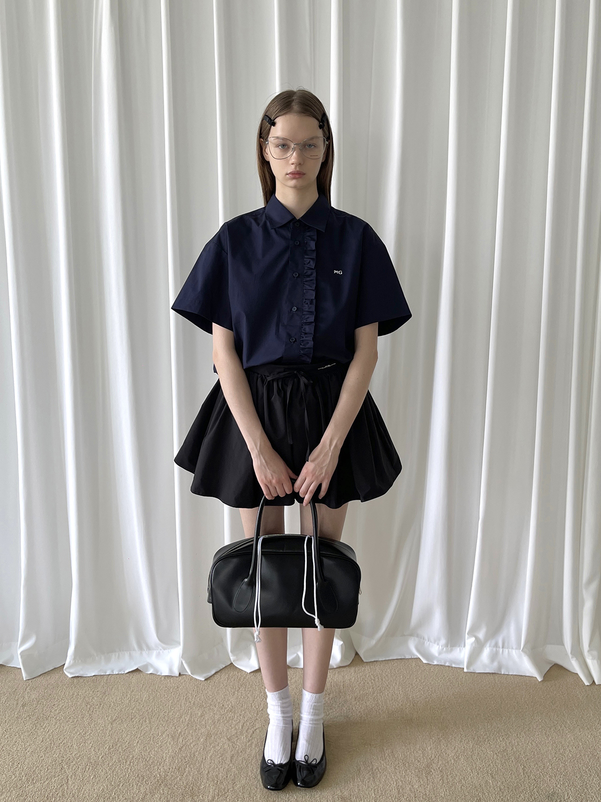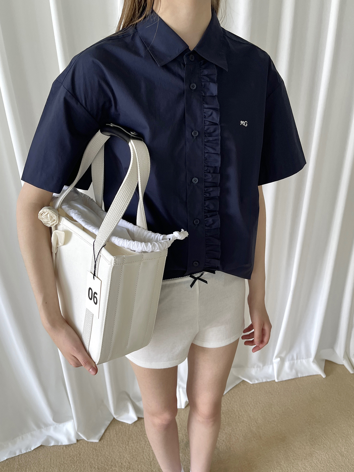 PFF GIRL navy blue lace front loose short-sleeved shirt