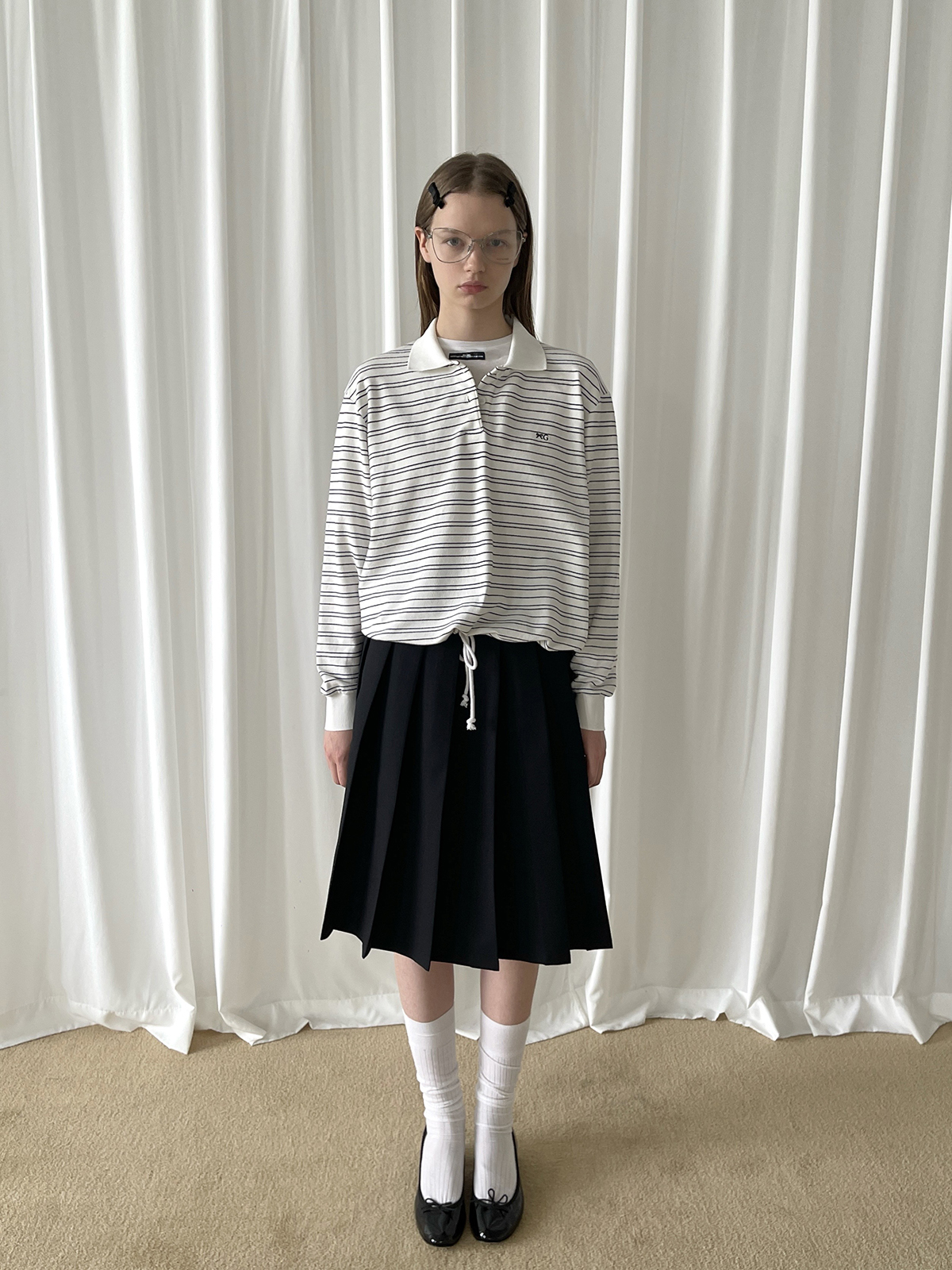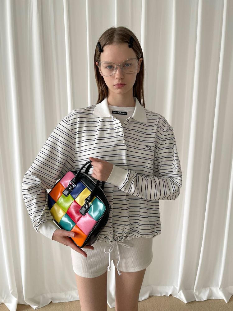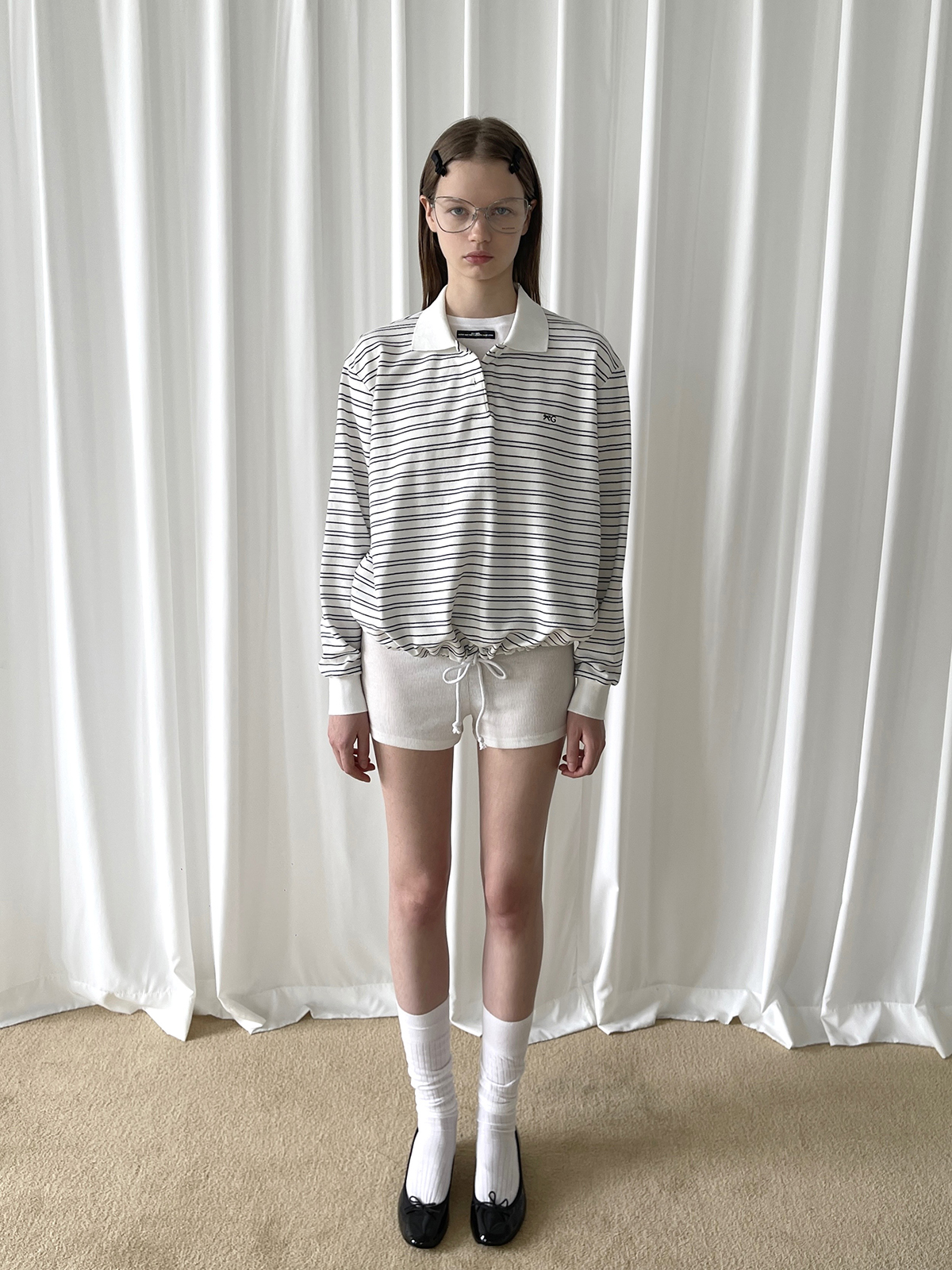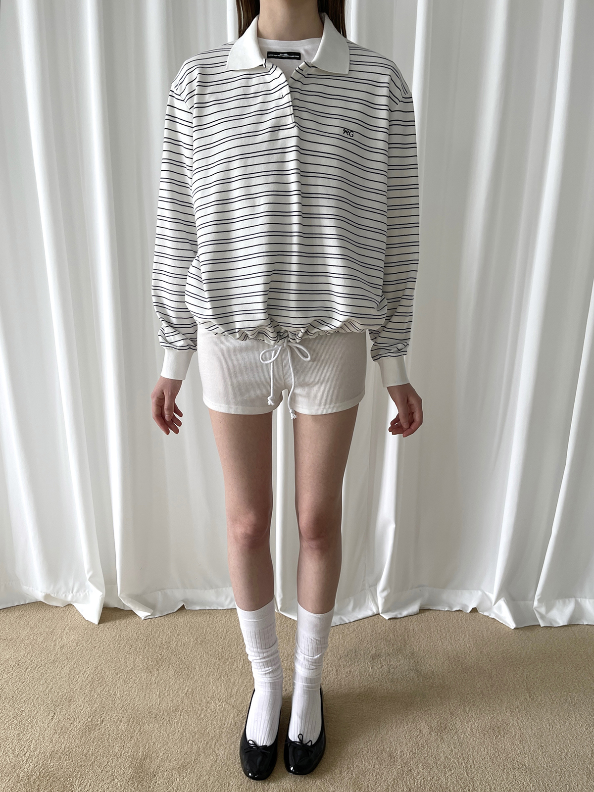 PFF GIRL white pinstriped hem drawstring long-sleeved POLO shirt