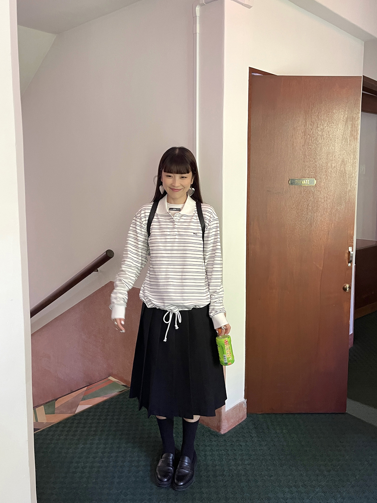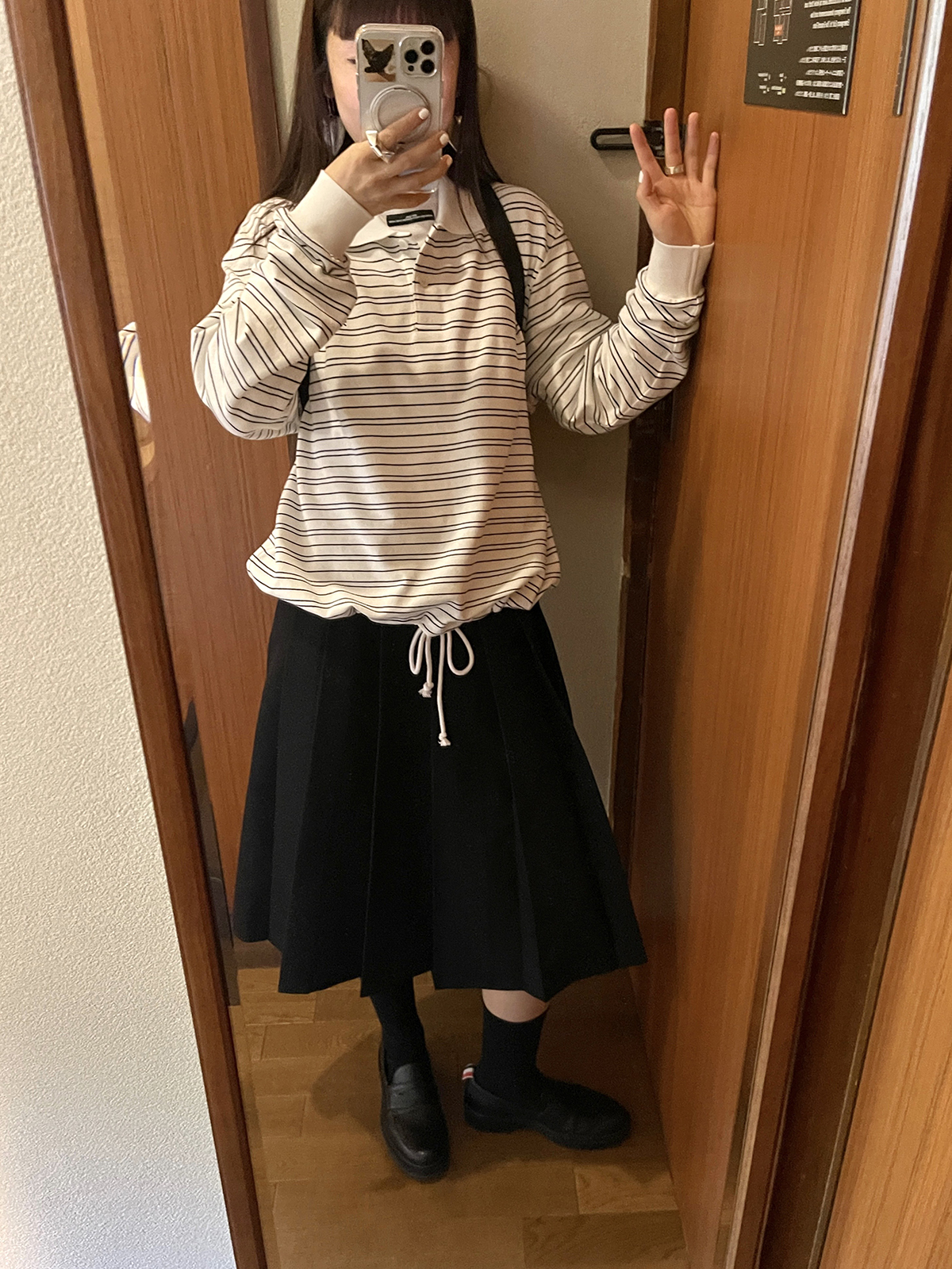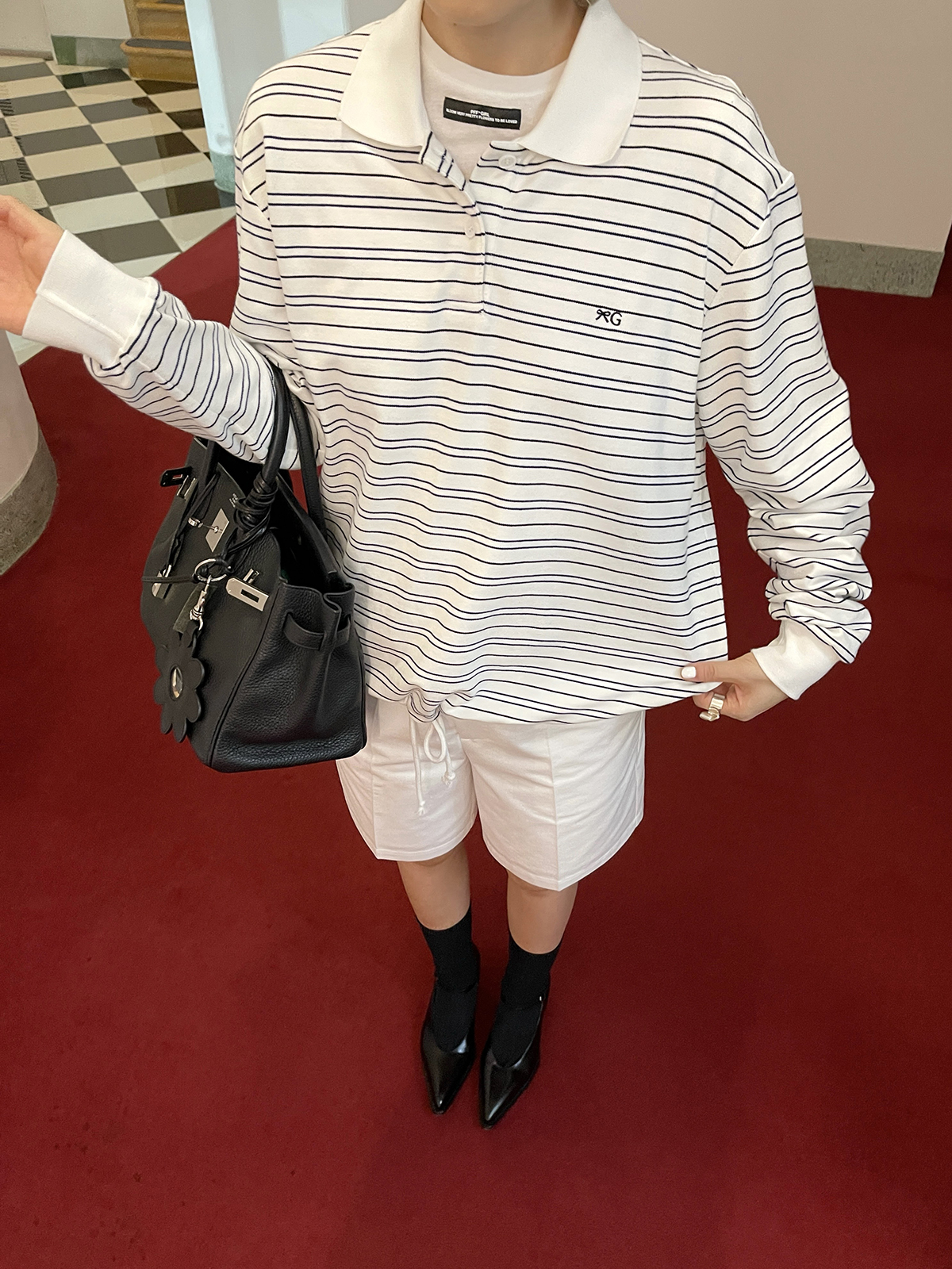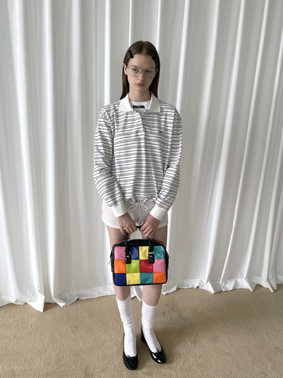 PFF GIRL white pinstriped hem drawstring long-sleeved POLO shirt
