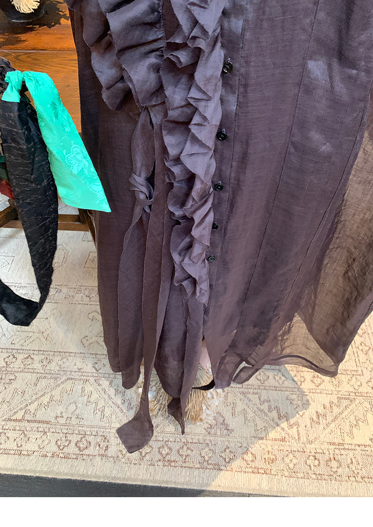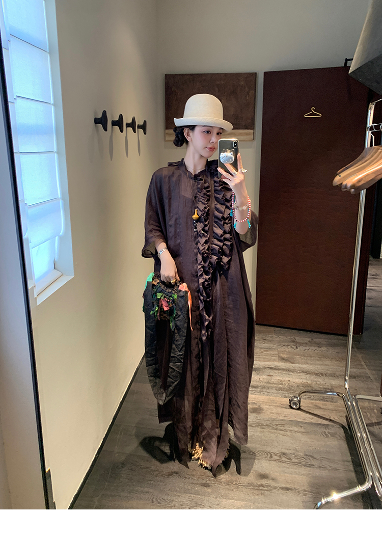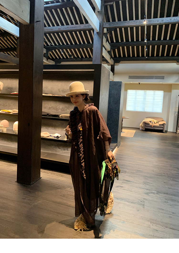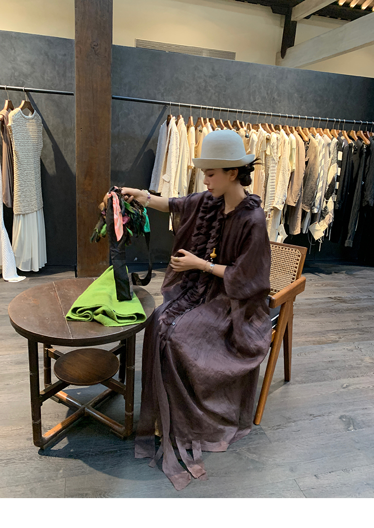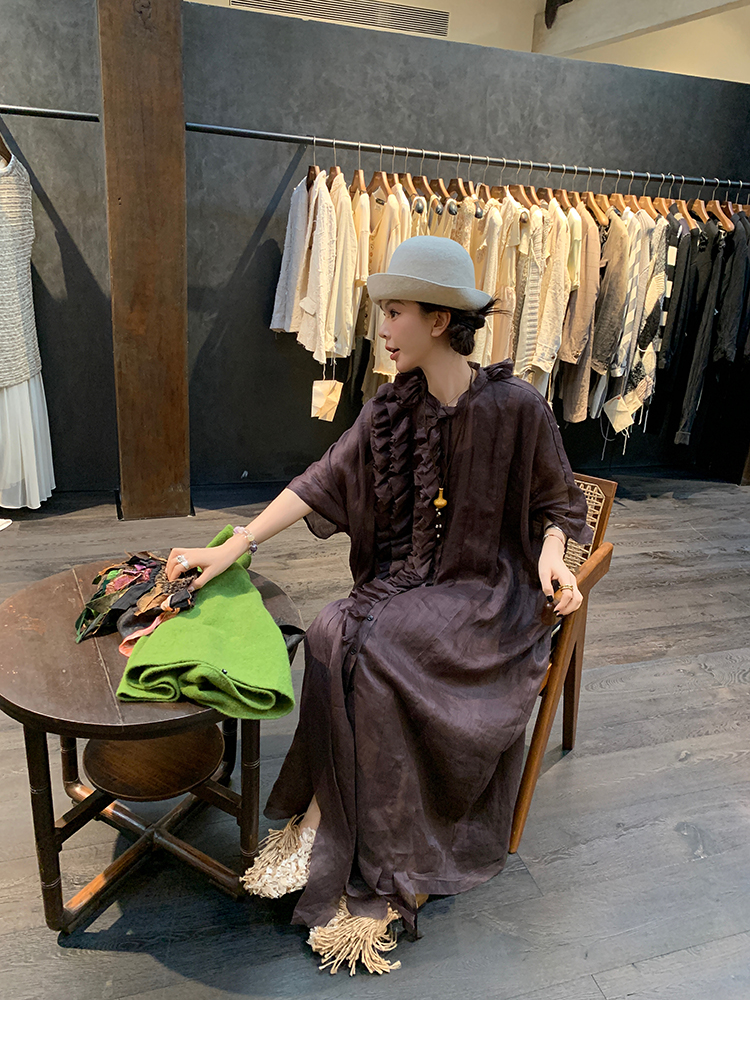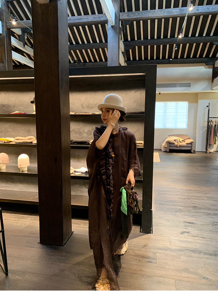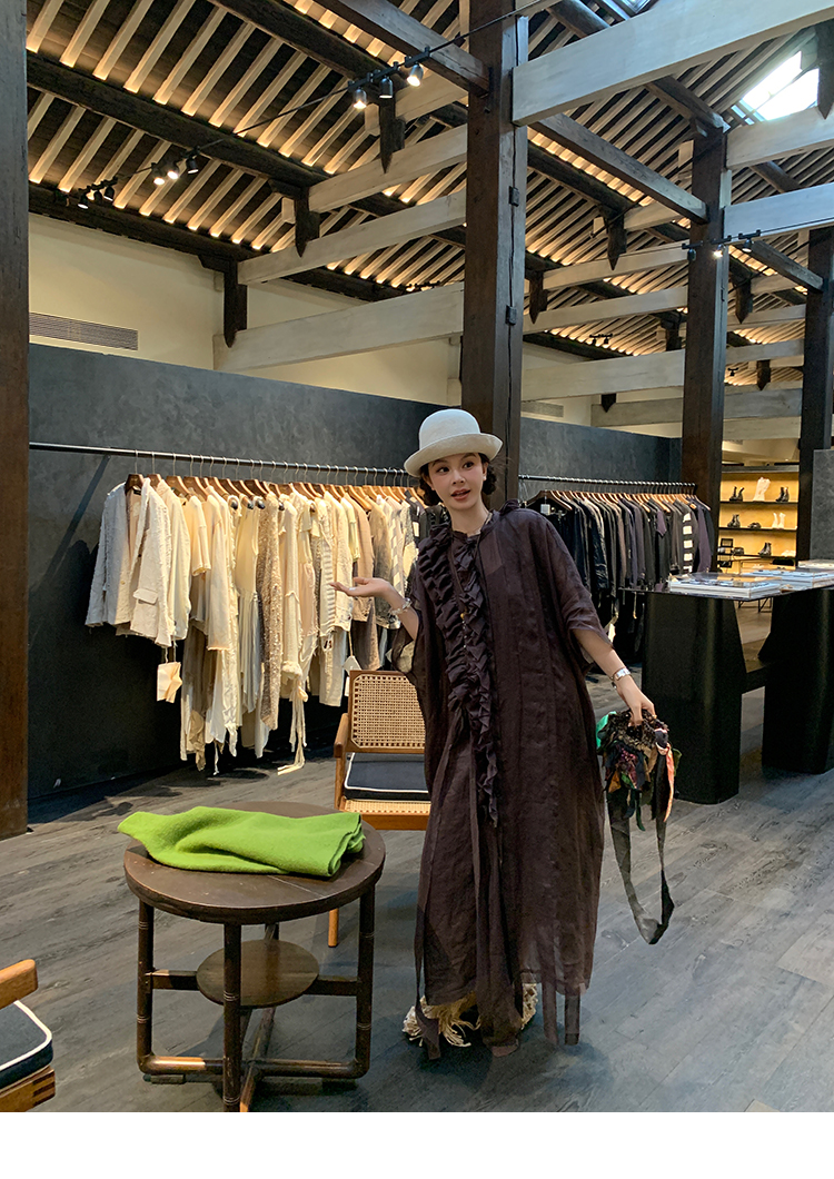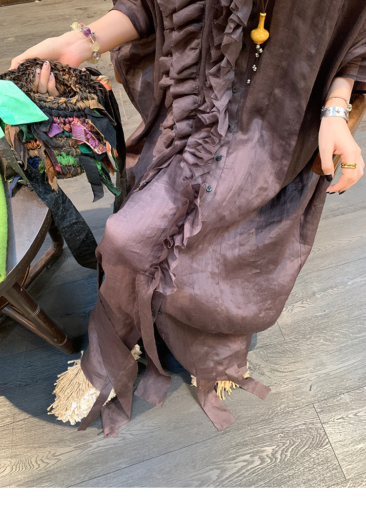 LRIB all-ramie multi-layered pleated lace withered ribbon cape dress