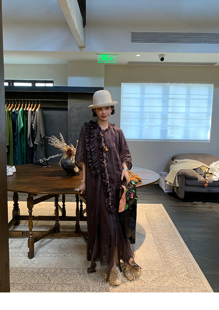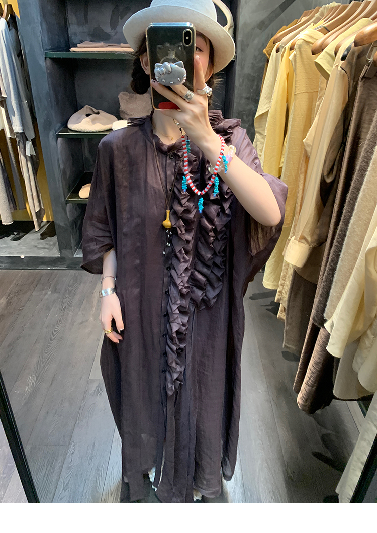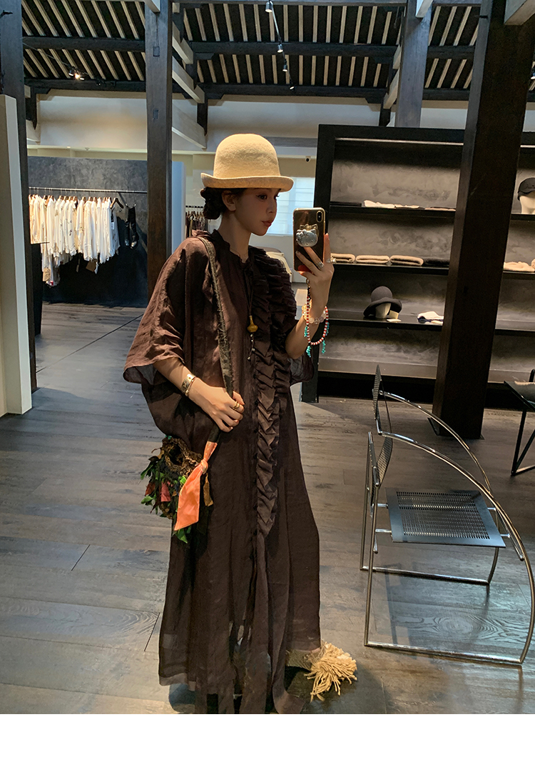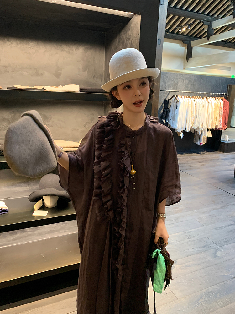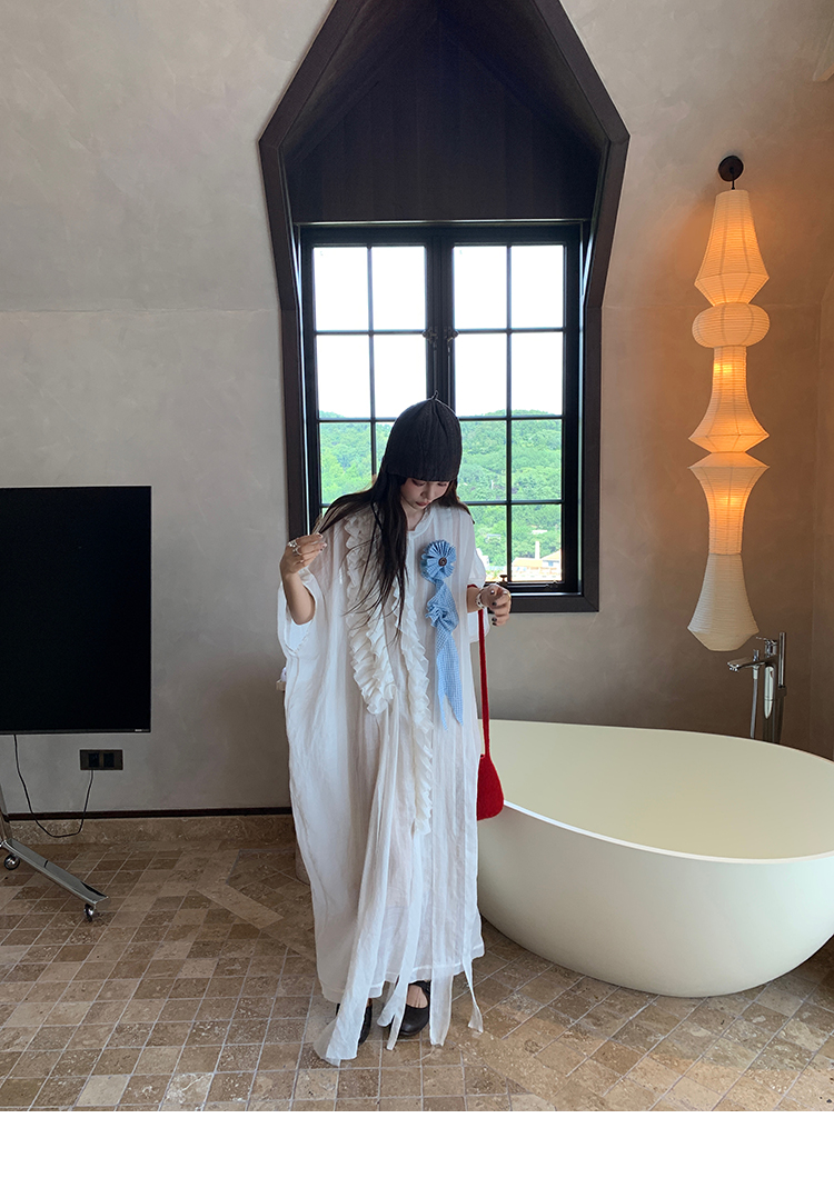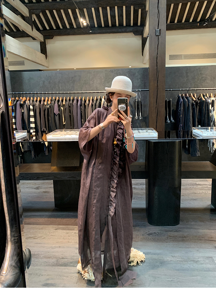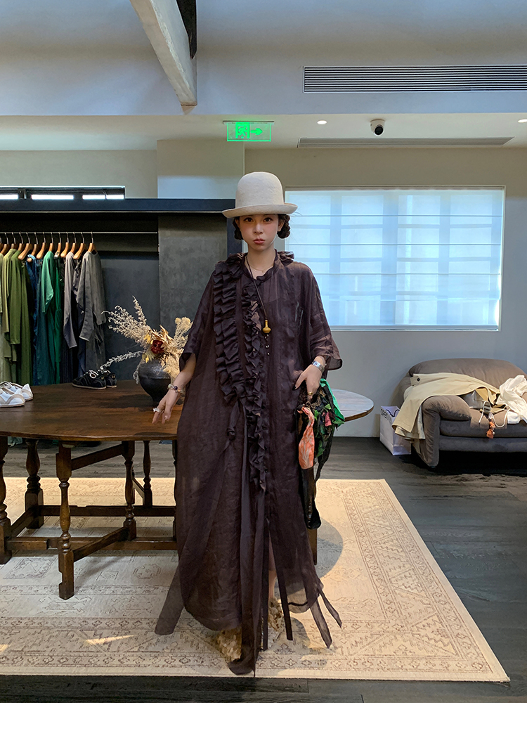 LRIB all-ramie multi-layered pleated lace withered ribbon cape dress