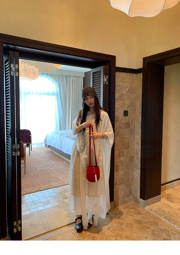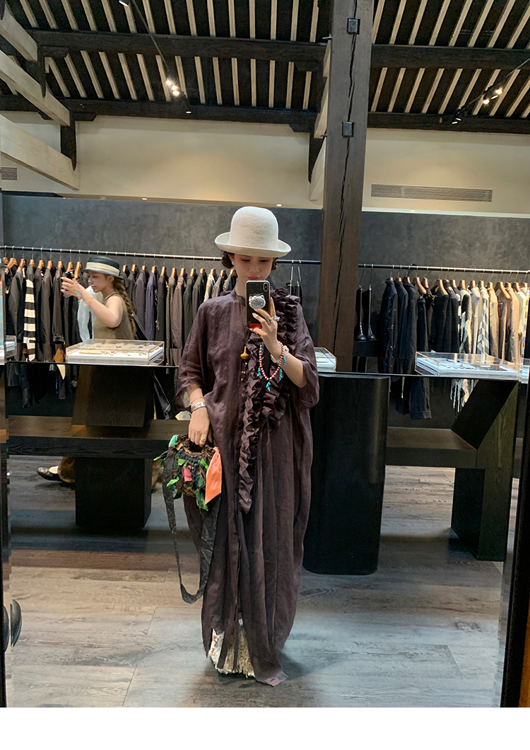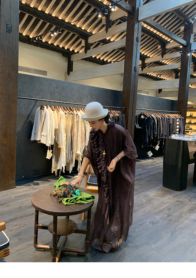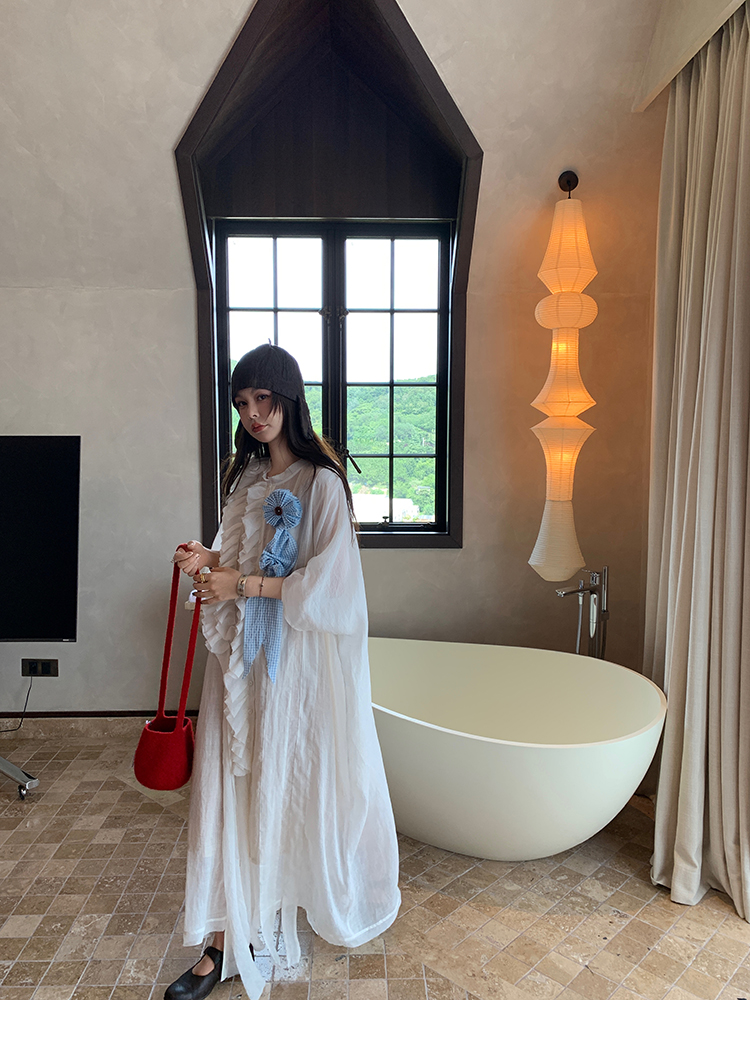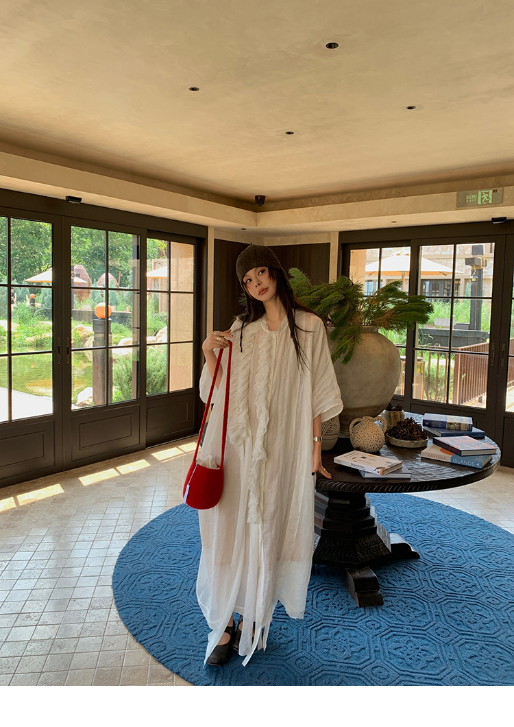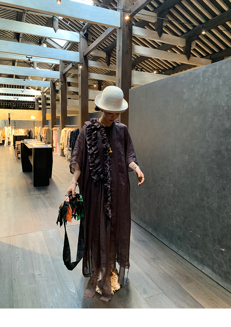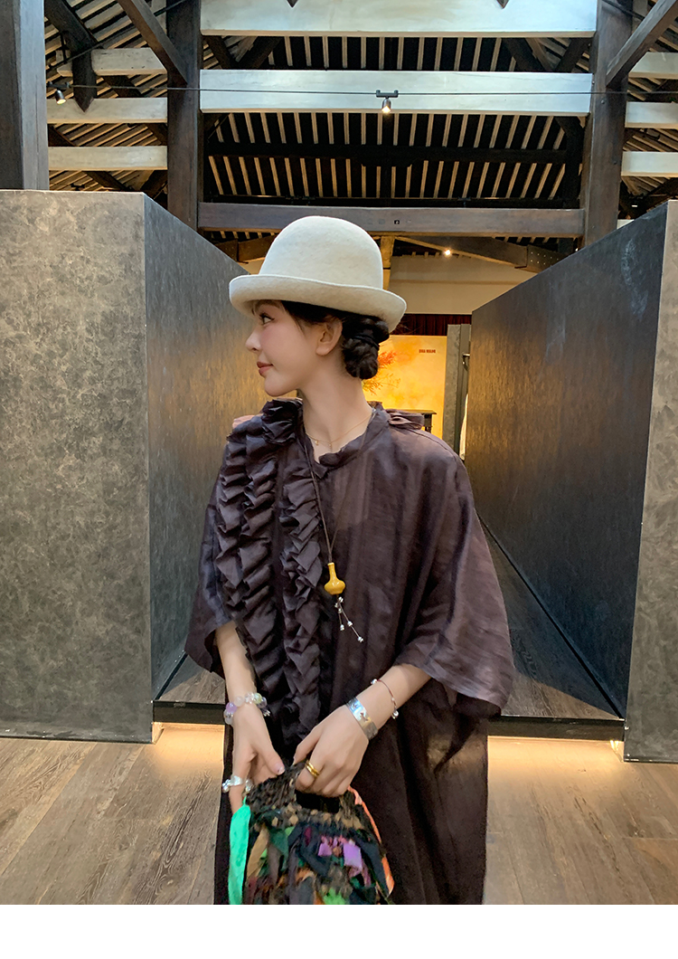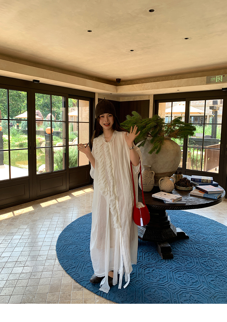 LRIB all-ramie multi-layered pleated lace withered ribbon cape dress