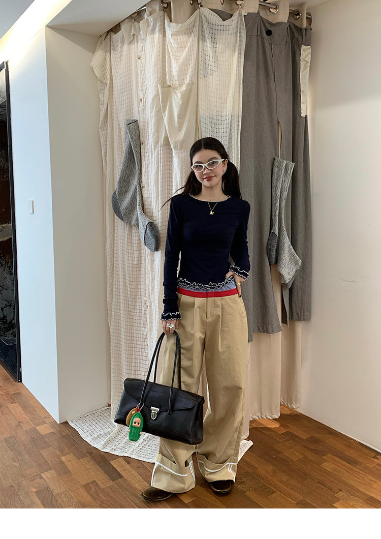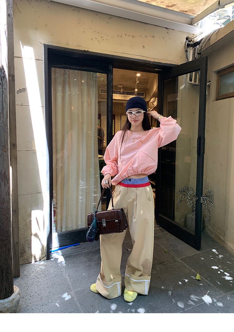 LRIB striped khaki splicing elastic double waistband cuffed casual pants