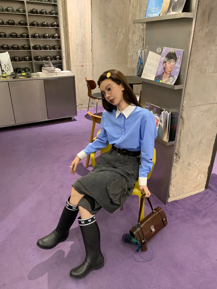 LRIB stitched blue and white lapel belt cut-off shirt