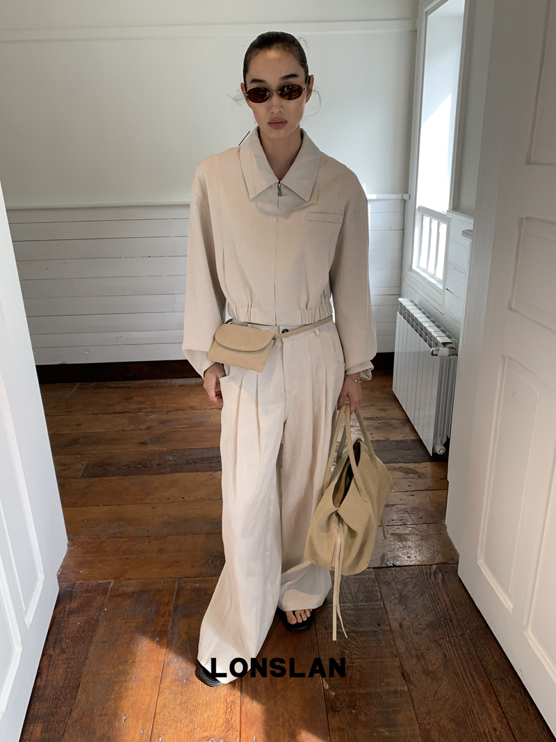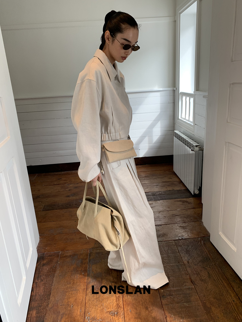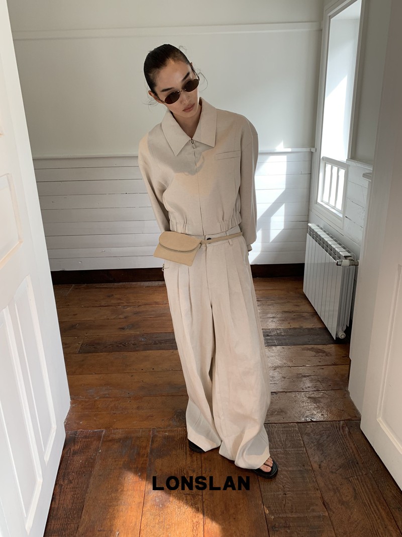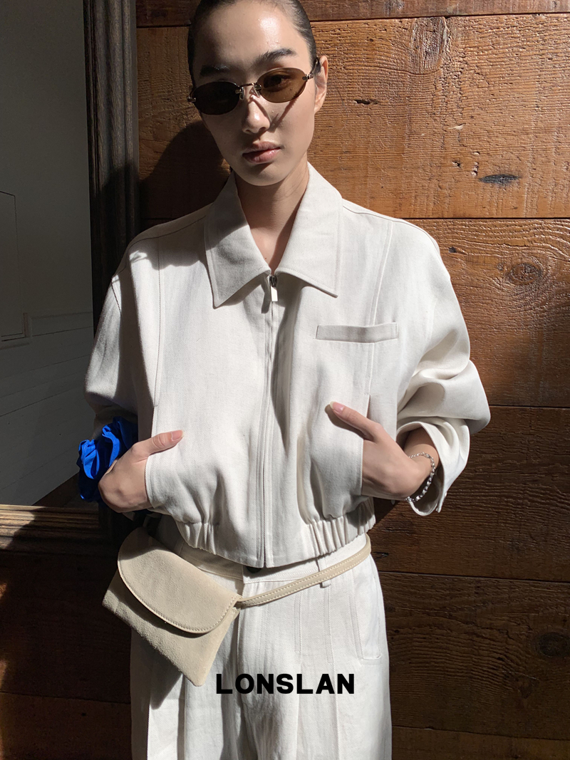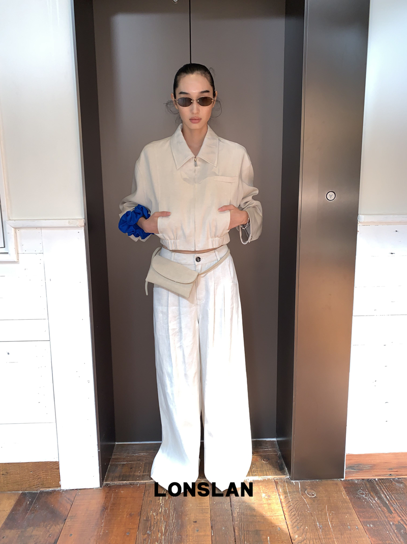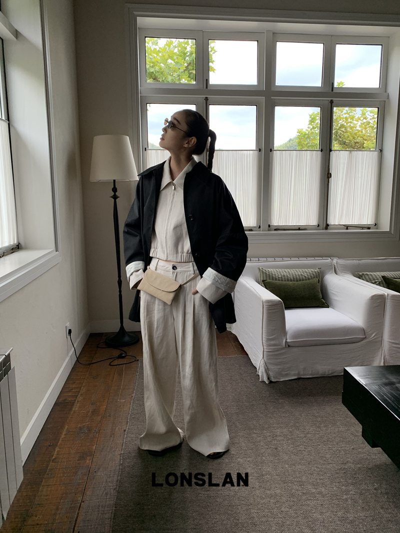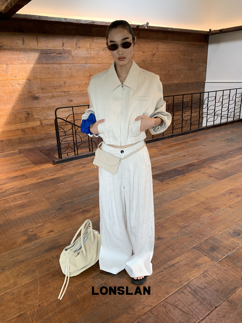 LONSLAN Cotton and Linen Shorts Zipper Lapel Jacket + Wide-leg Pants Set