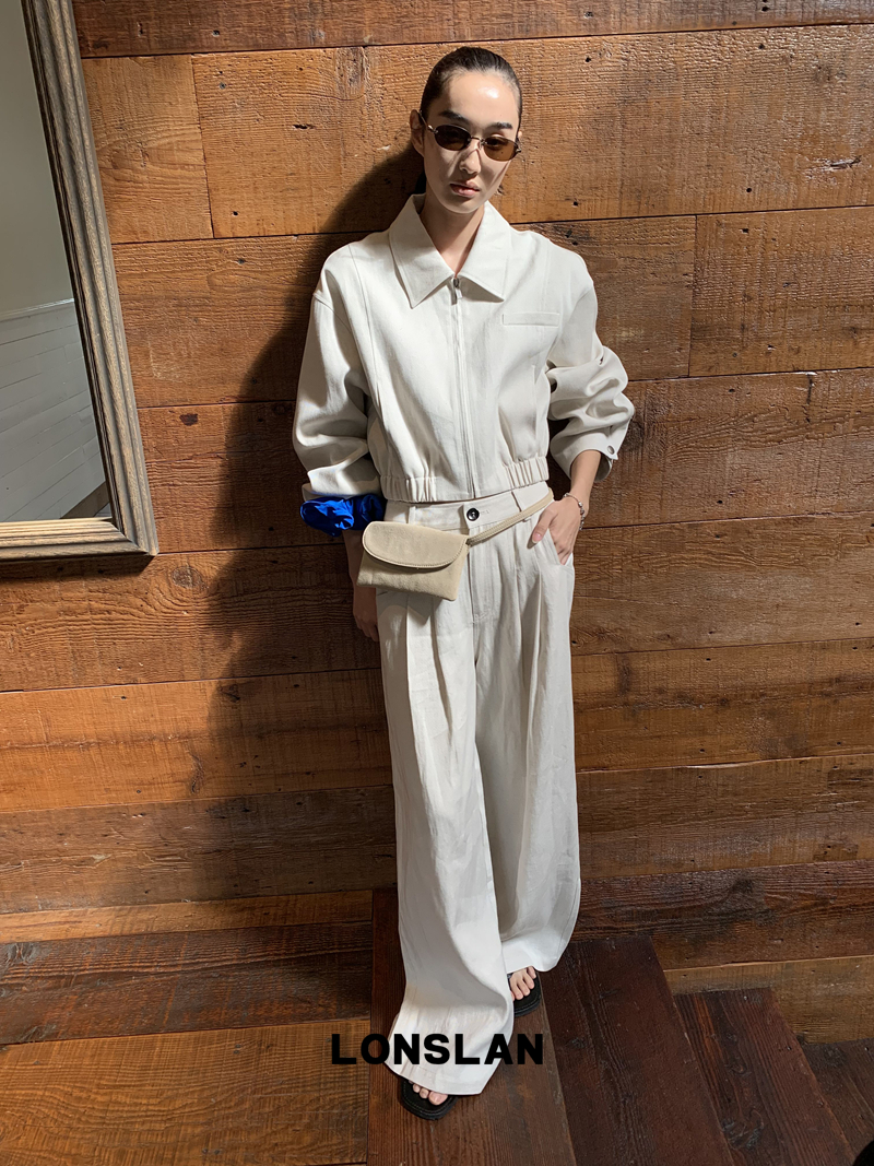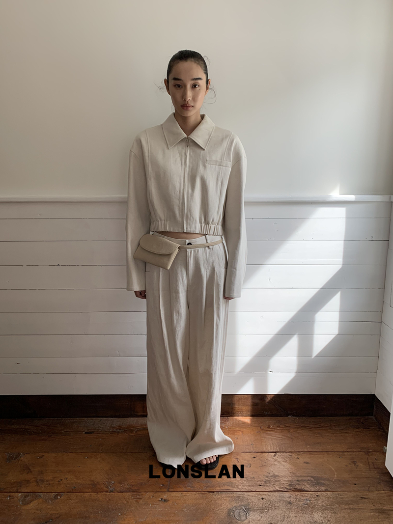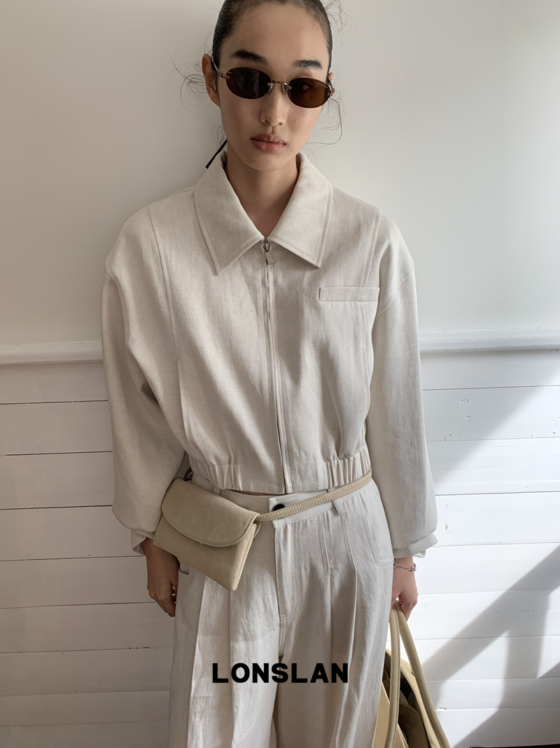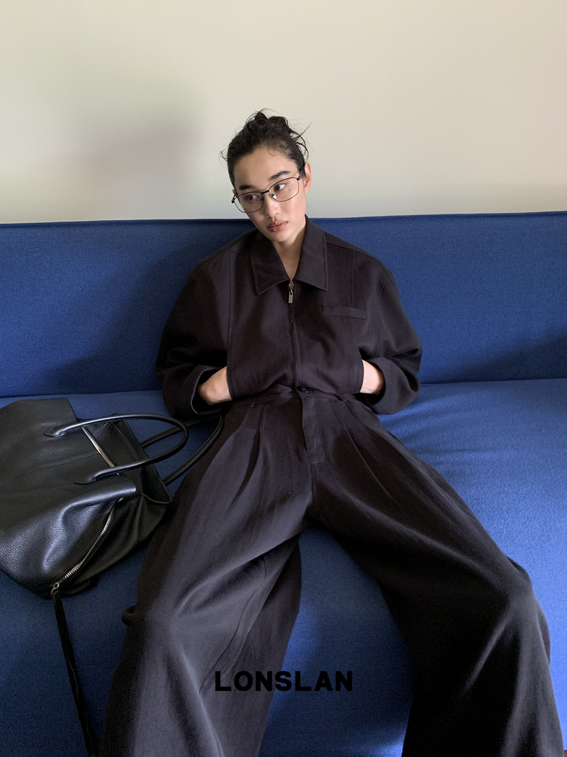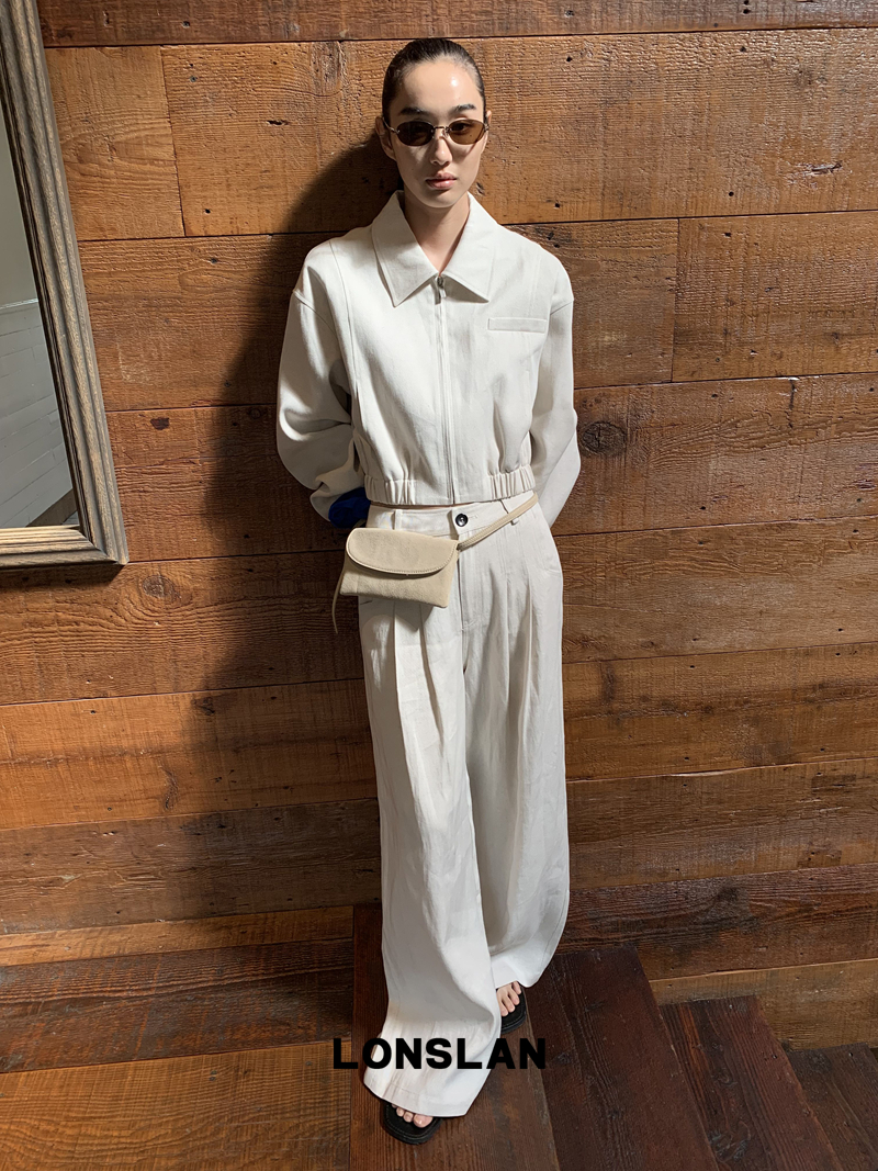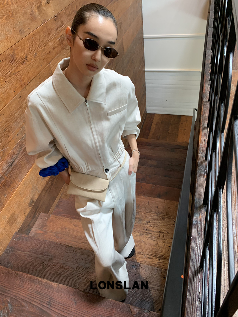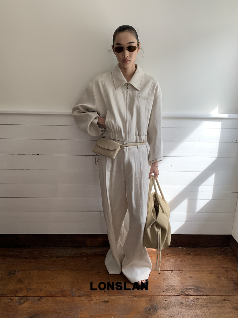 LONSLAN Cotton and Linen Shorts Zipper Lapel Jacket + Wide-leg Pants Set