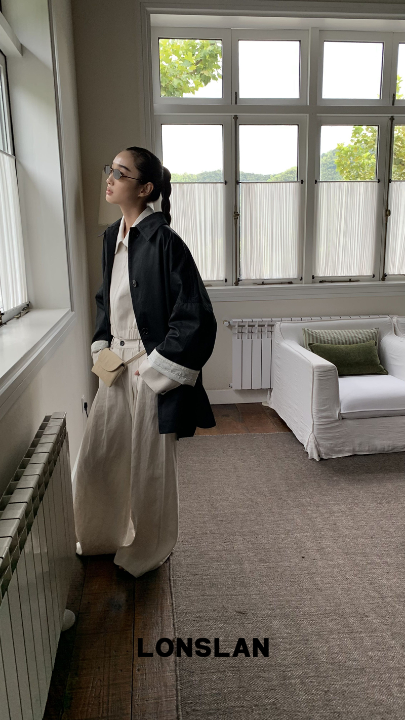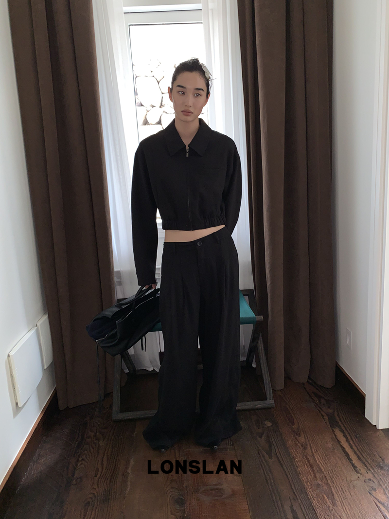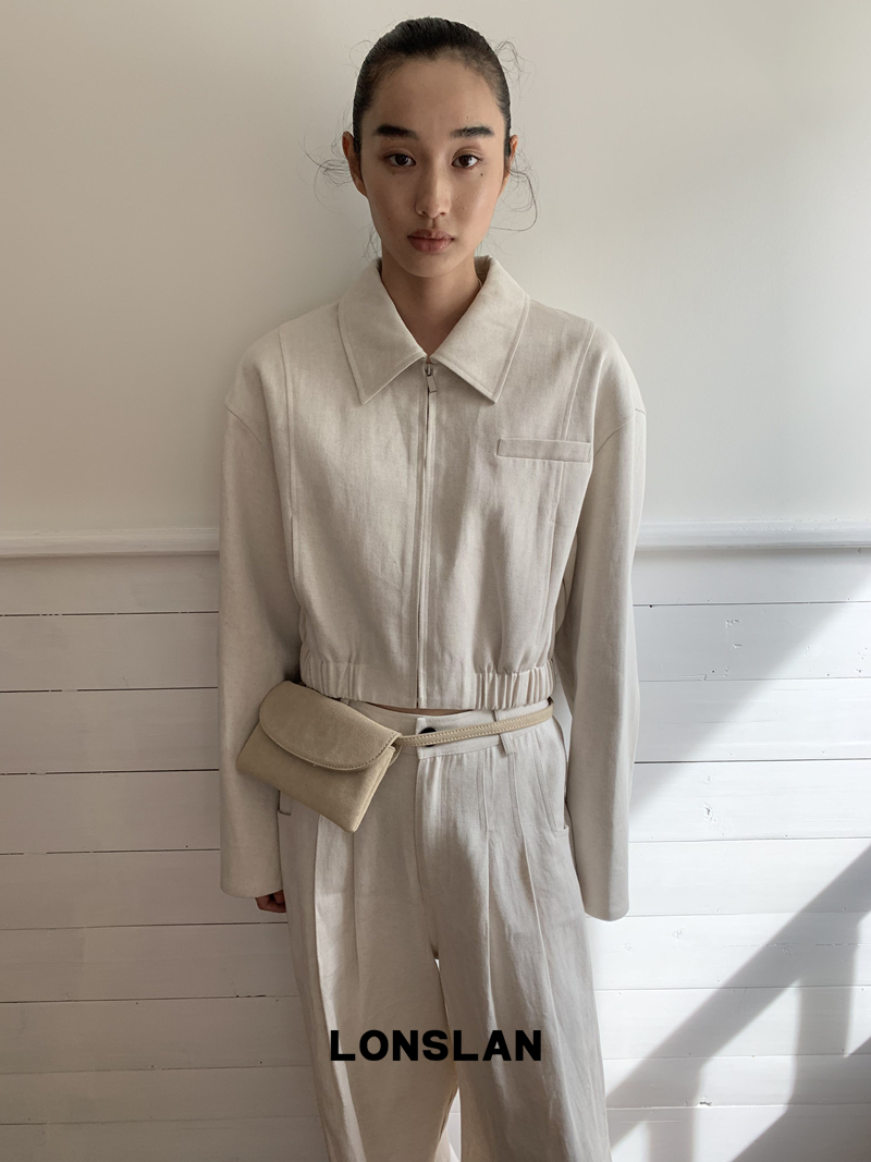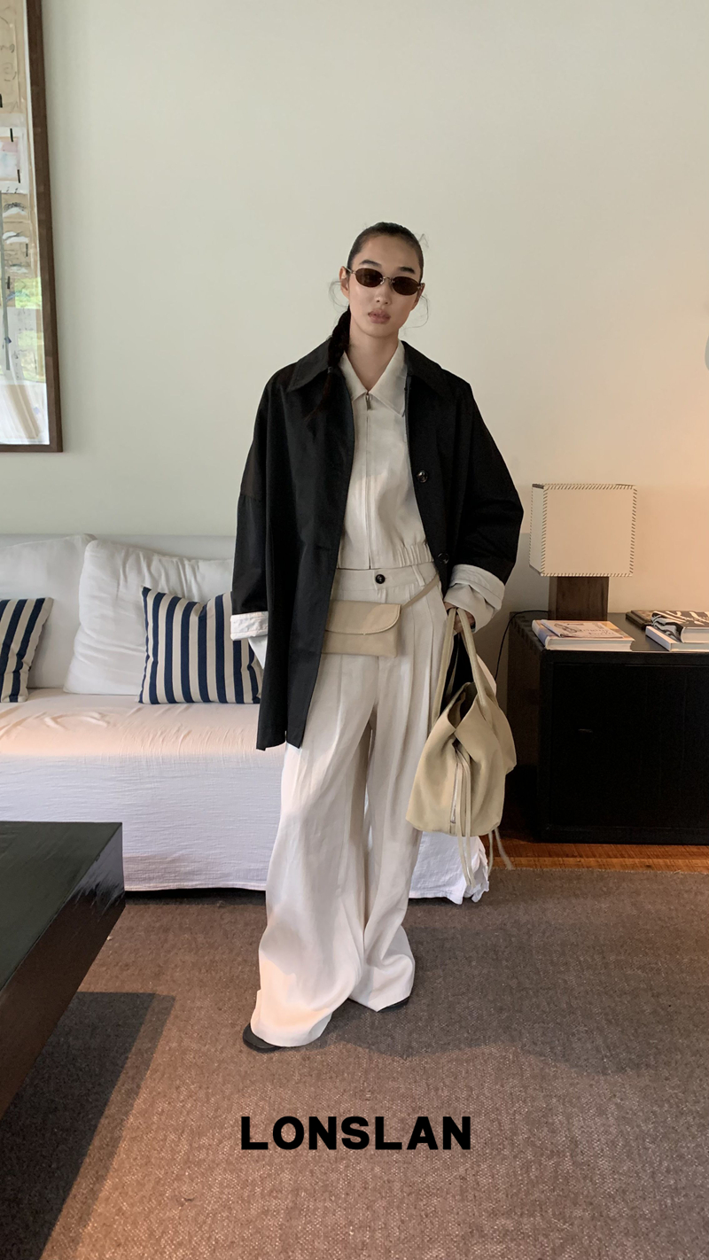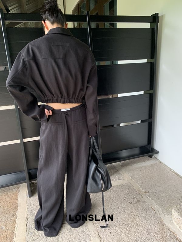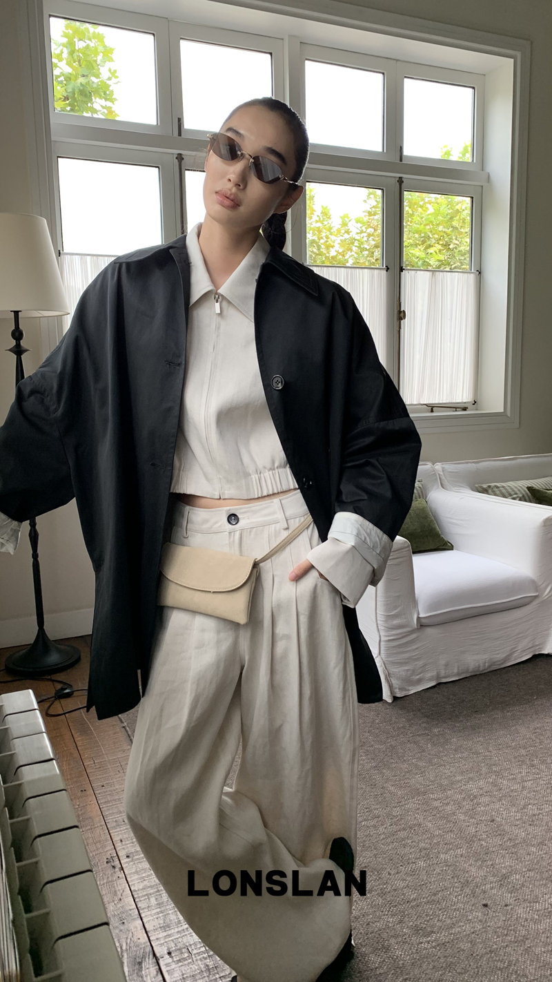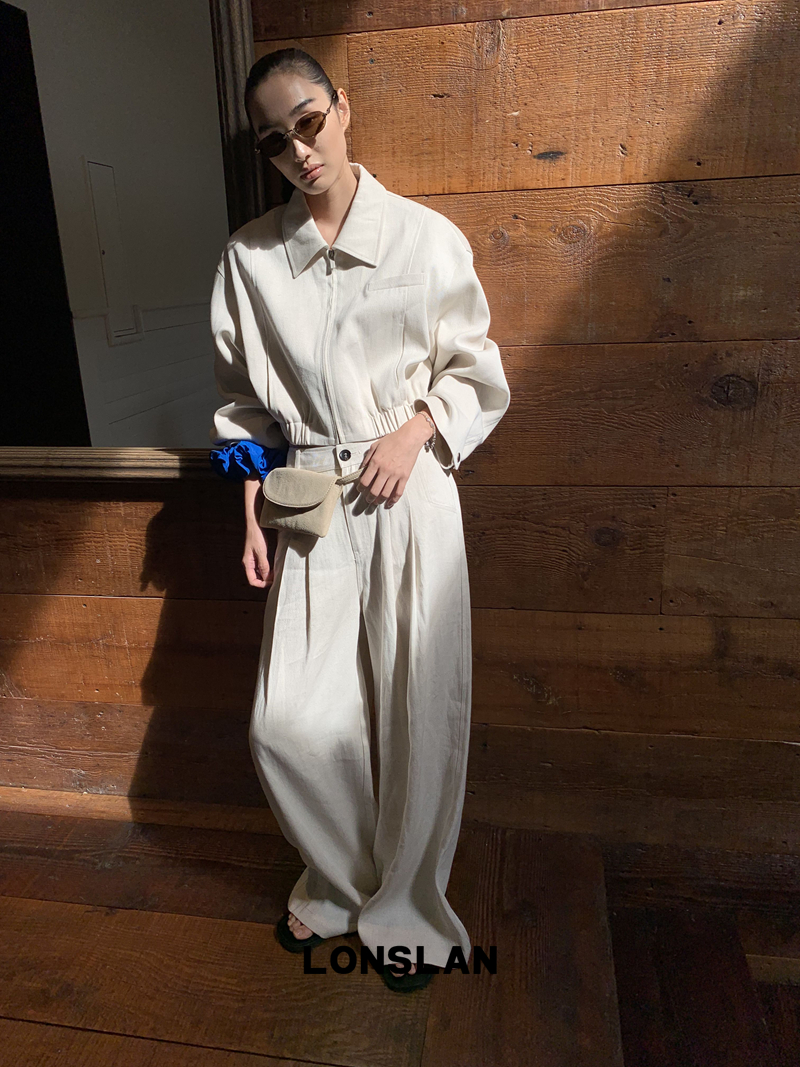LONSLAN Cotton and Linen Shorts Zipper Lapel Jacket + Wide-leg Pants Set