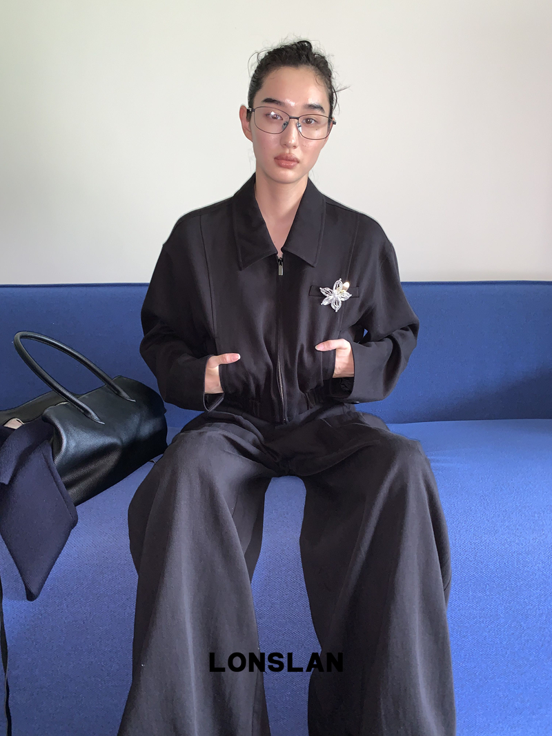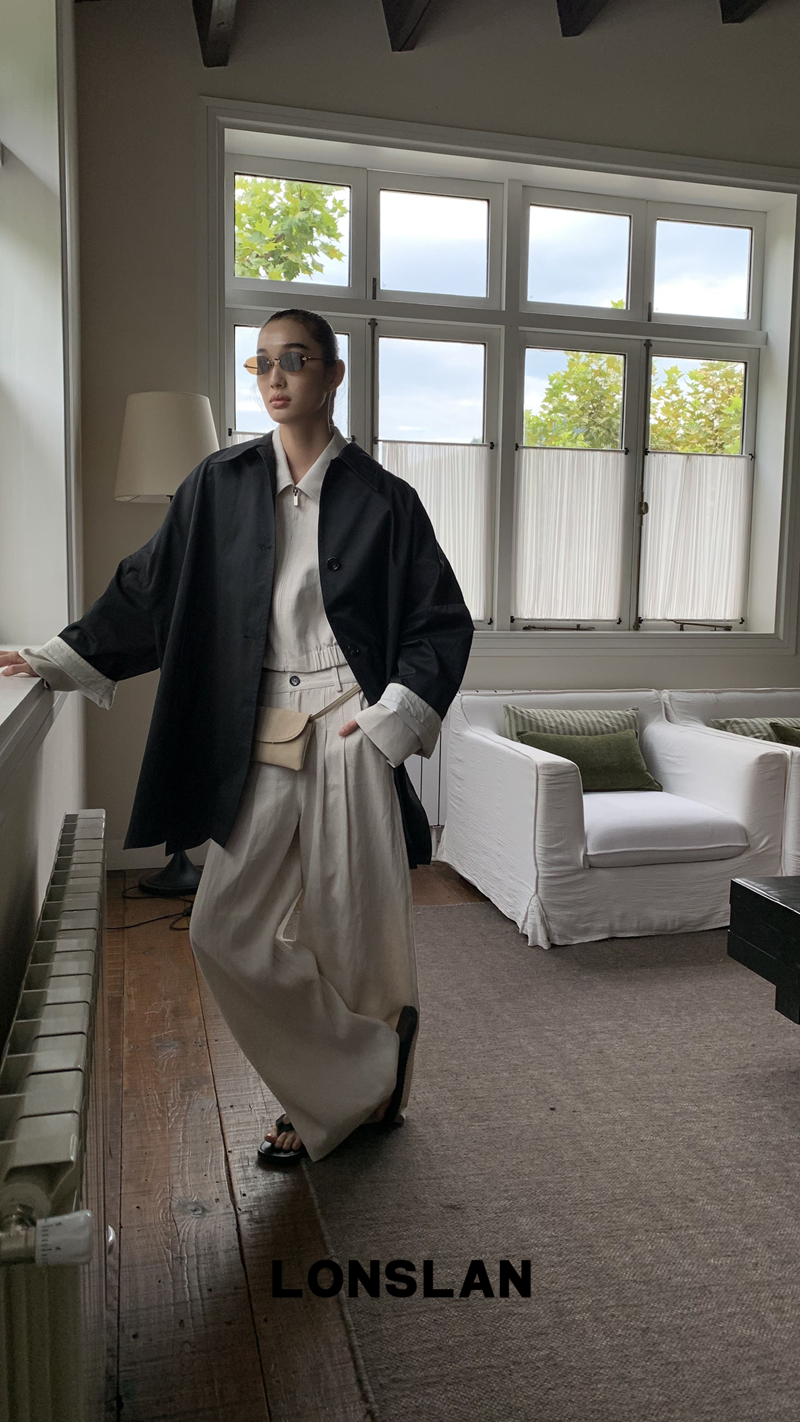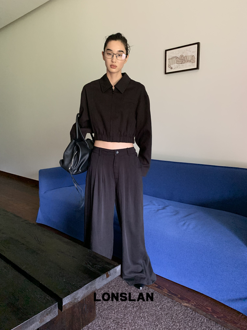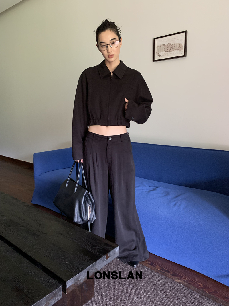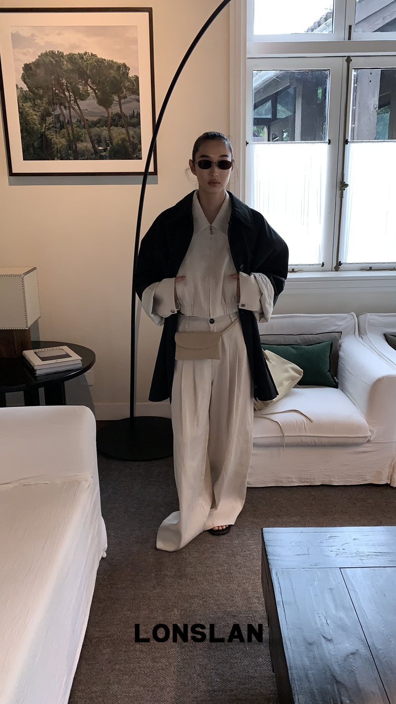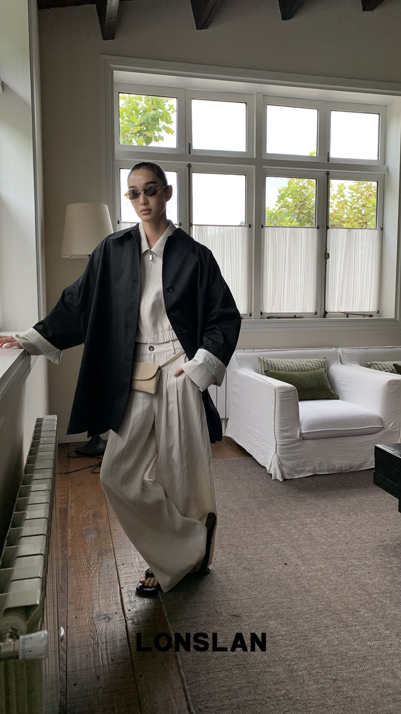 LONSLAN Cotton and Linen Shorts Zipper Lapel Jacket + Wide-leg Pants Set