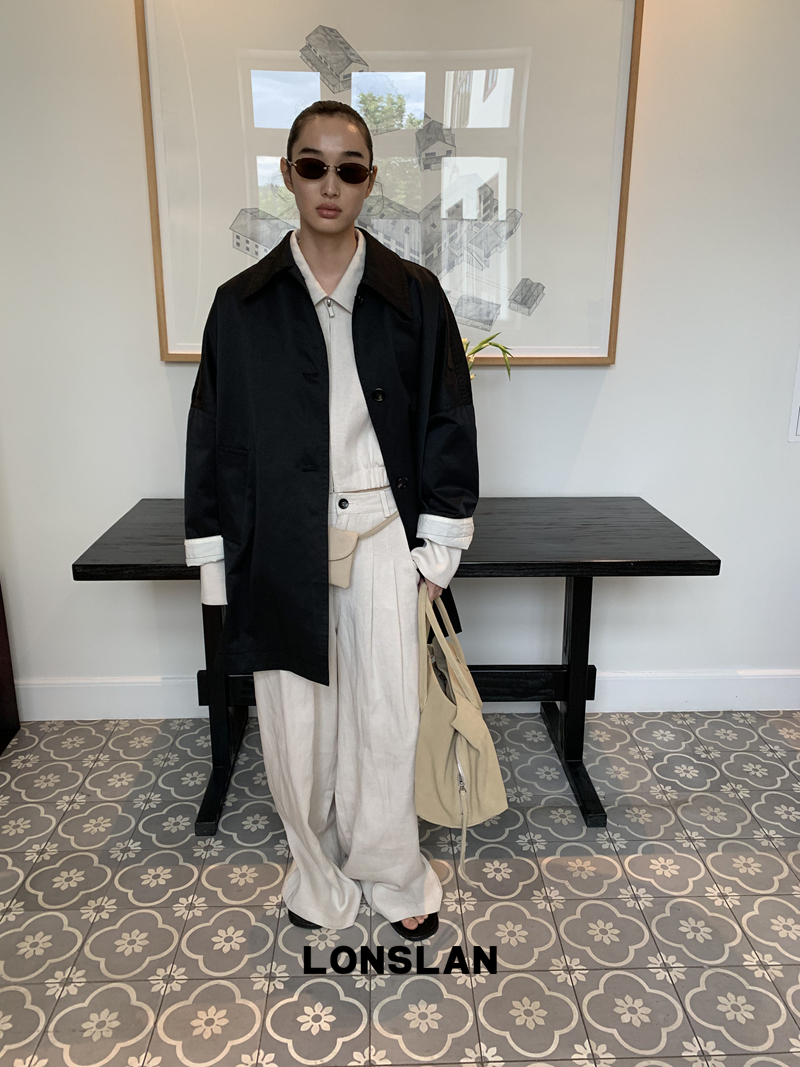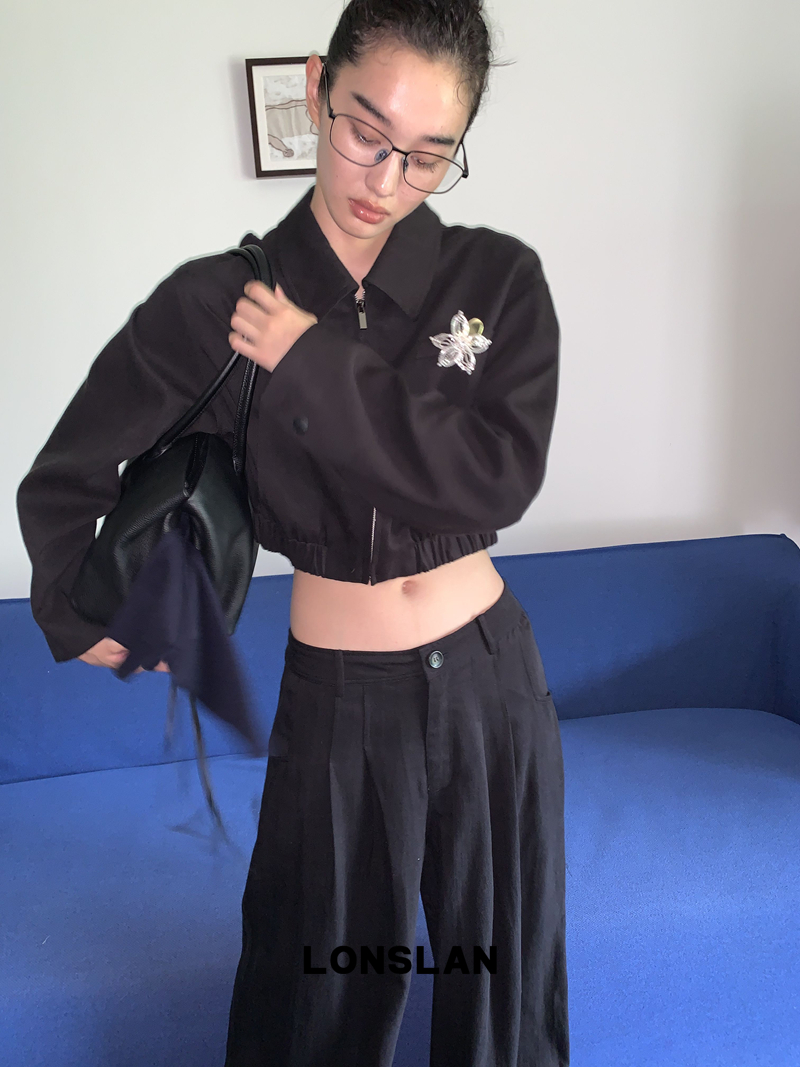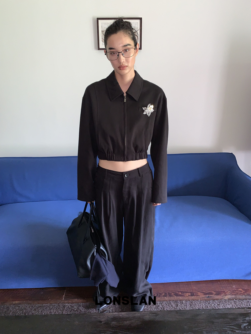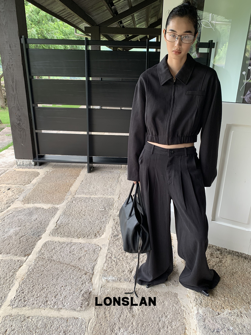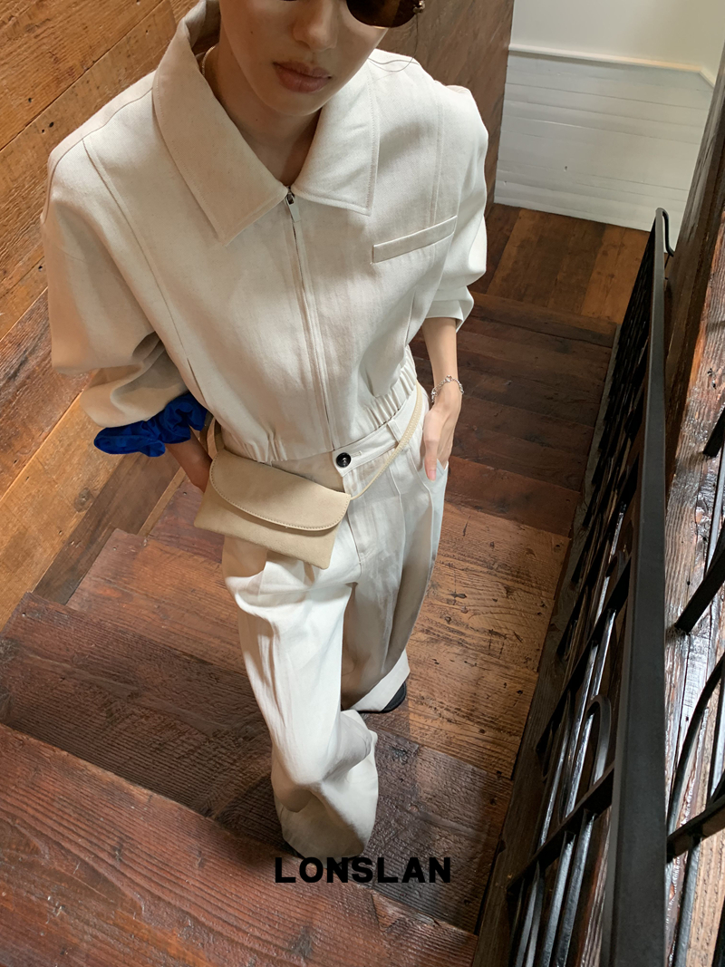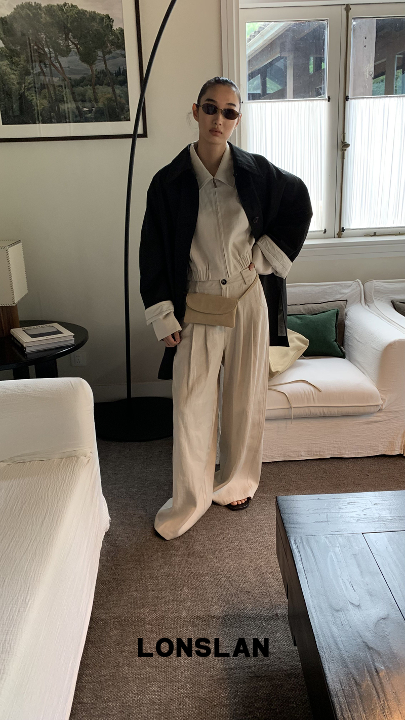 LONSLAN Cotton and Linen Shorts Zipper Lapel Jacket + Wide-leg Pants Set