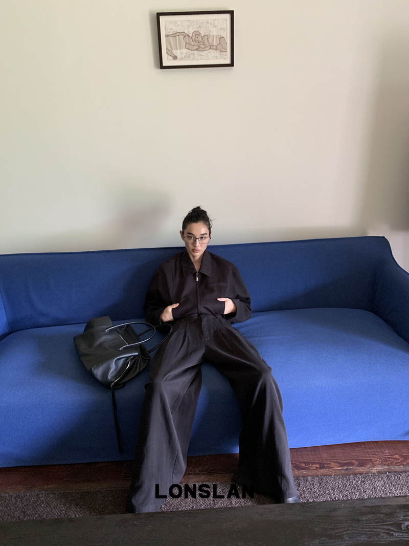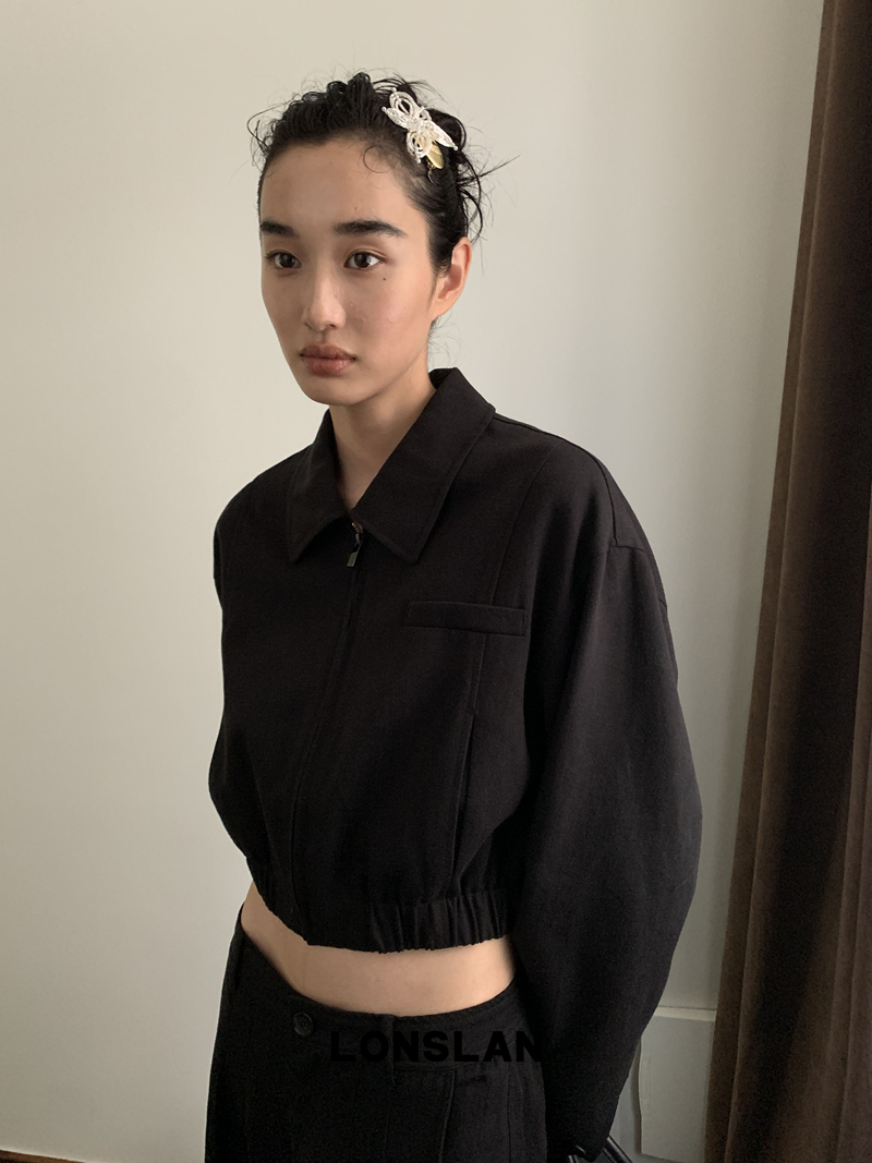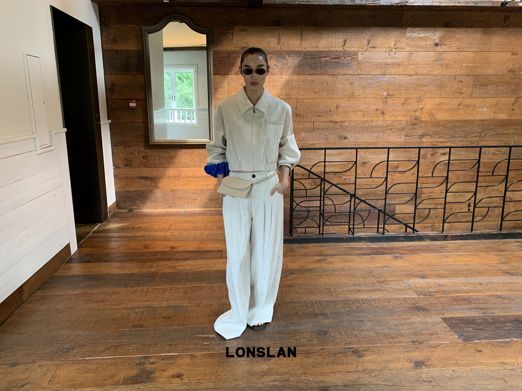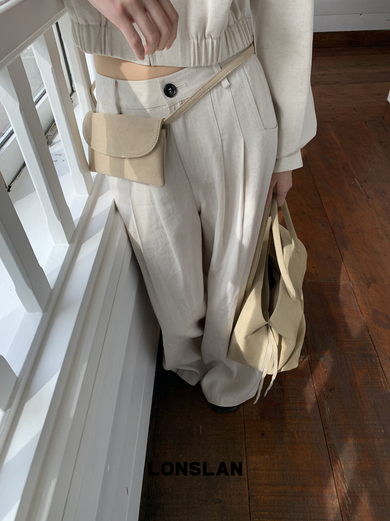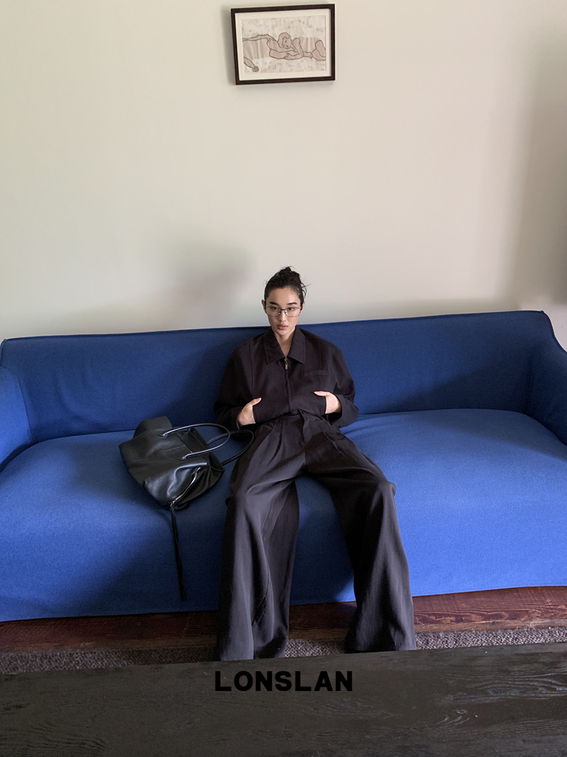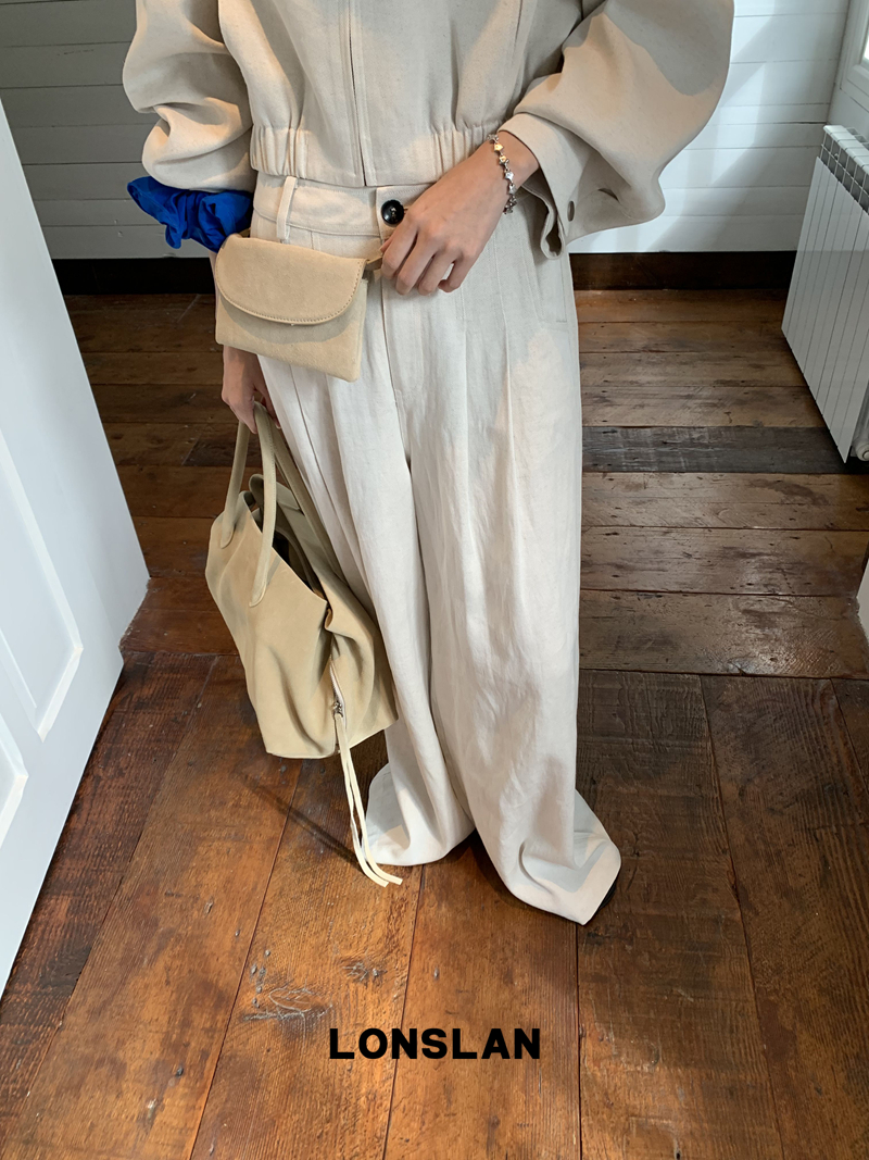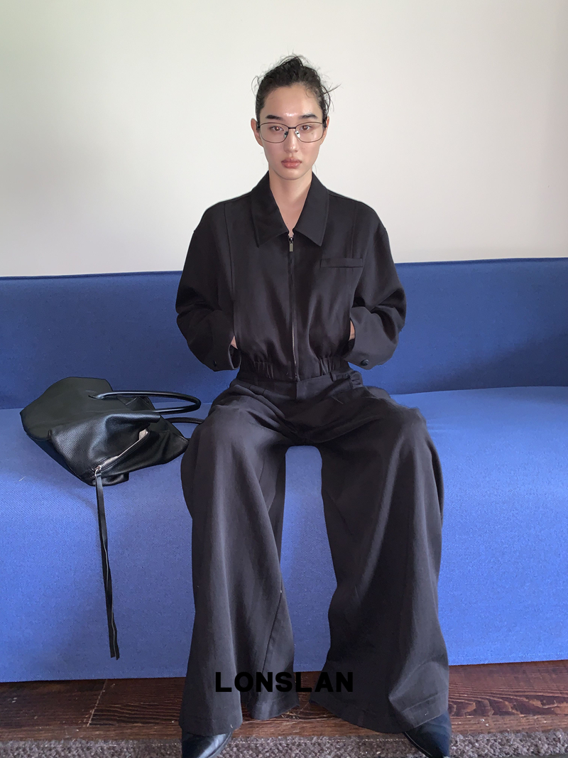 LONSLAN Cotton and Linen Shorts Zipper Lapel Jacket + Wide-leg Pants Set