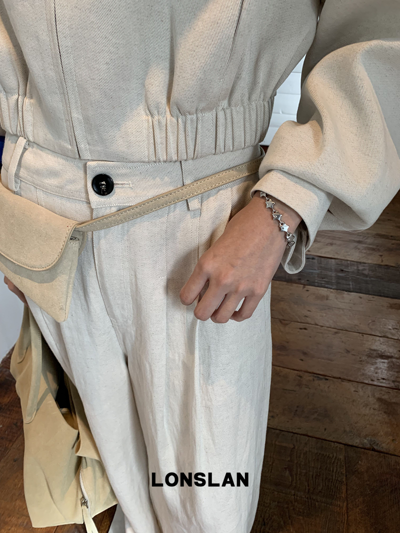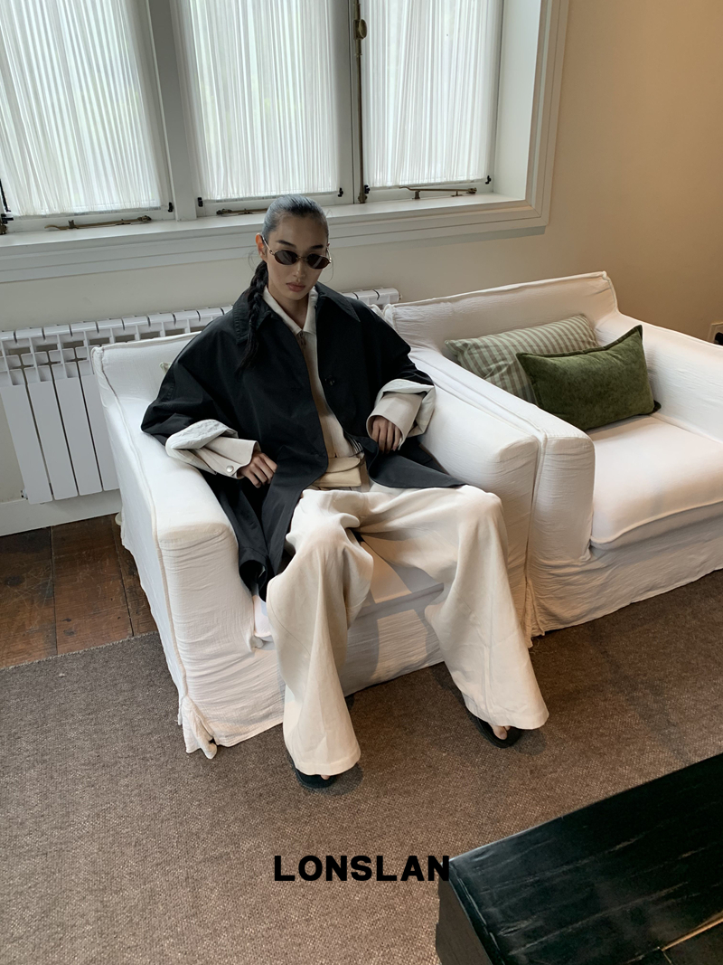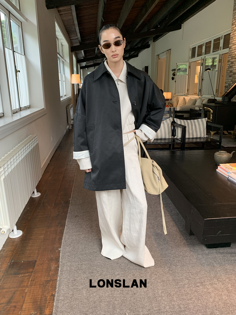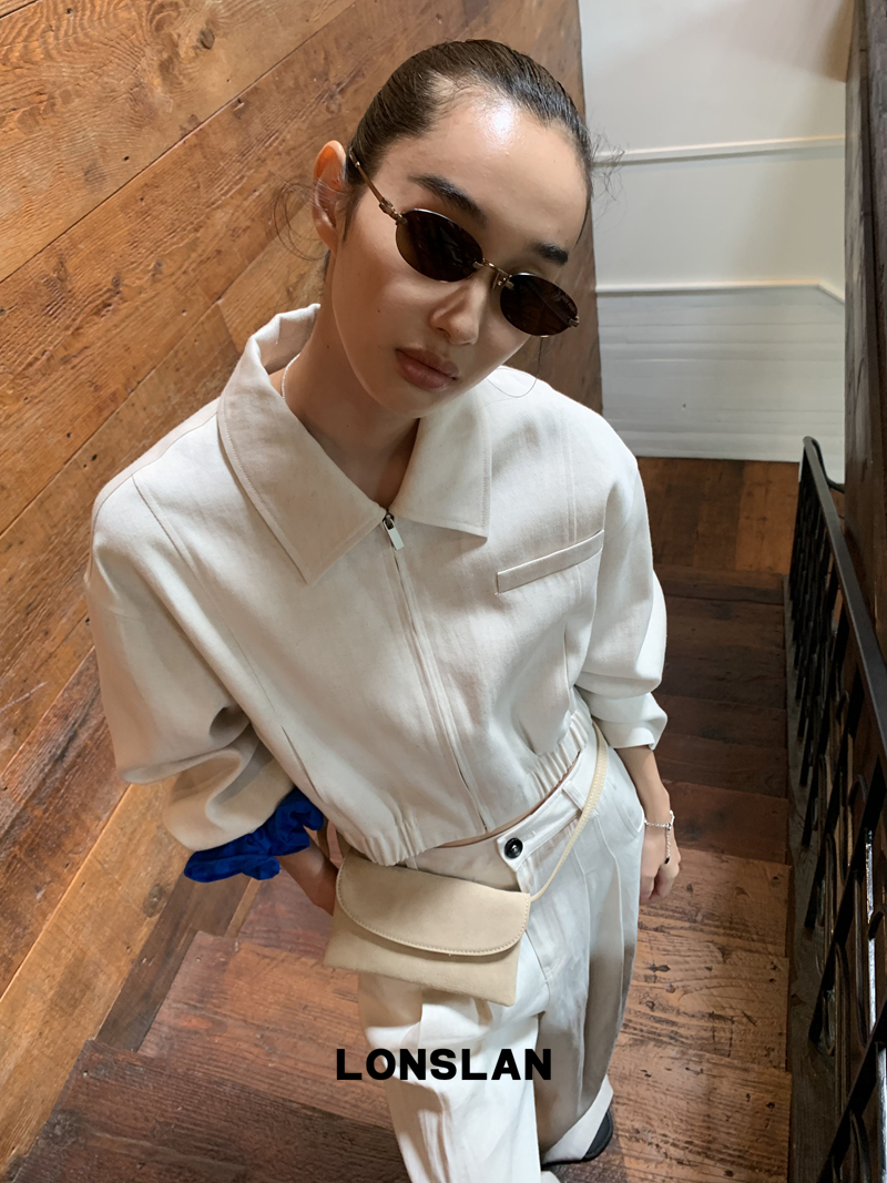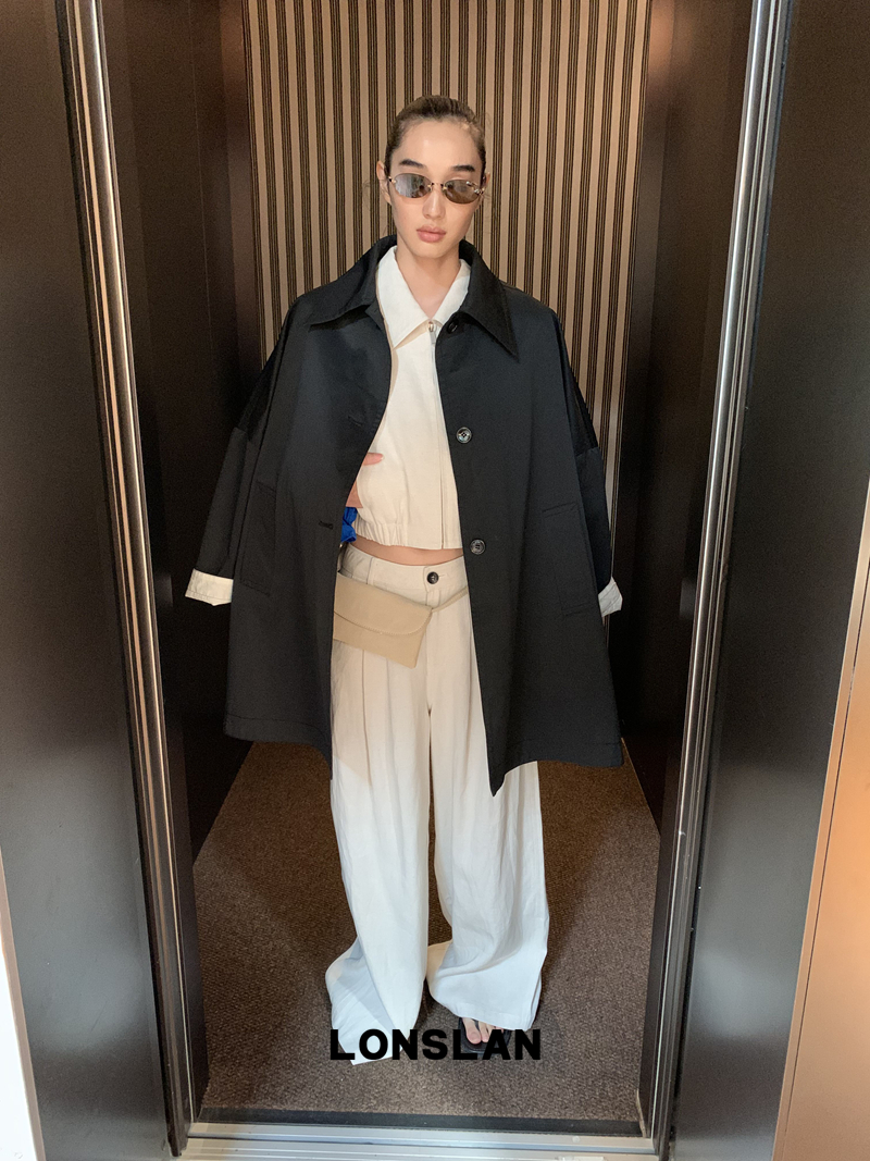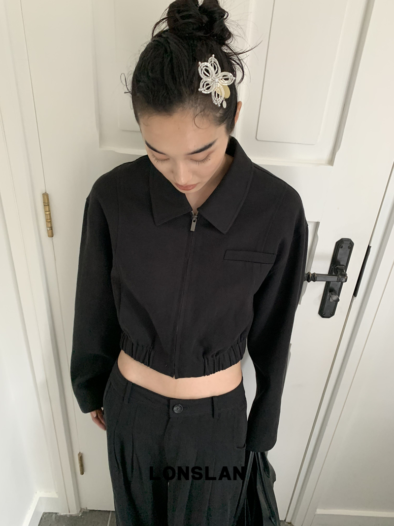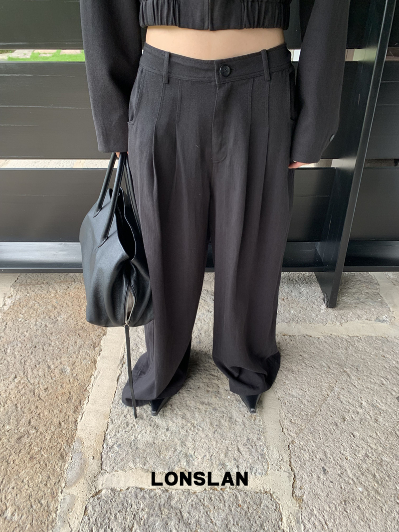 LONSLAN Cotton and Linen Shorts Zipper Lapel Jacket + Wide-leg Pants Set