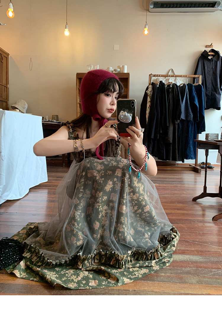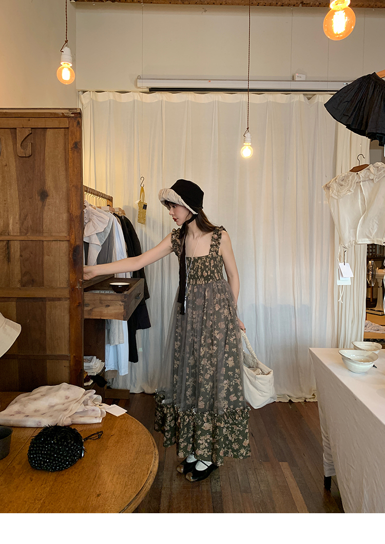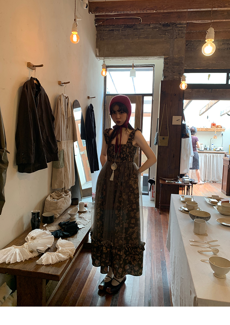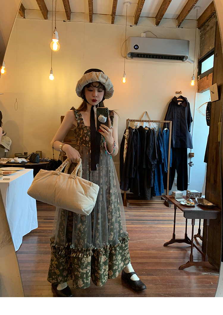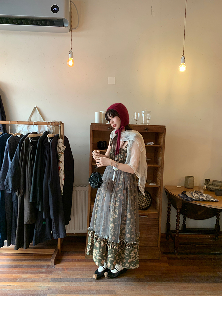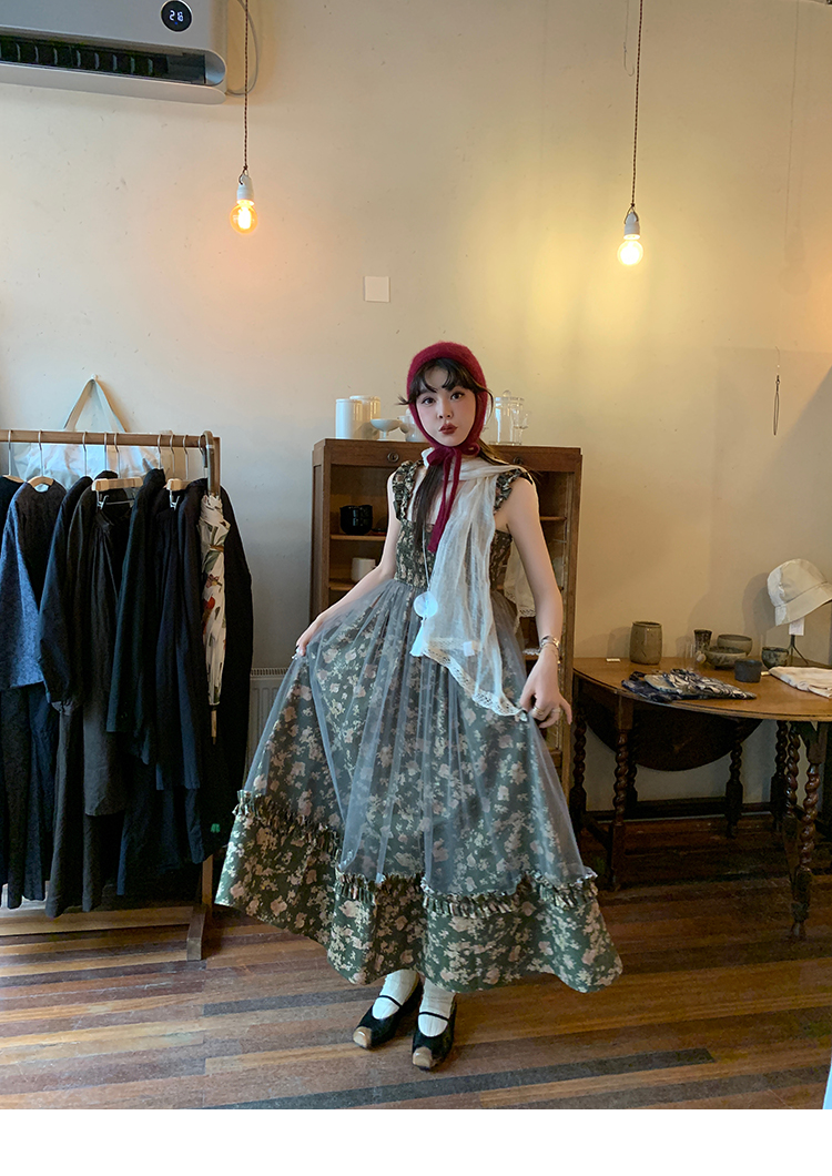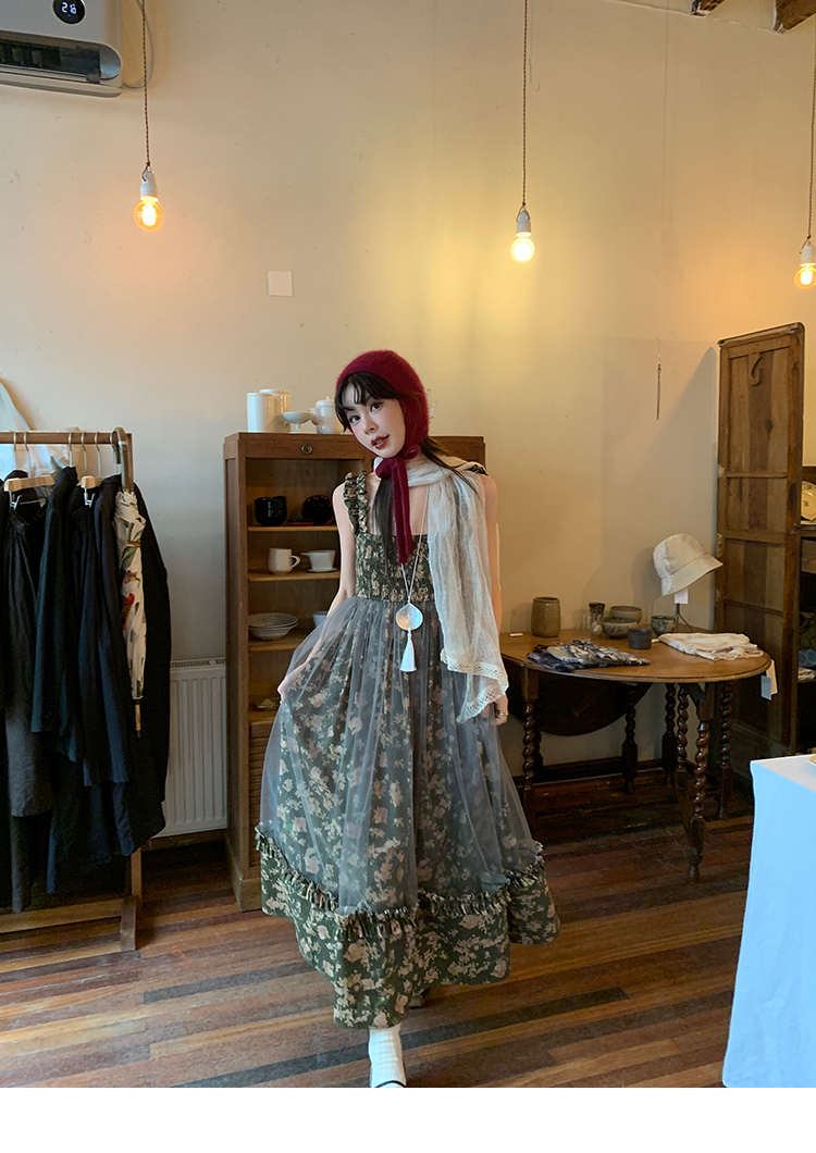 LRIB Autumn Story floral pattern hazy mesh stitching suspender dress