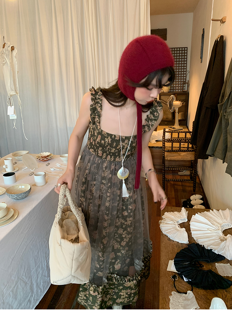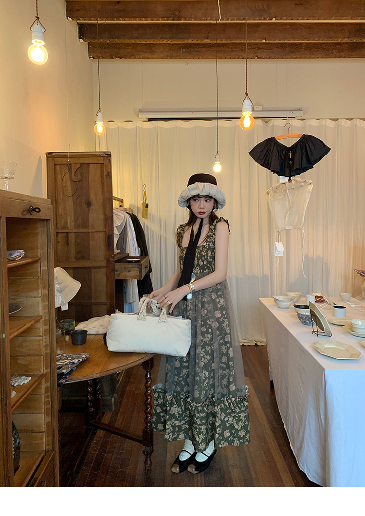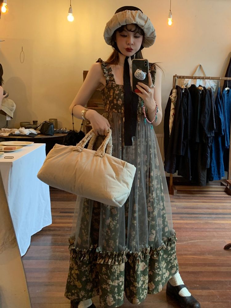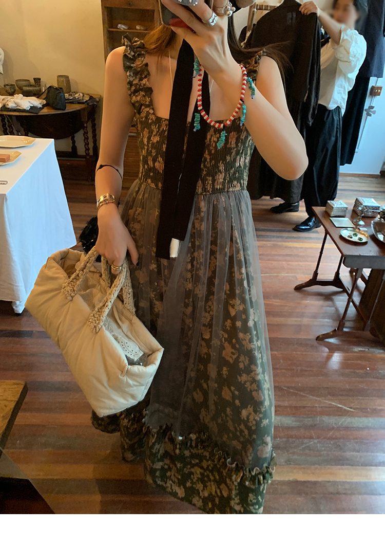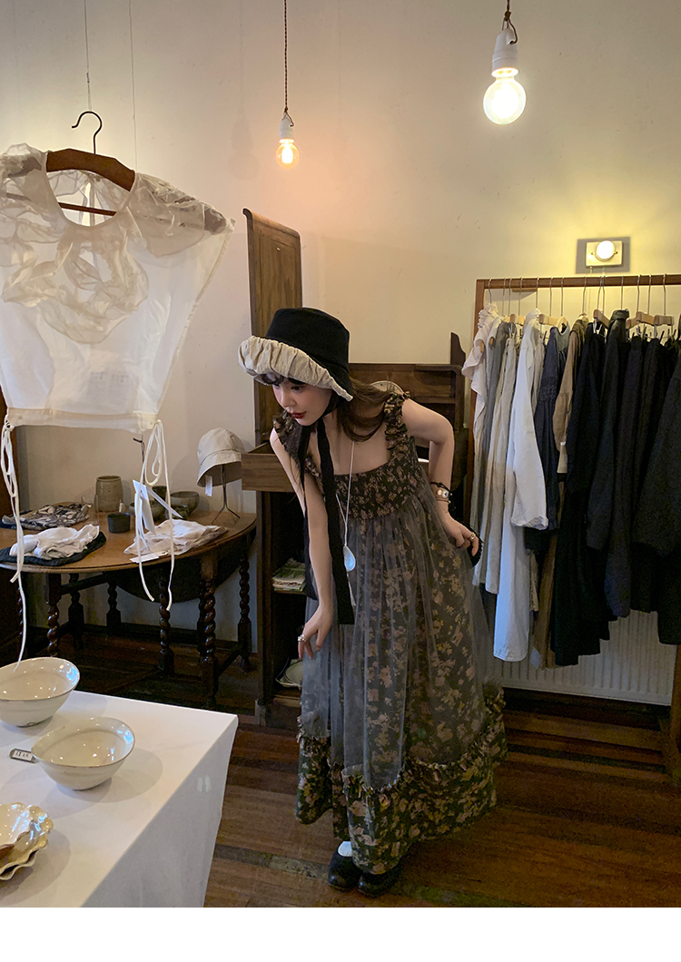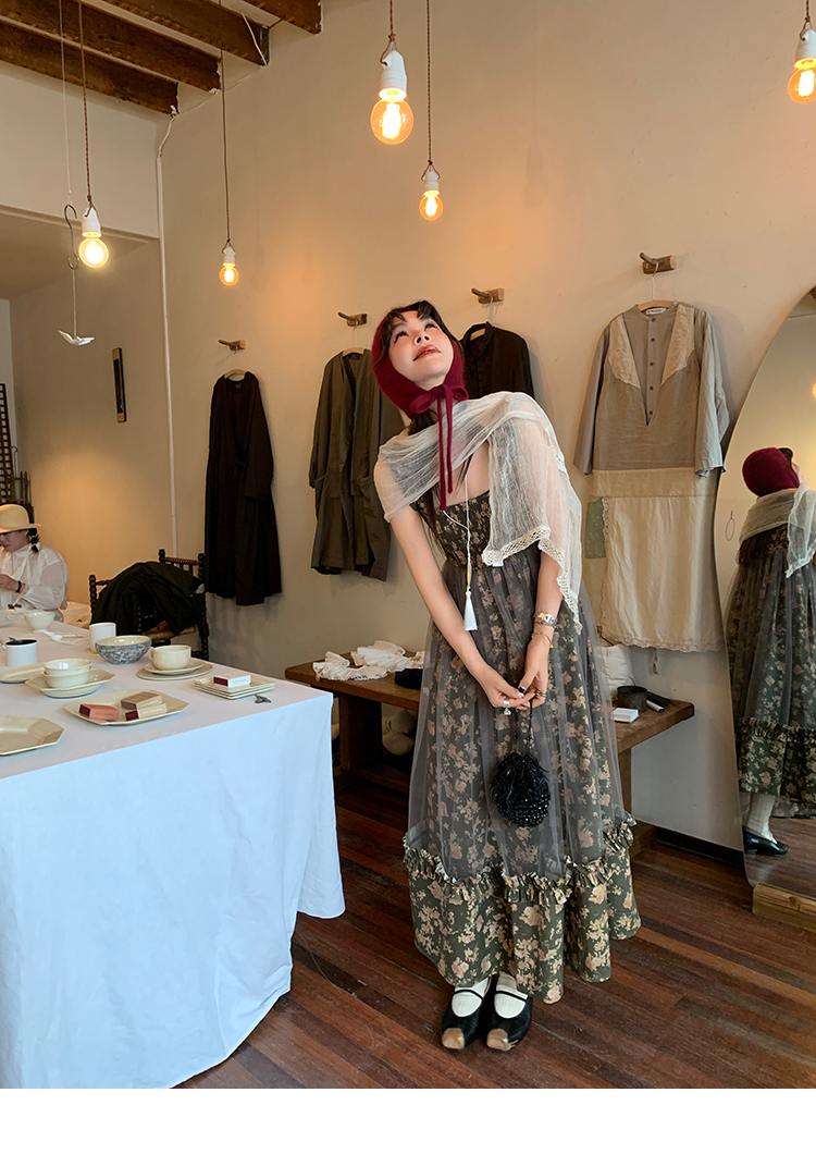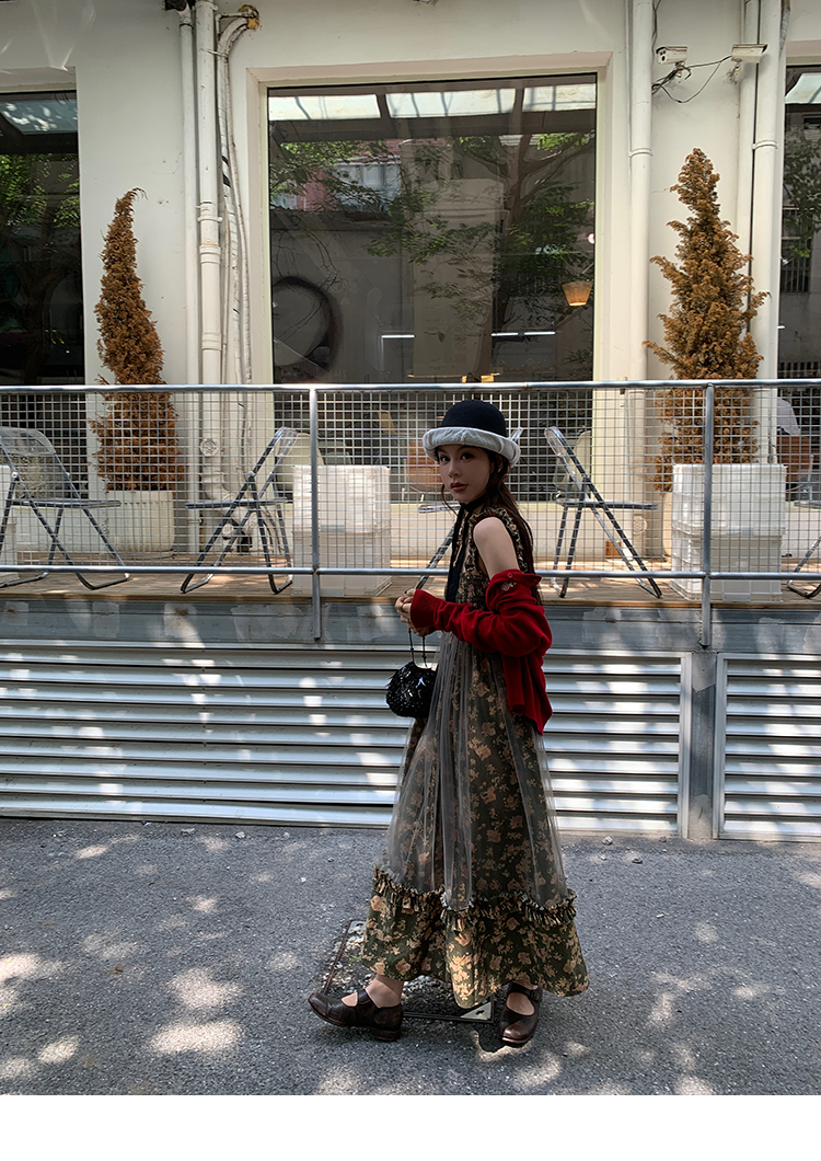 LRIB Autumn Story floral pattern hazy mesh stitching suspender dress