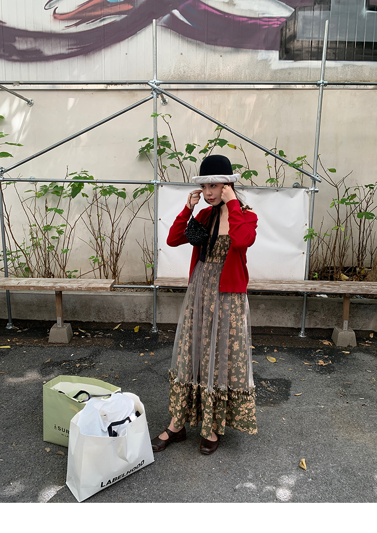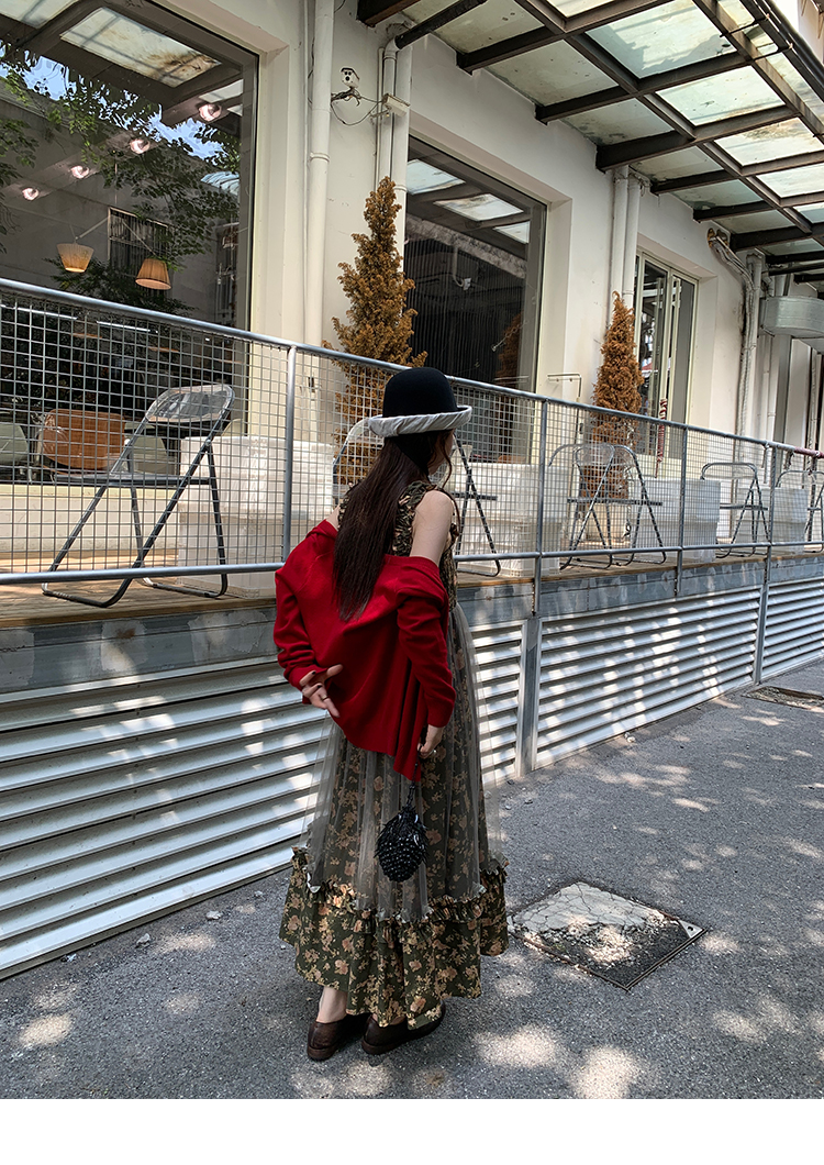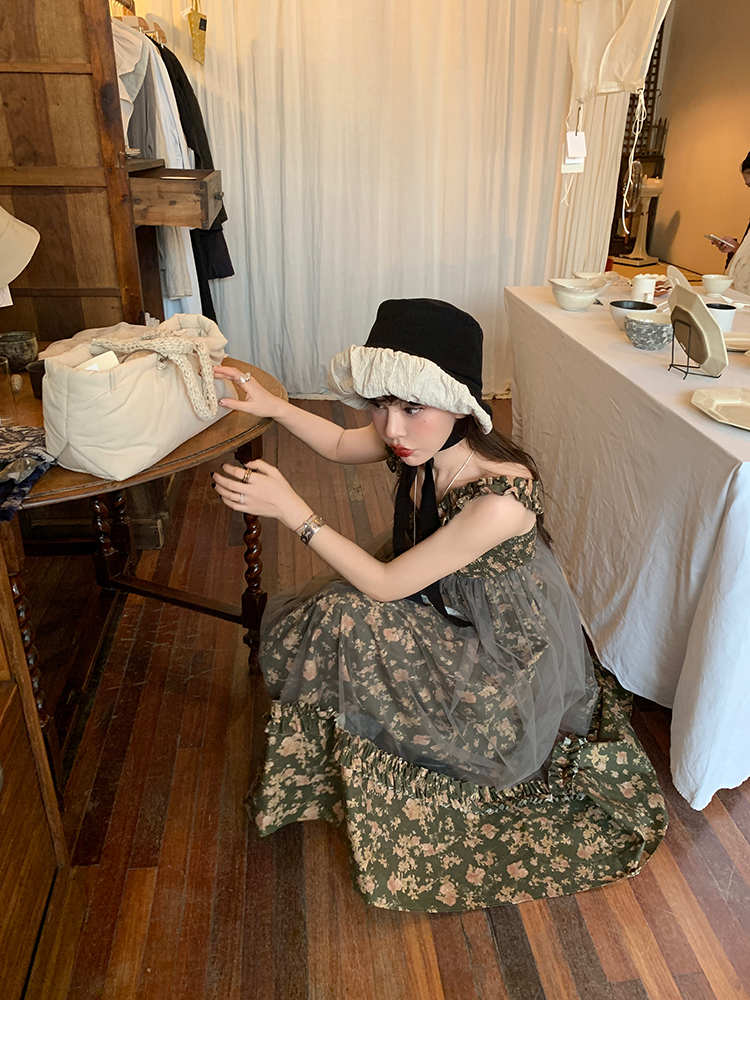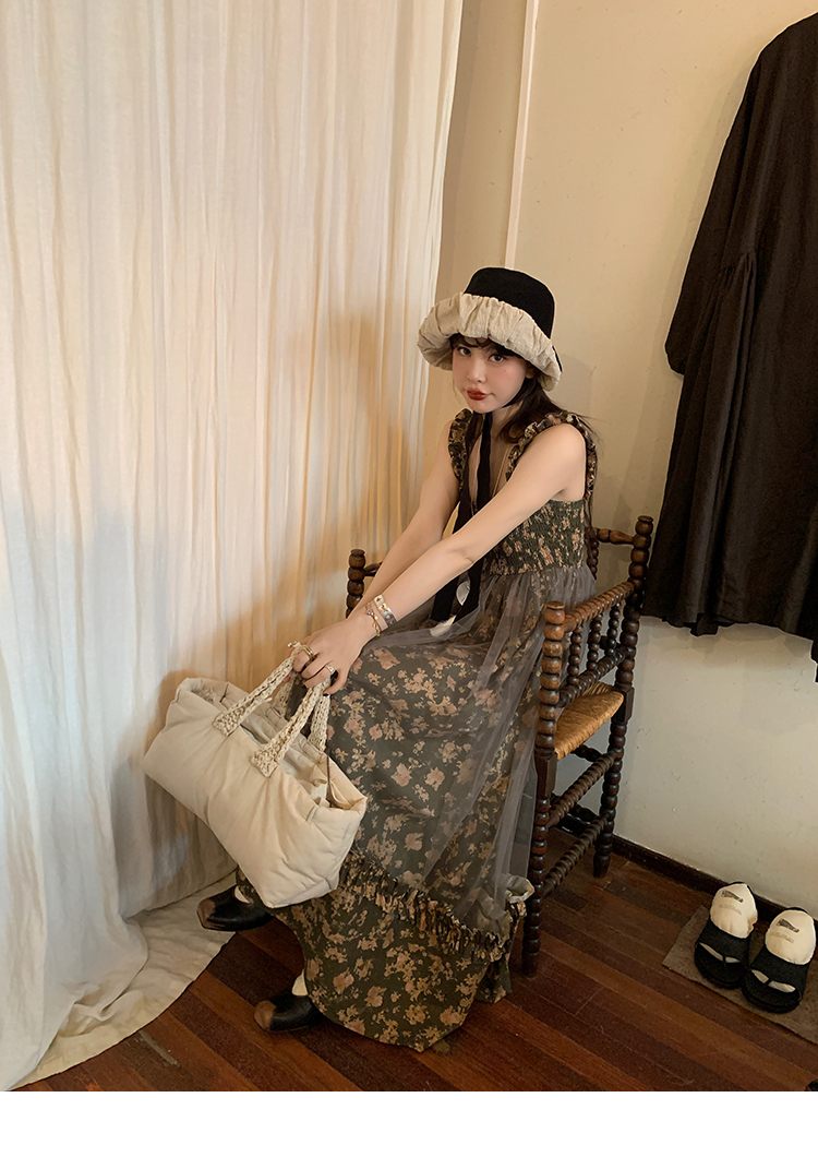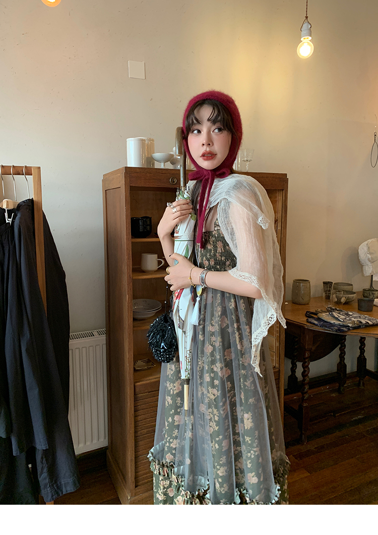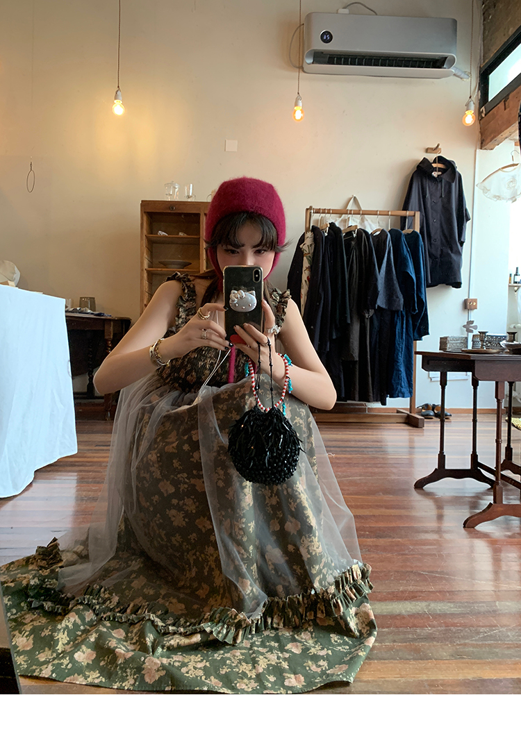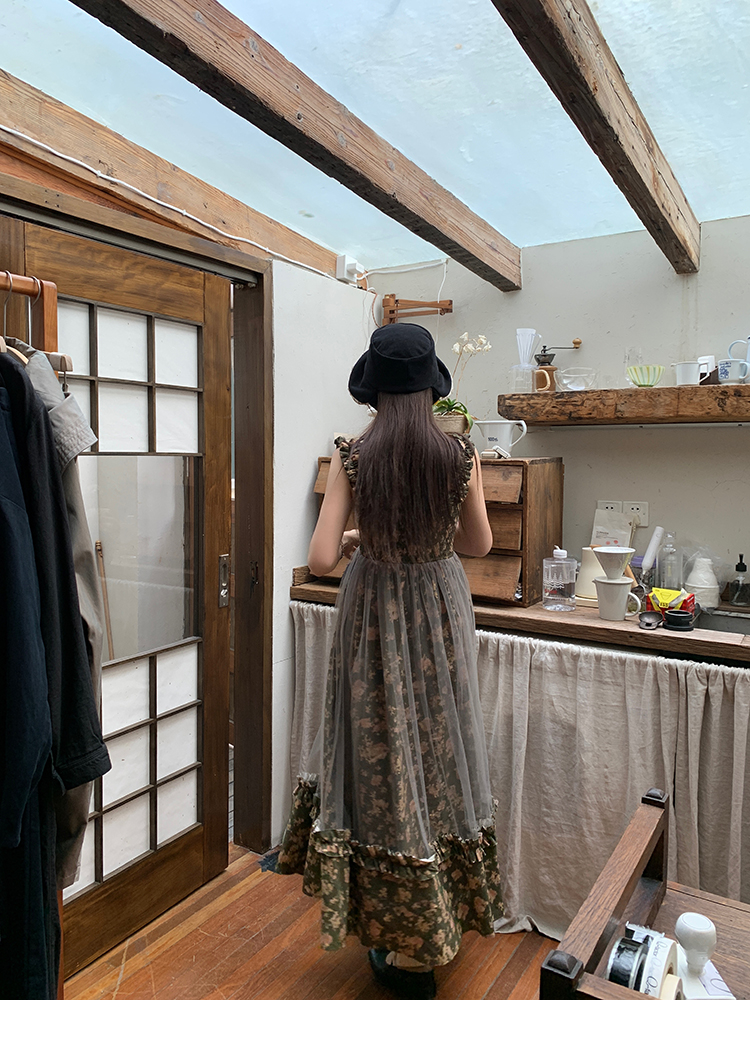 LRIB Autumn Story floral pattern hazy mesh stitching suspender dress