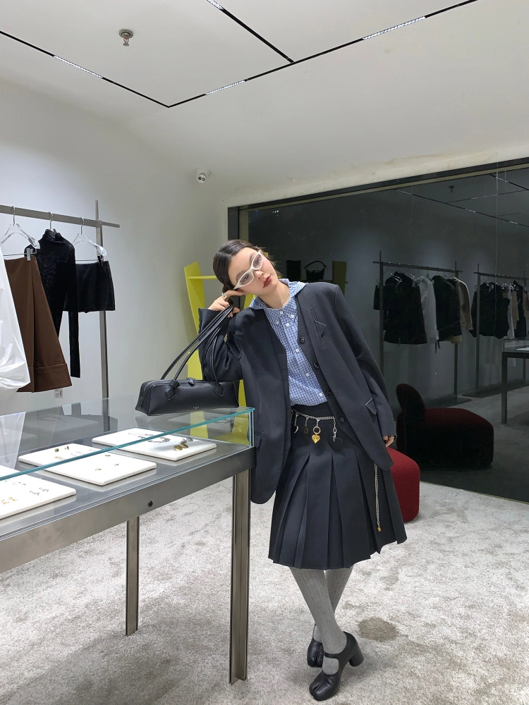 LRIB classic simple dark gray black and white plaid pleated midi skirt / belt