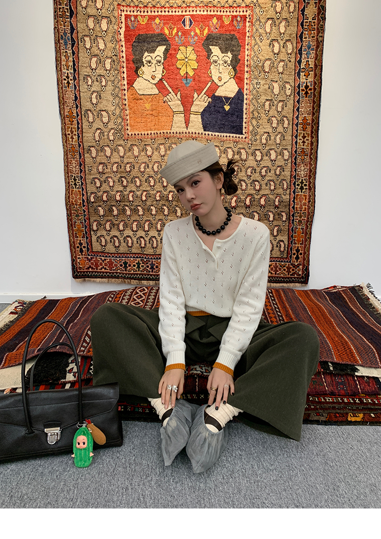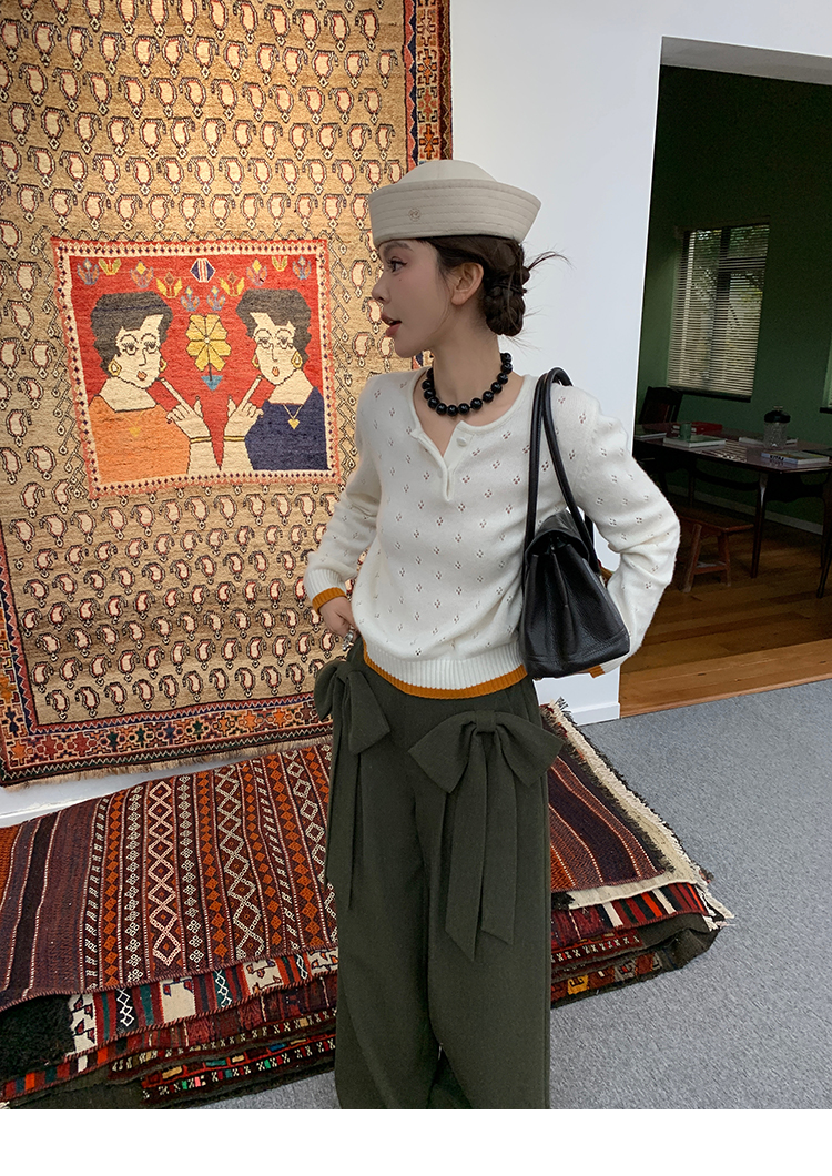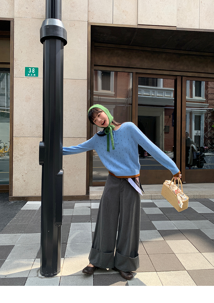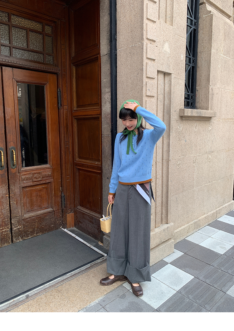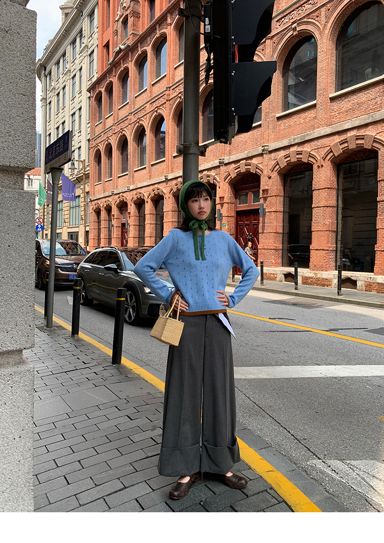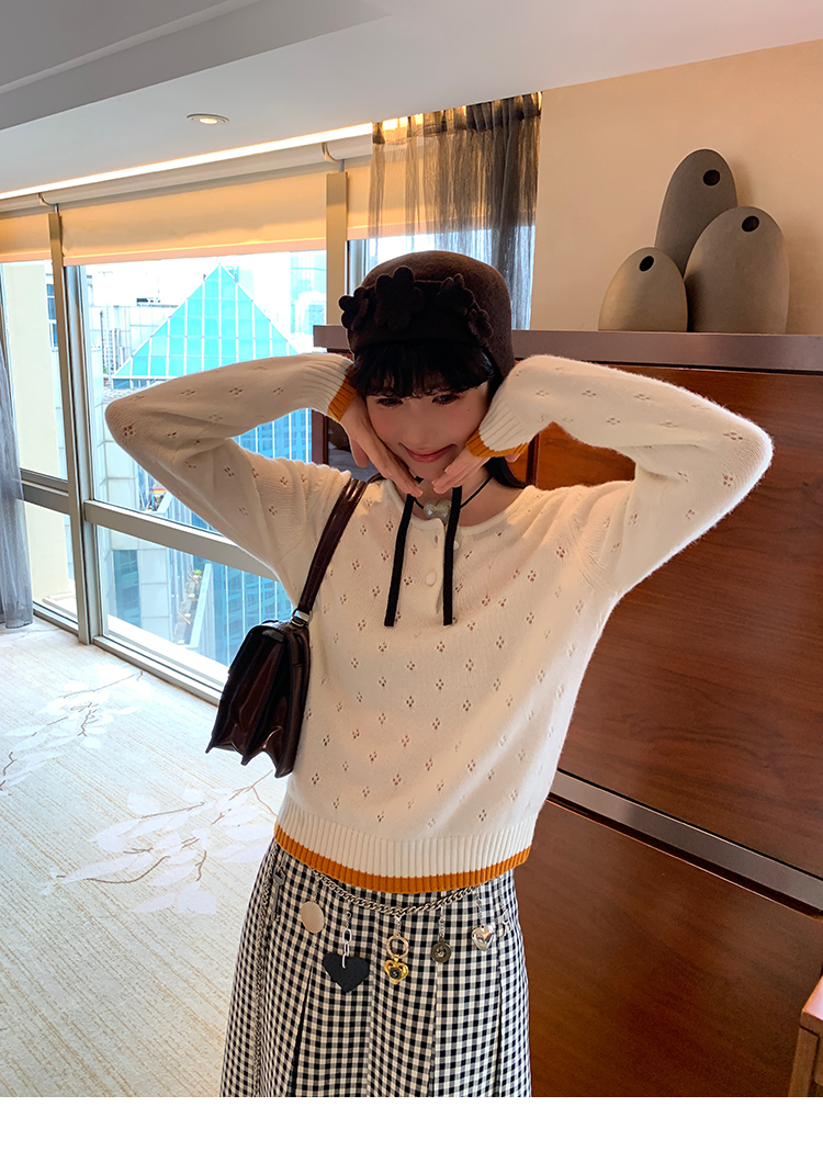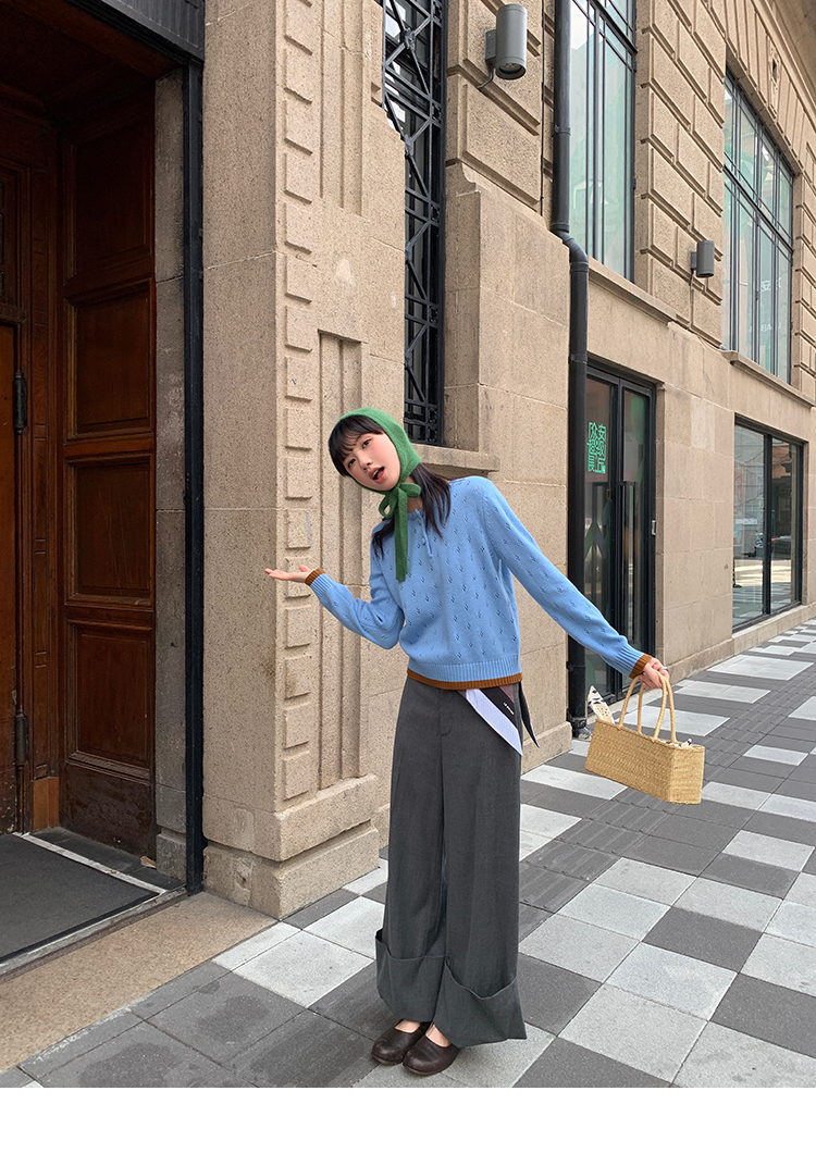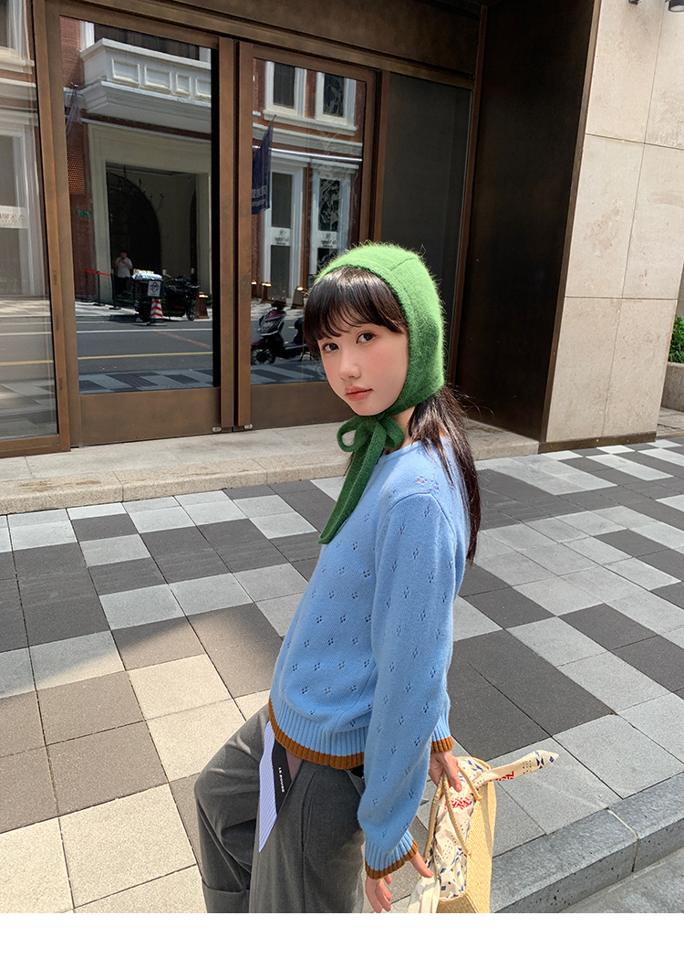 LRIB lazy wool retro hollow pattern contrast color knitted top
