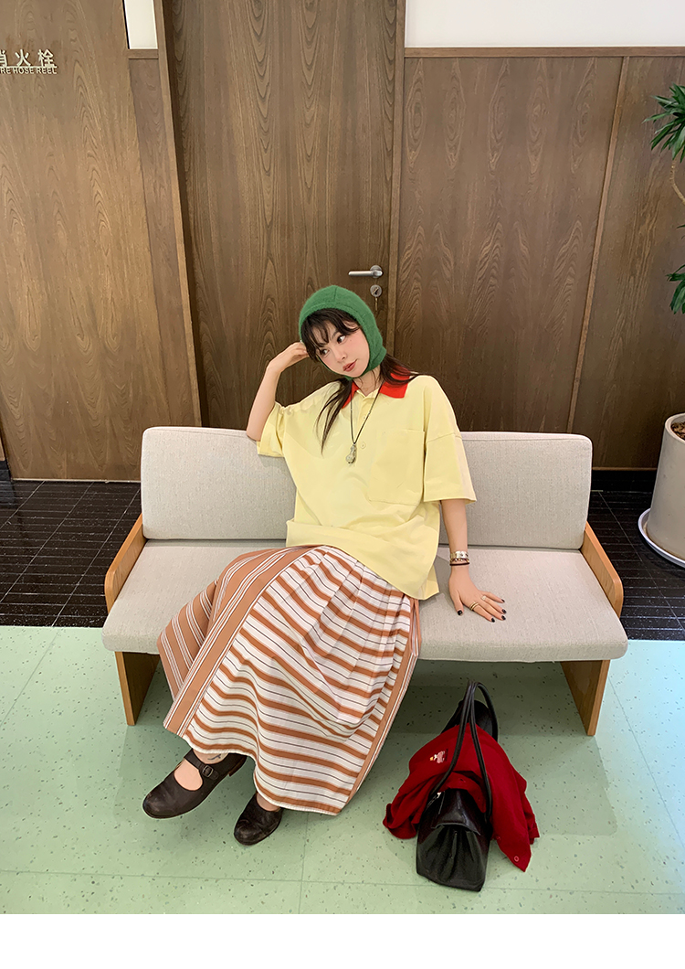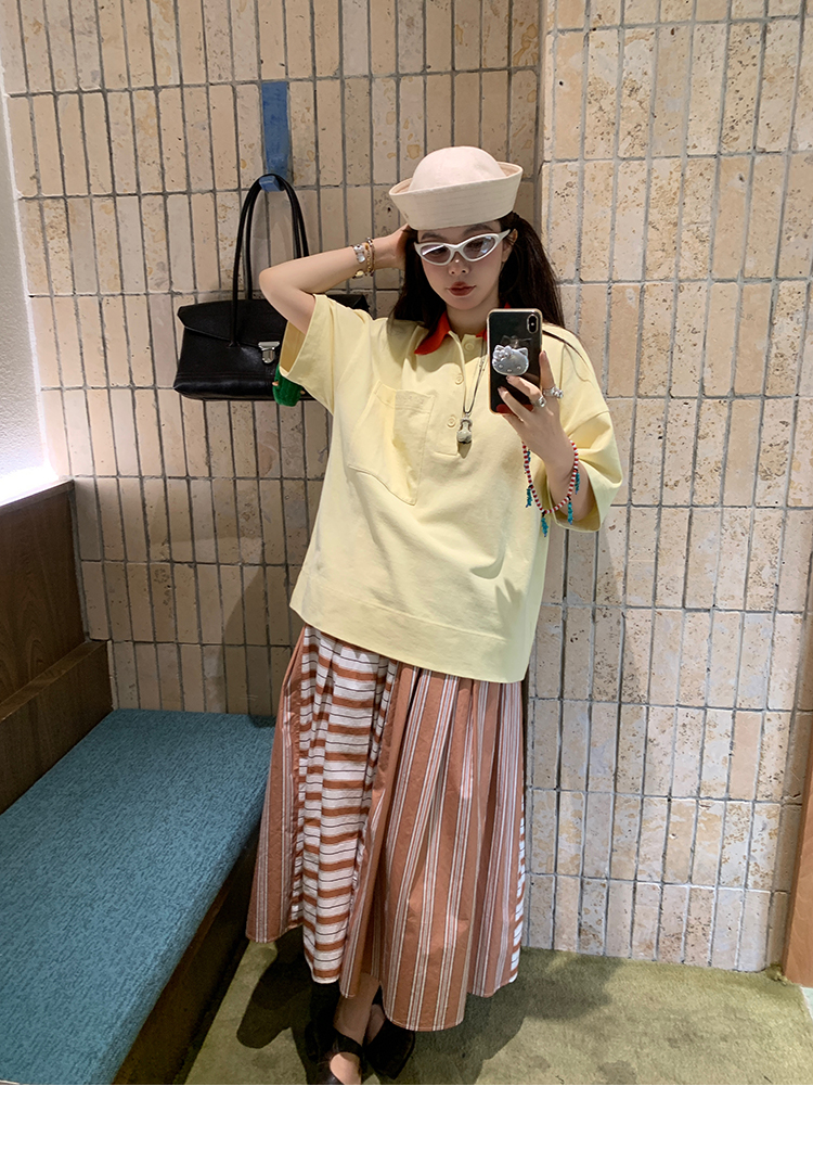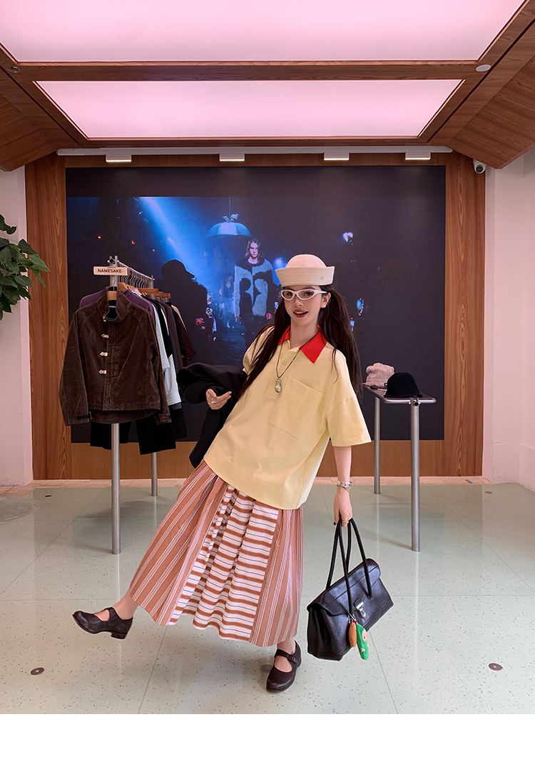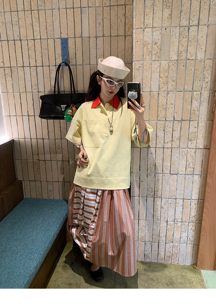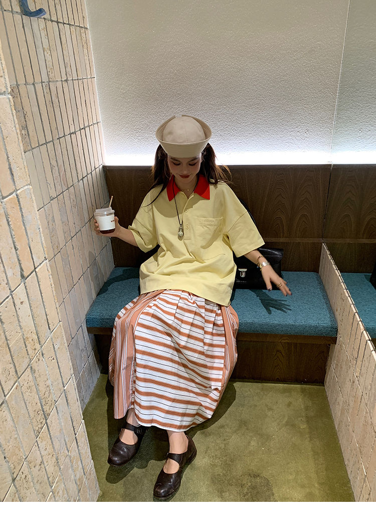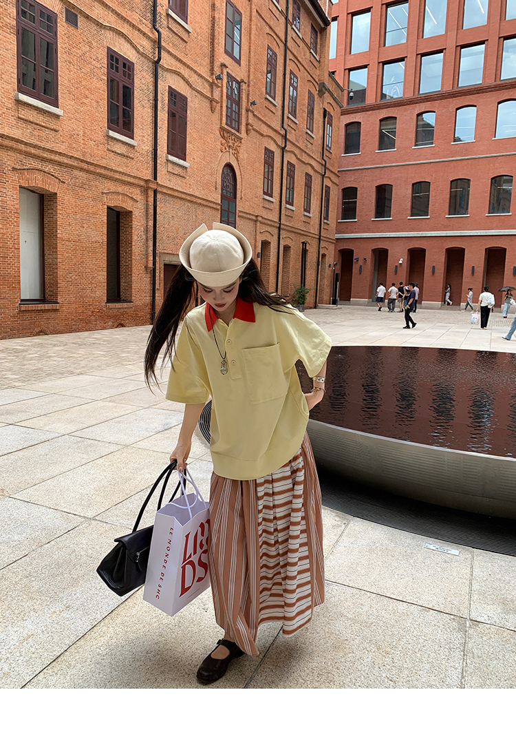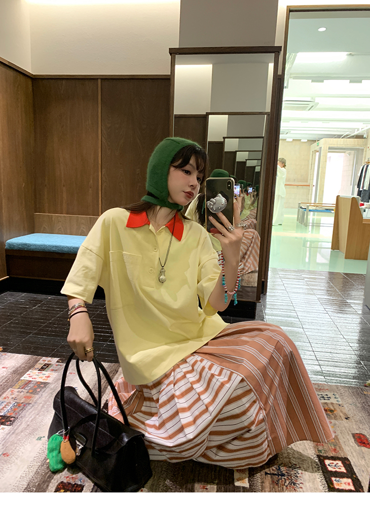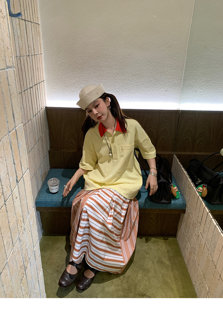 LRIB color trick contrast lapel Polo short-sleeved top and striped skirt