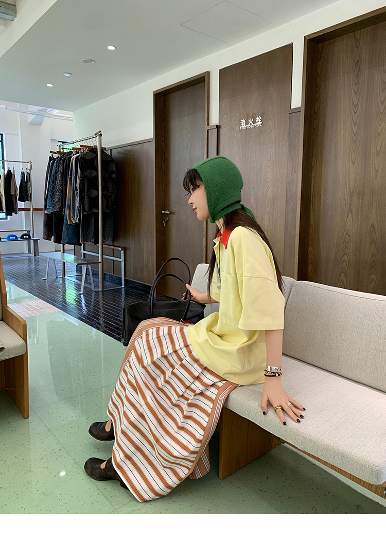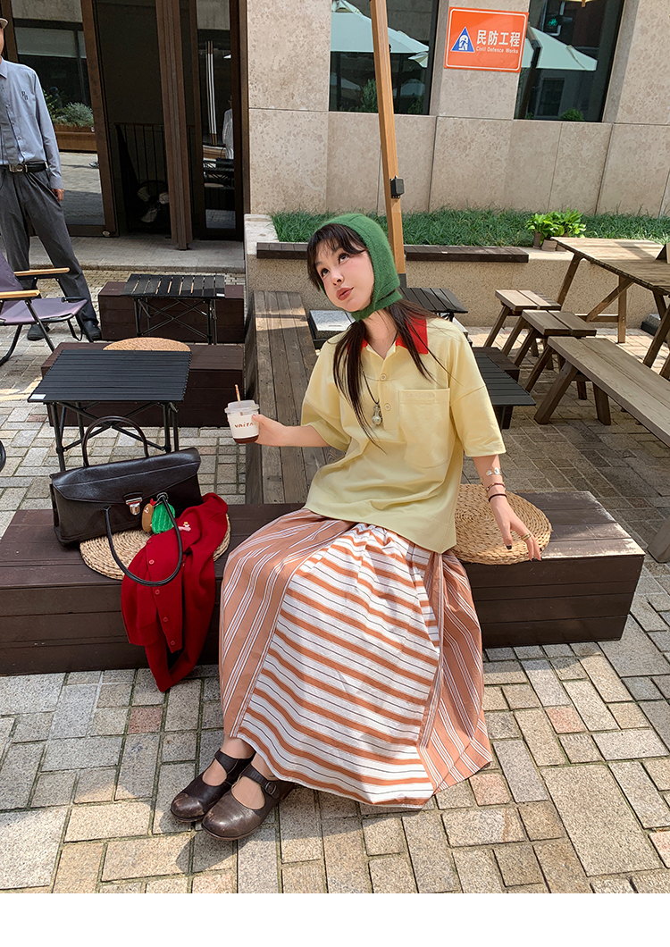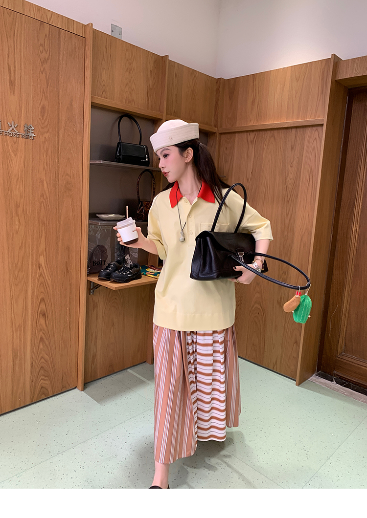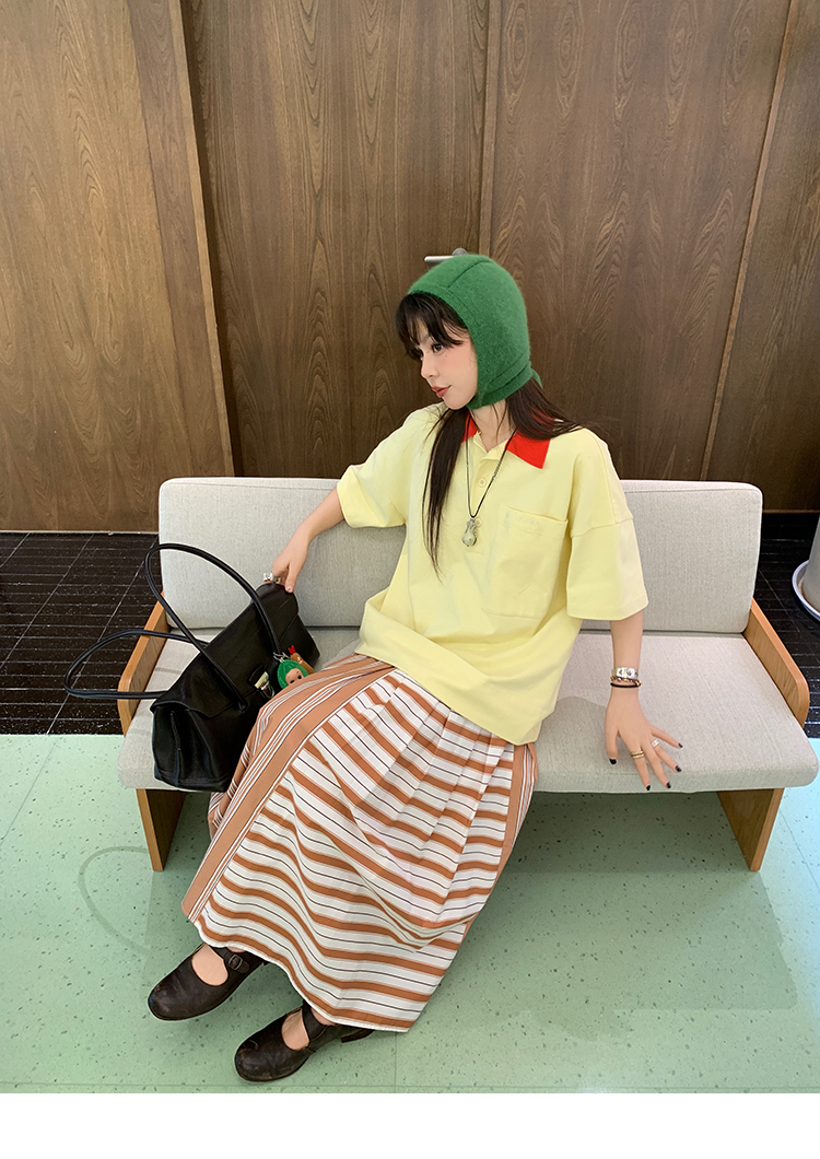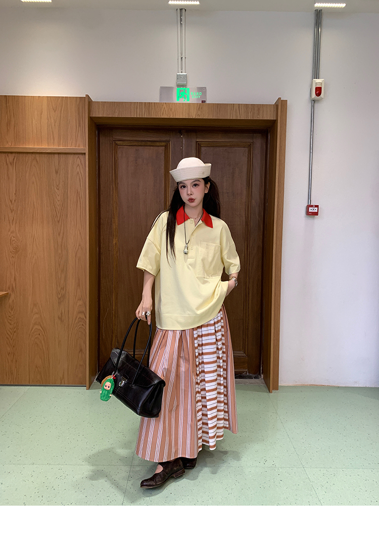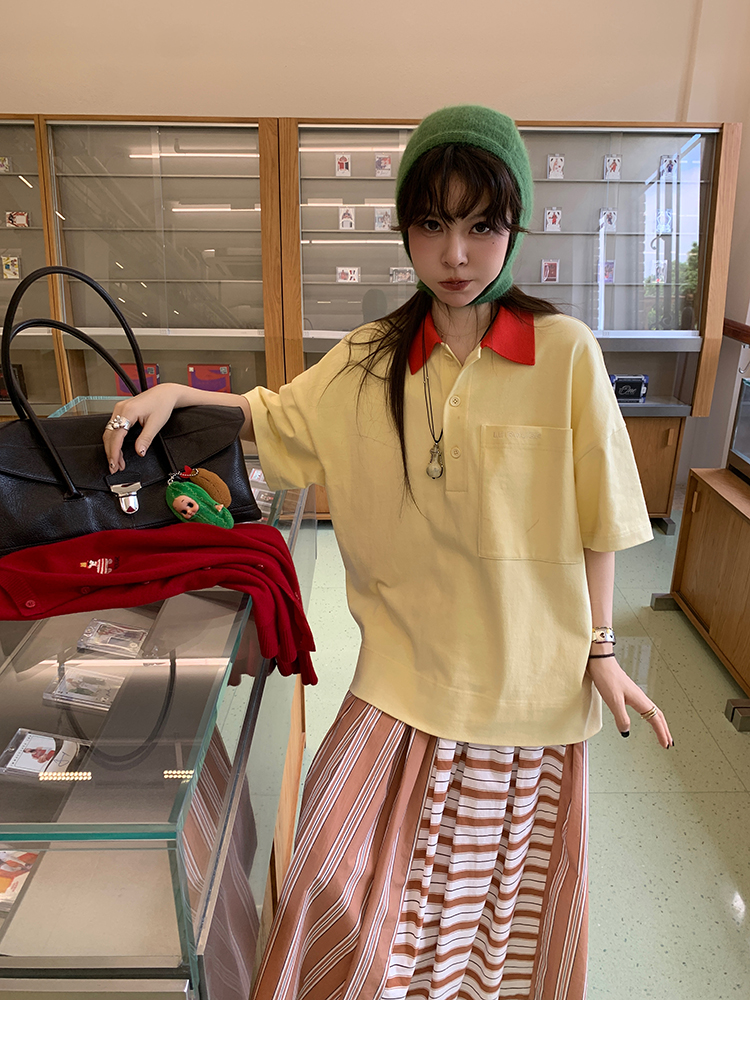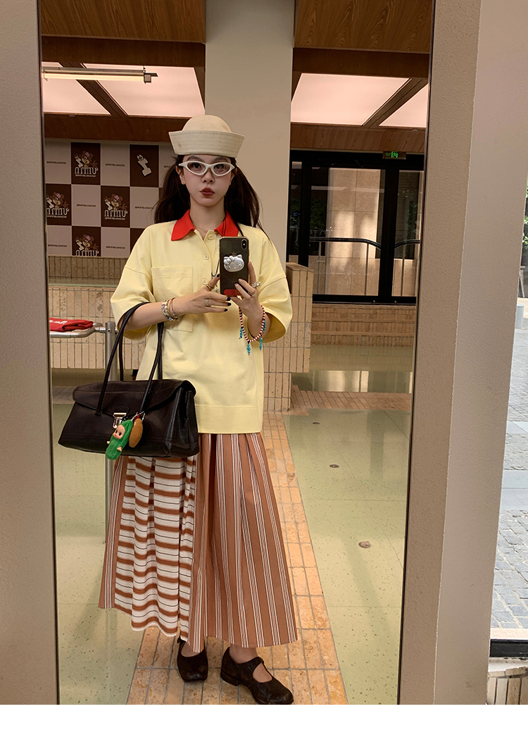 LRIB color trick contrast lapel Polo short-sleeved top and striped skirt
