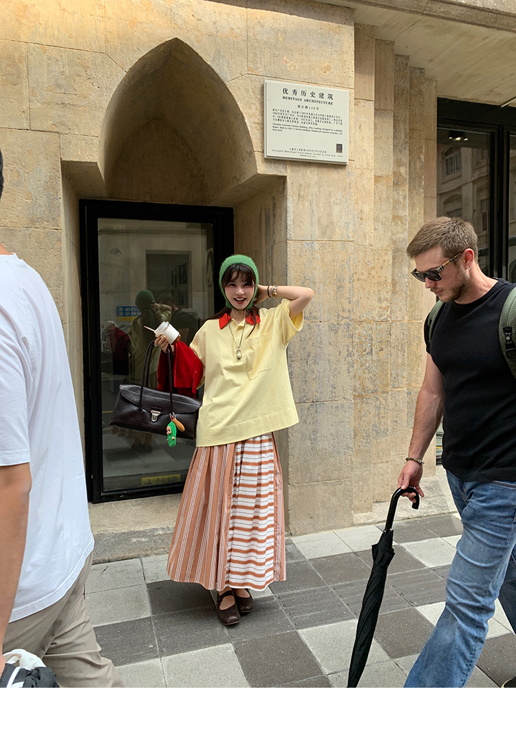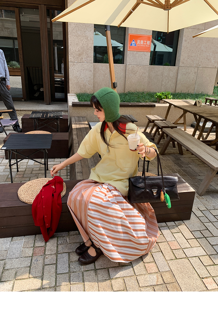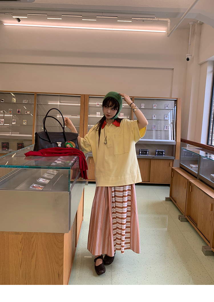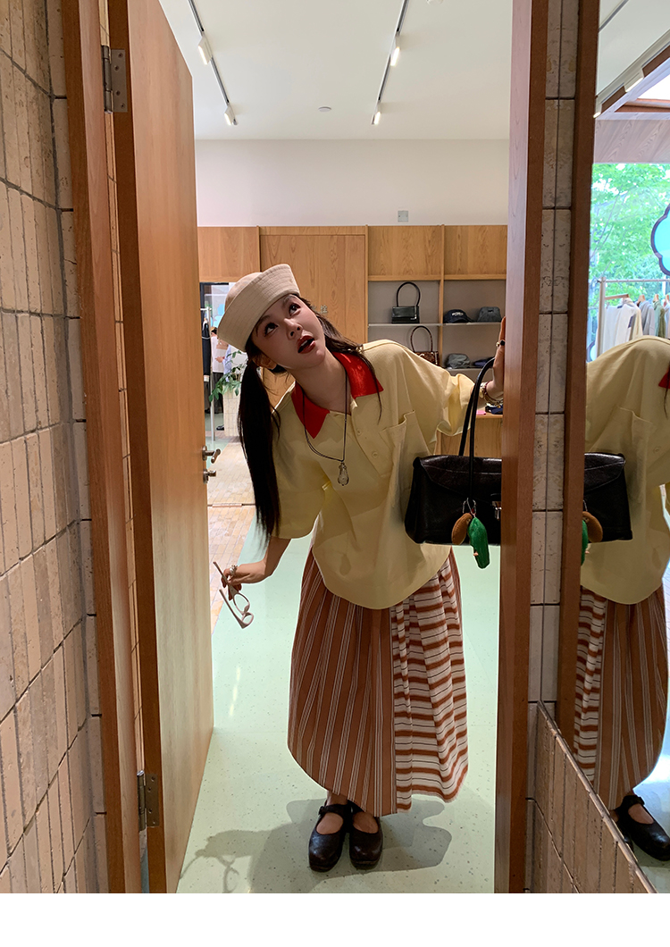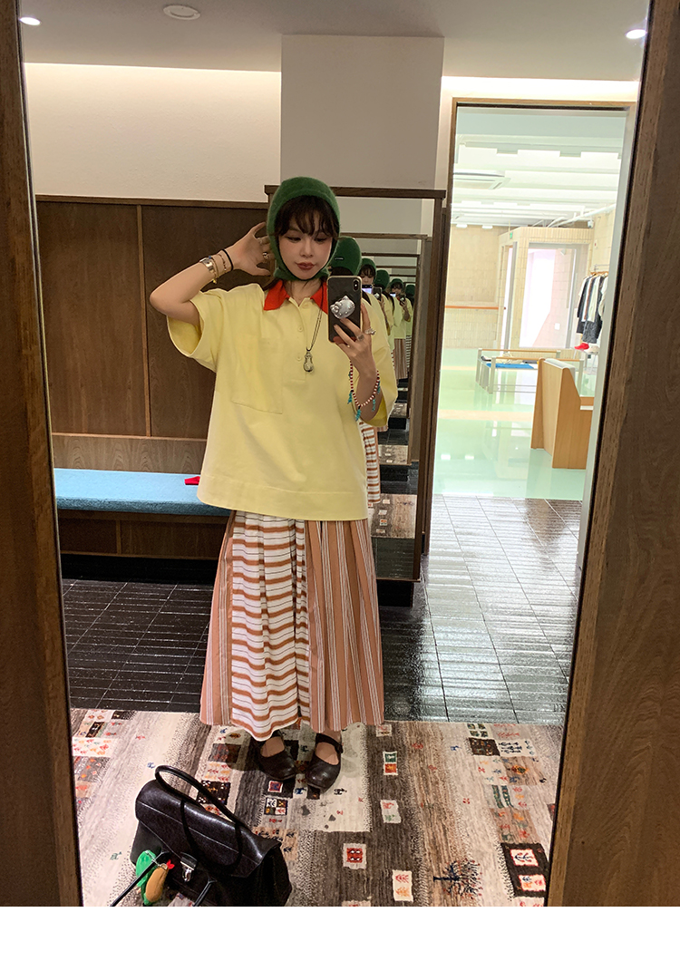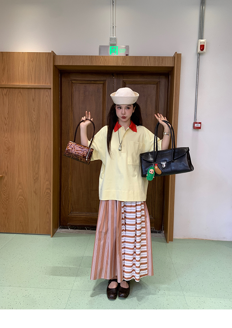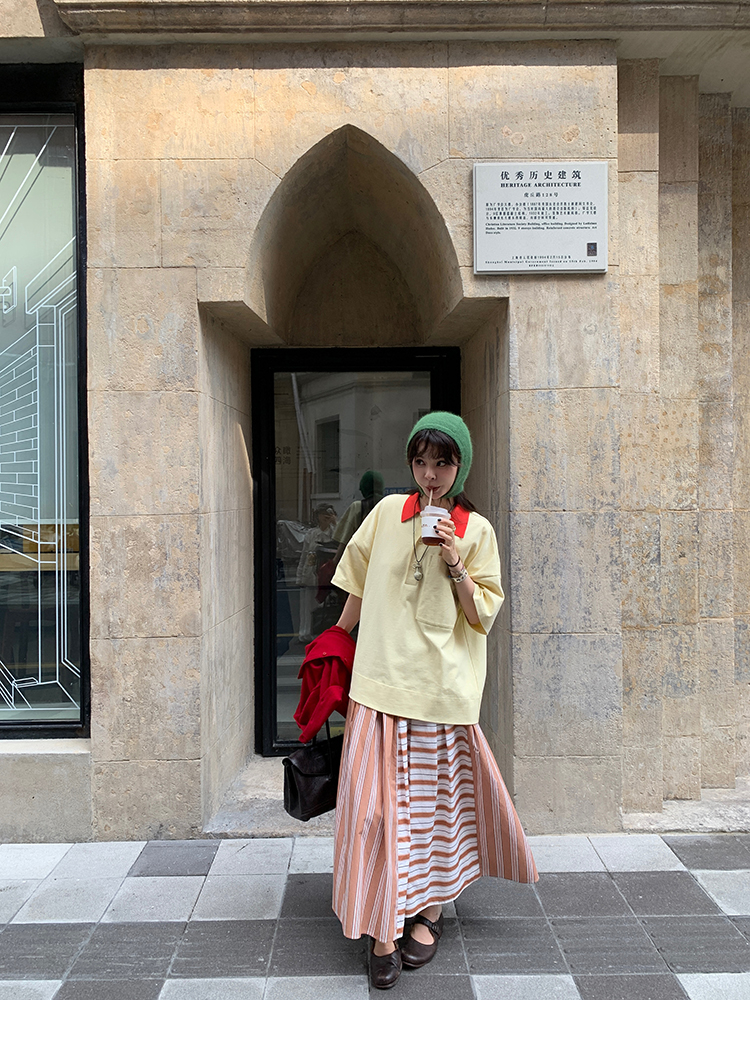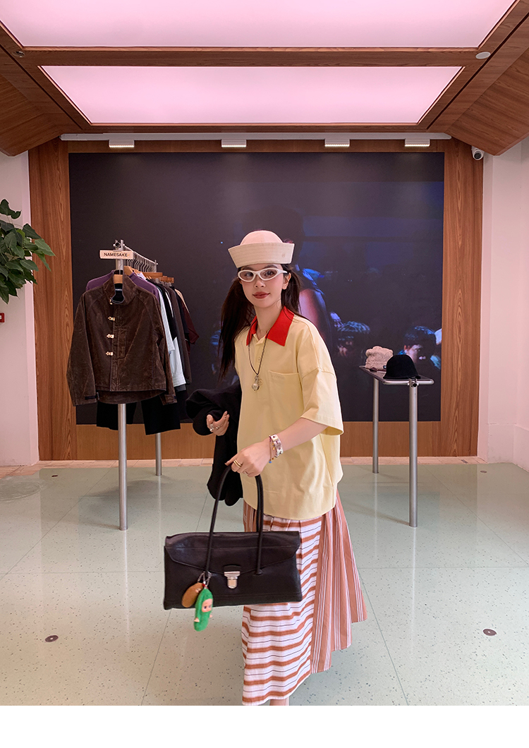 LRIB color trick contrast lapel Polo short-sleeved top and striped skirt