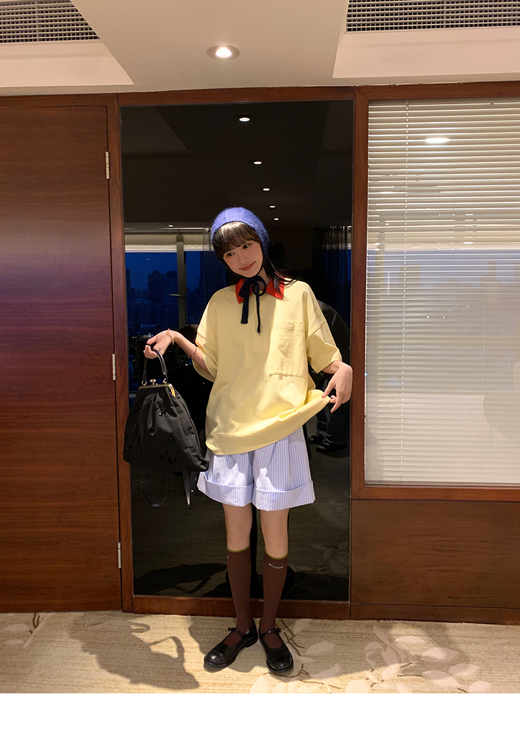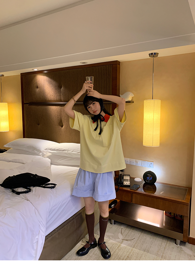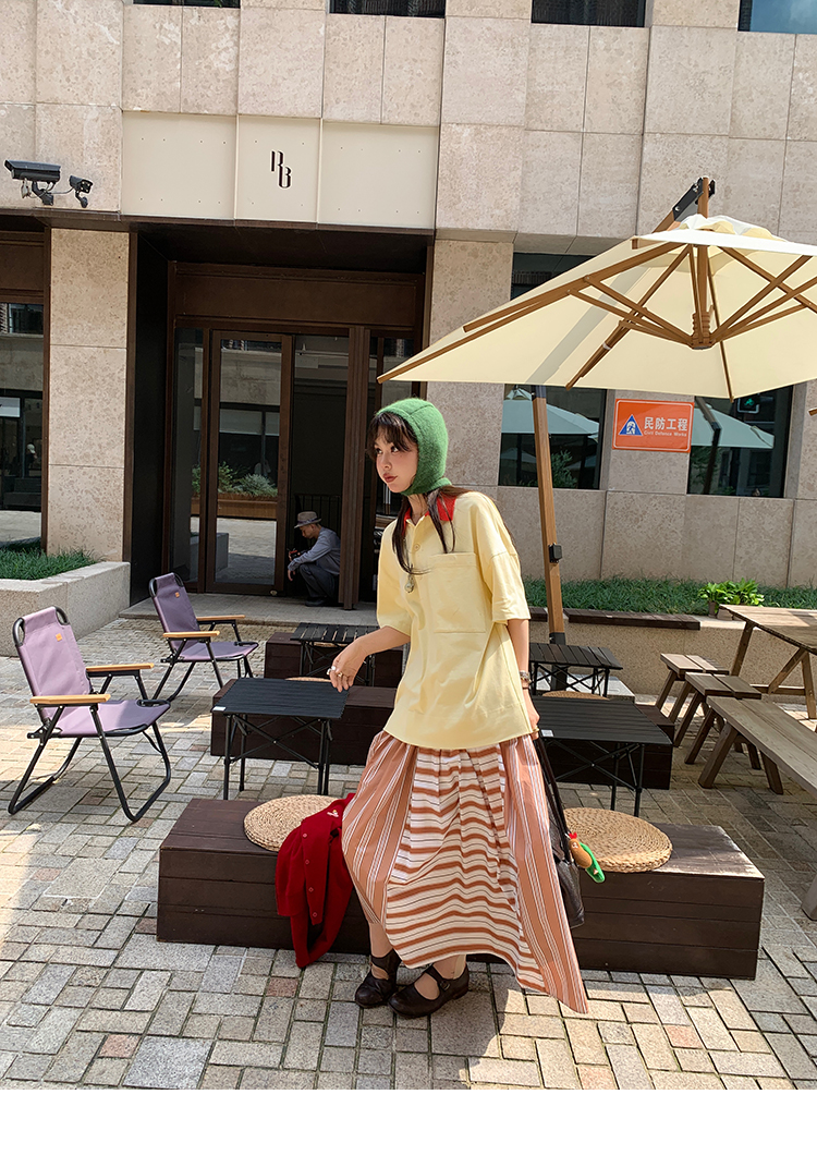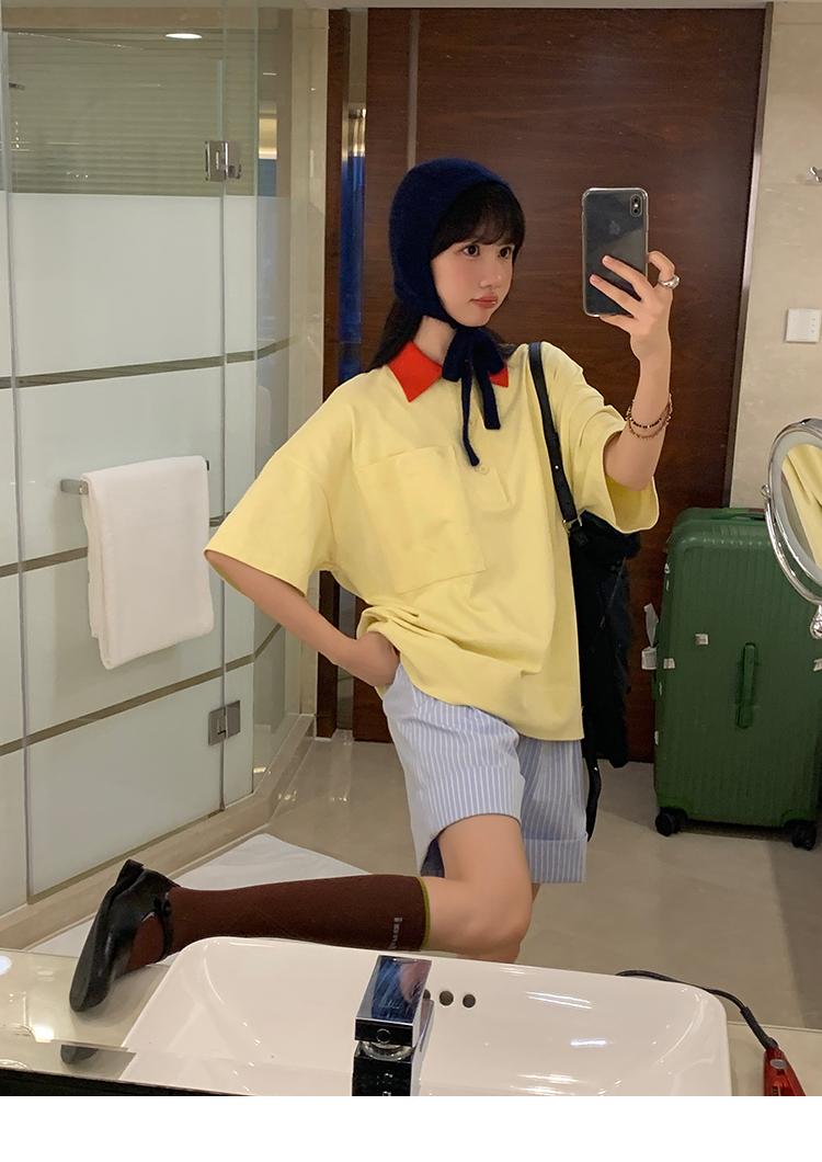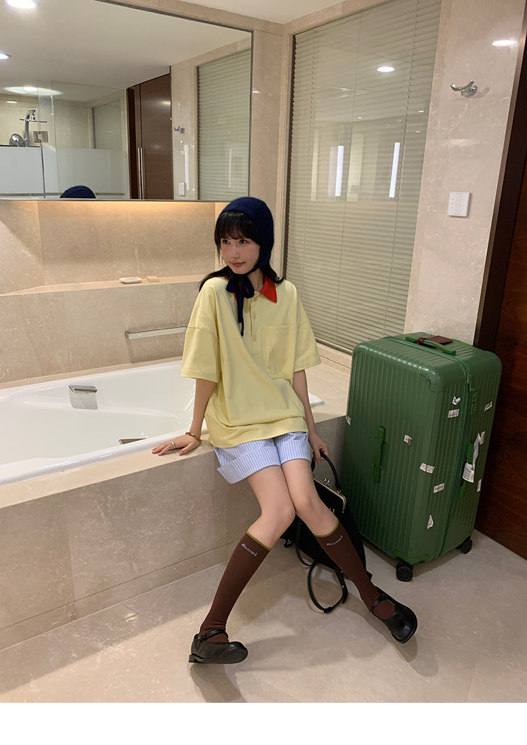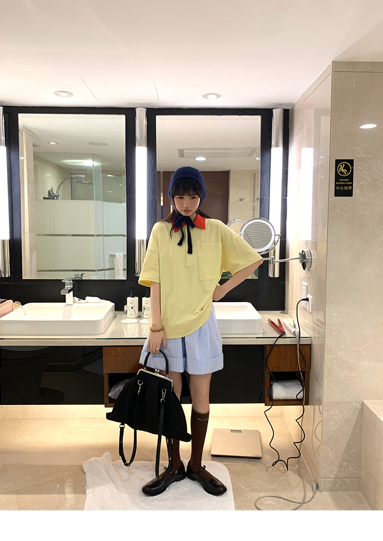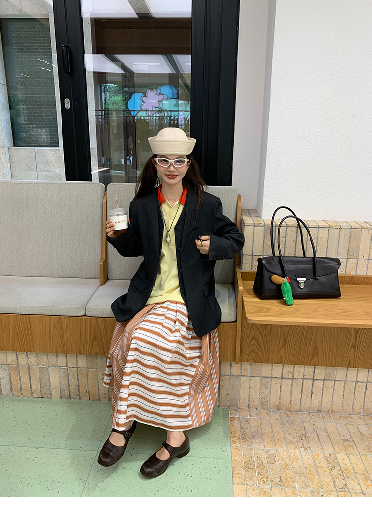 LRIB color trick contrast lapel Polo short-sleeved top and striped skirt