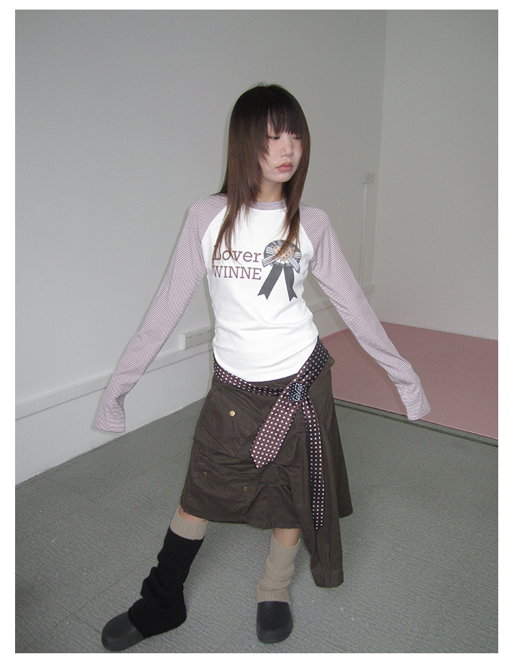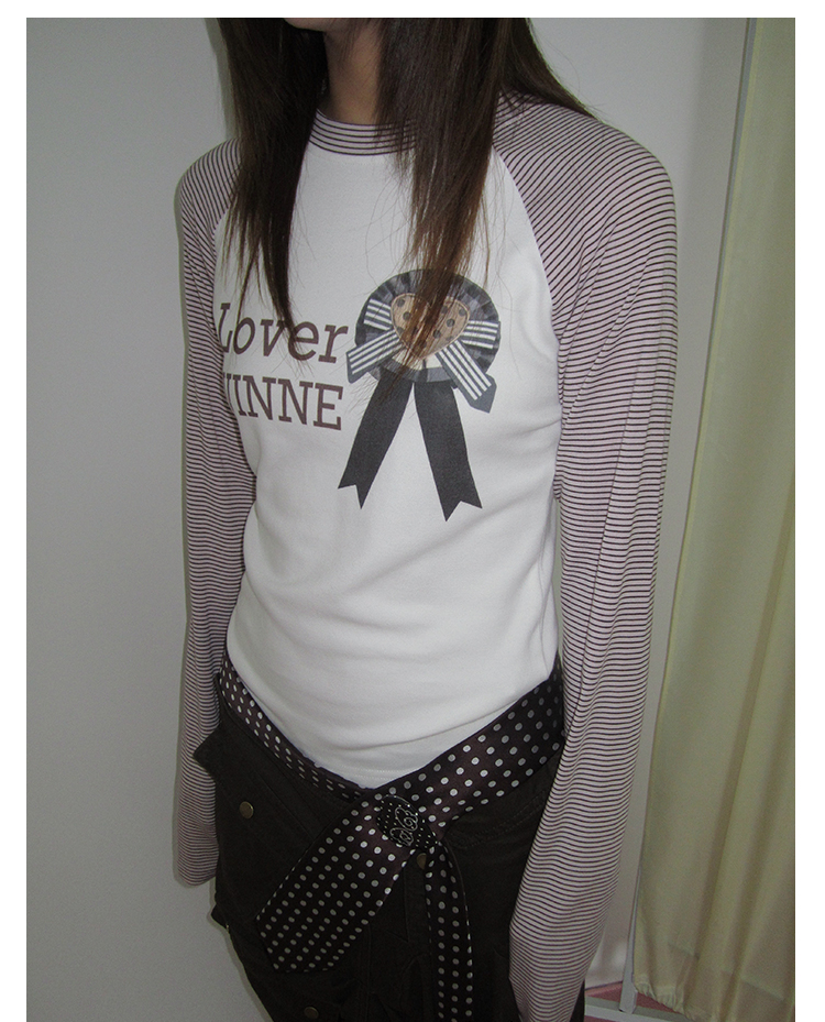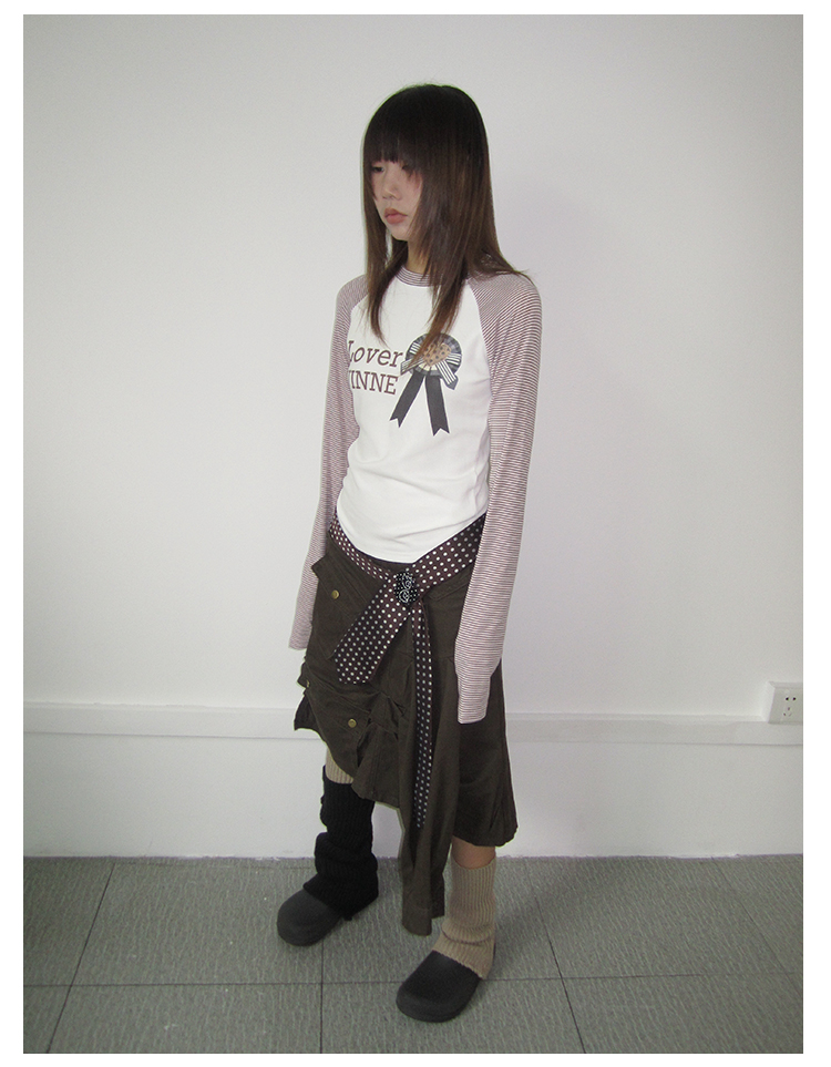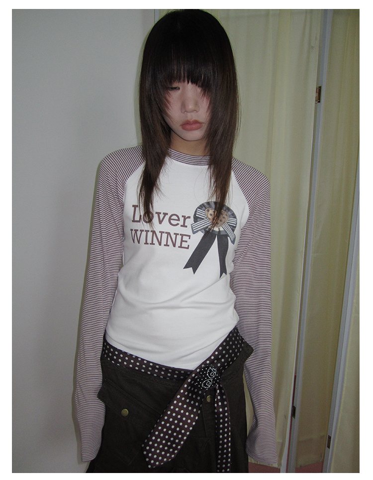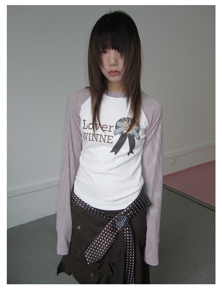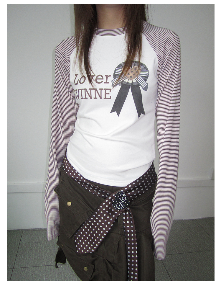 3MONTH letter print splicing stripes versatile loose long-sleeved T-shirt