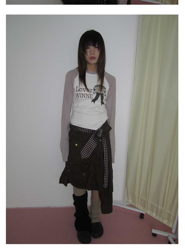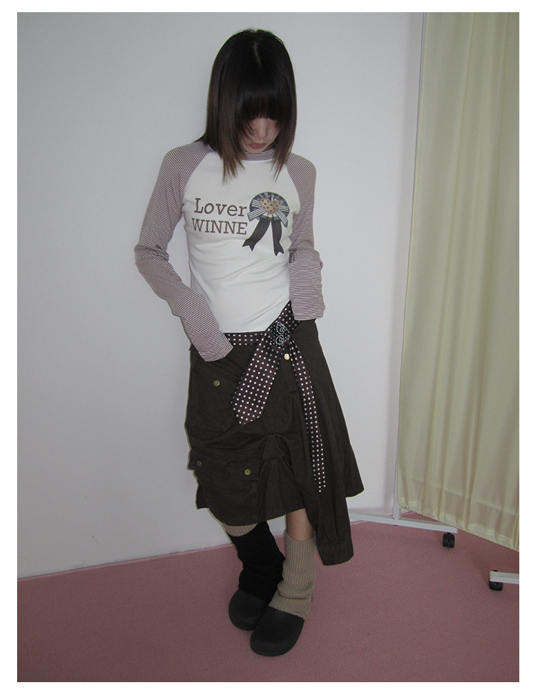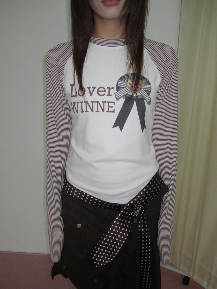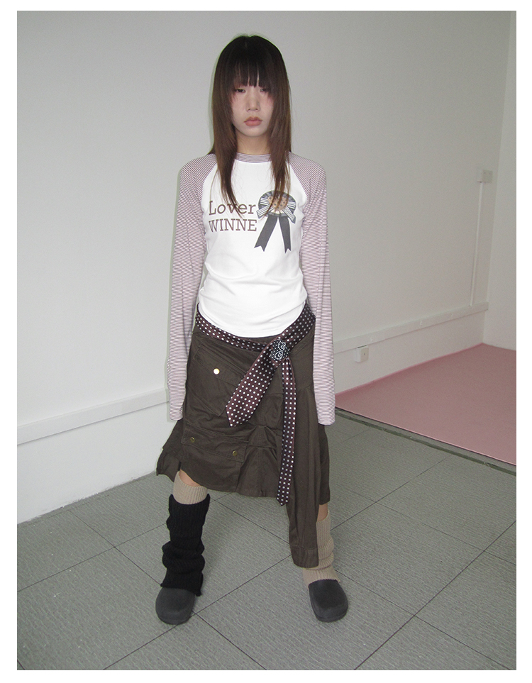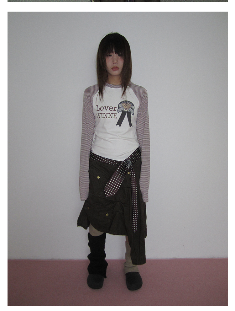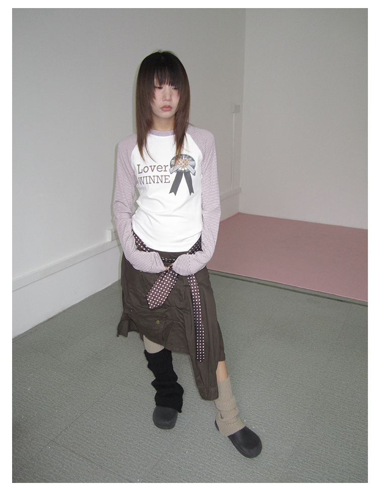 3MONTH letter print splicing stripes versatile loose long-sleeved T-shirt