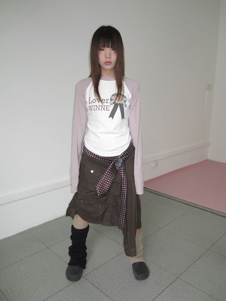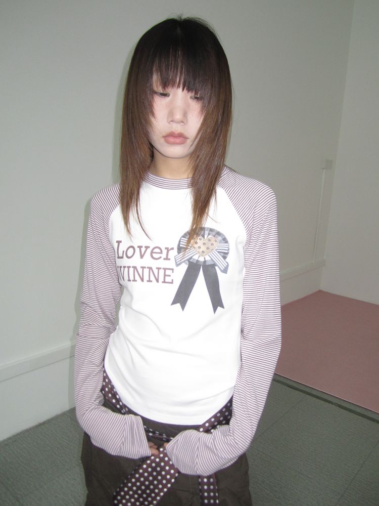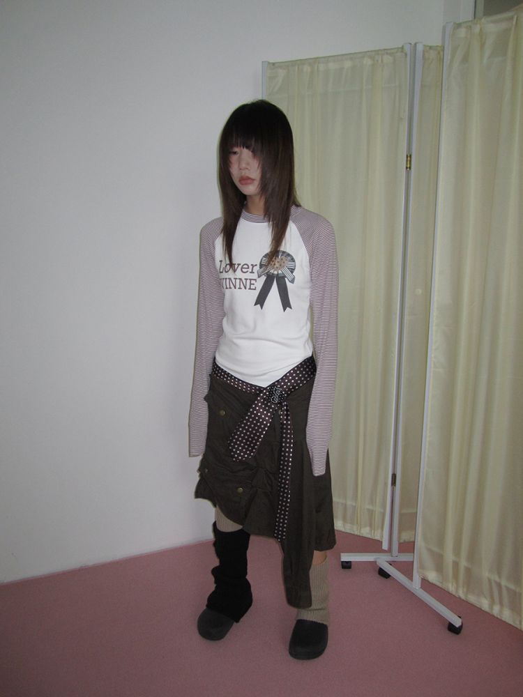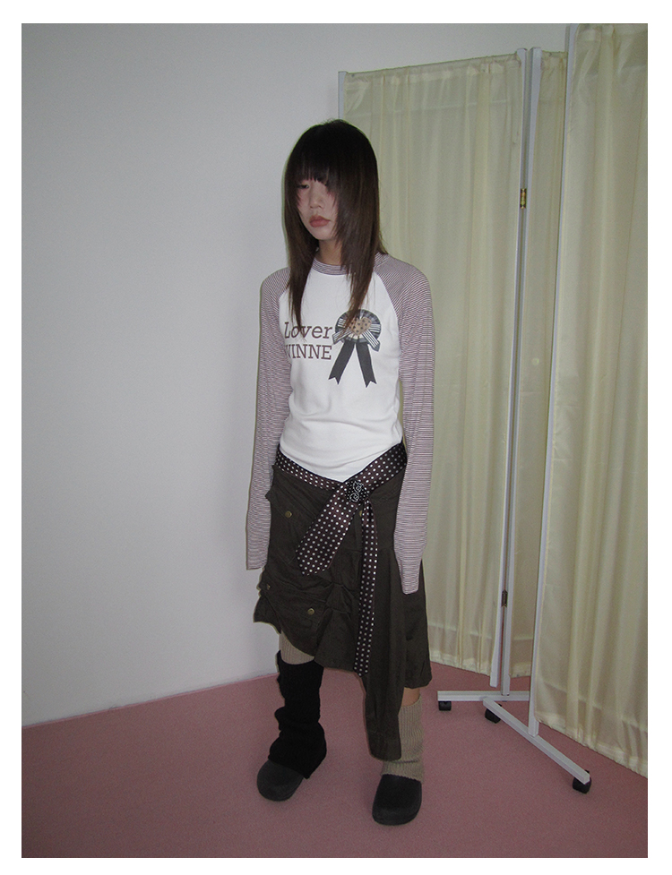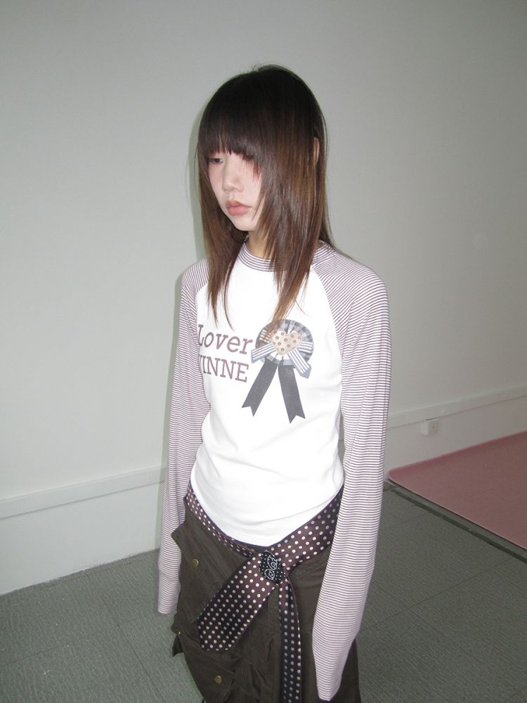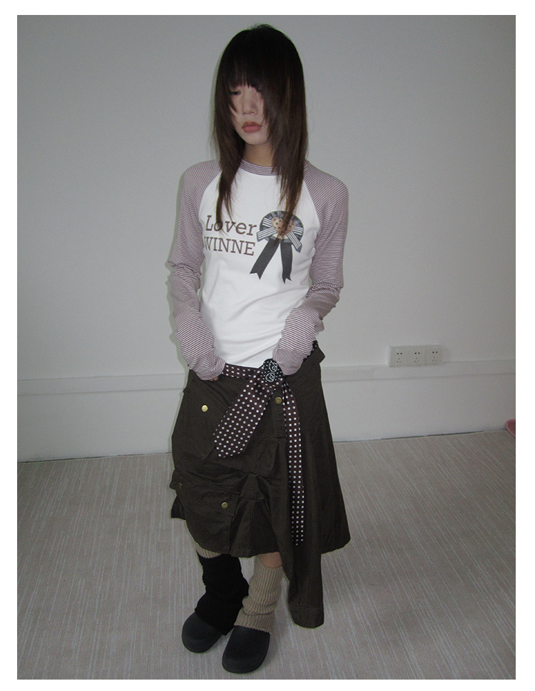 3MONTH letter print splicing stripes versatile loose long-sleeved T-shirt