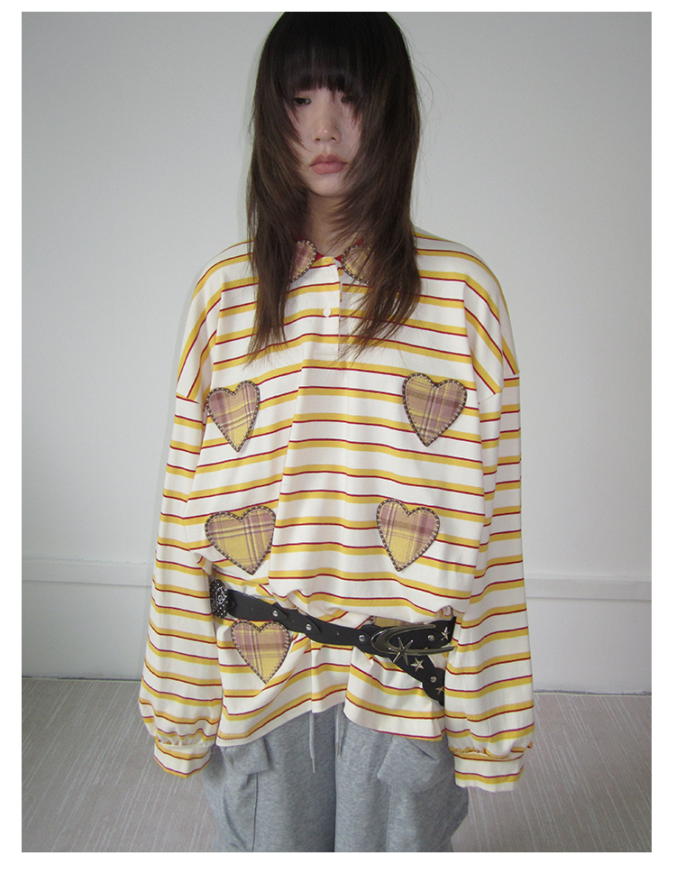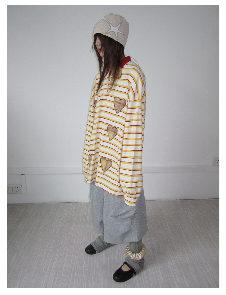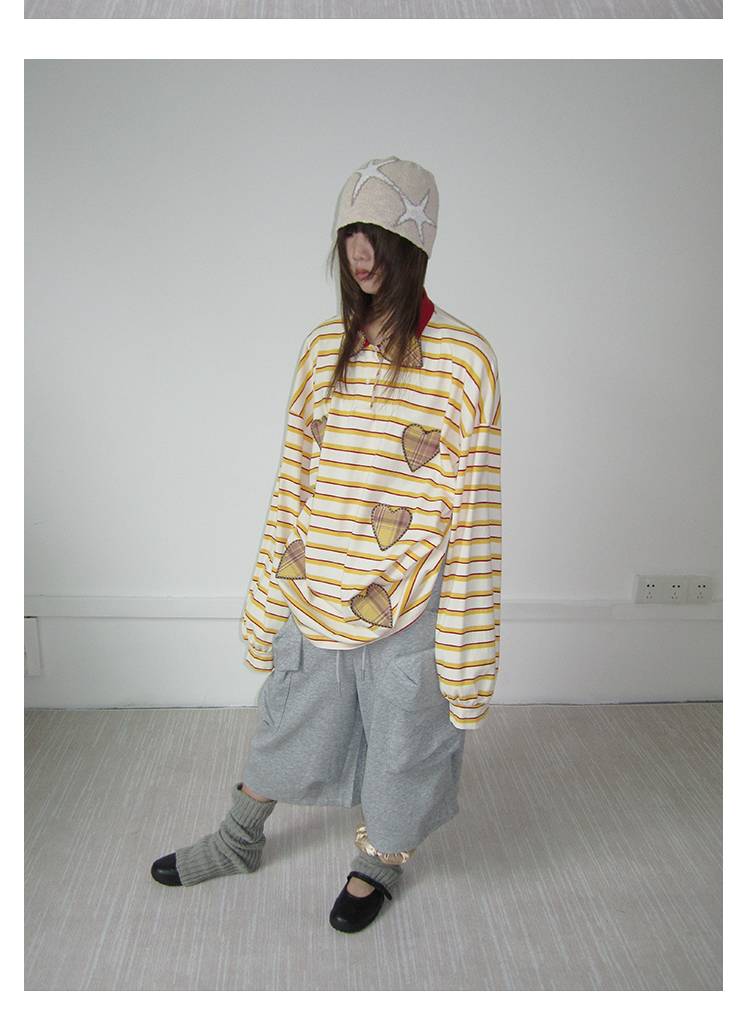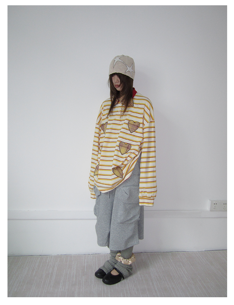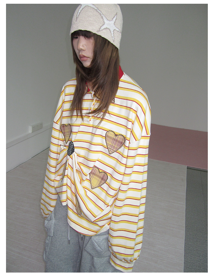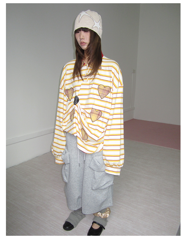 3MONTH striped three-dimensional decorative heart loose versatile sweatshirt