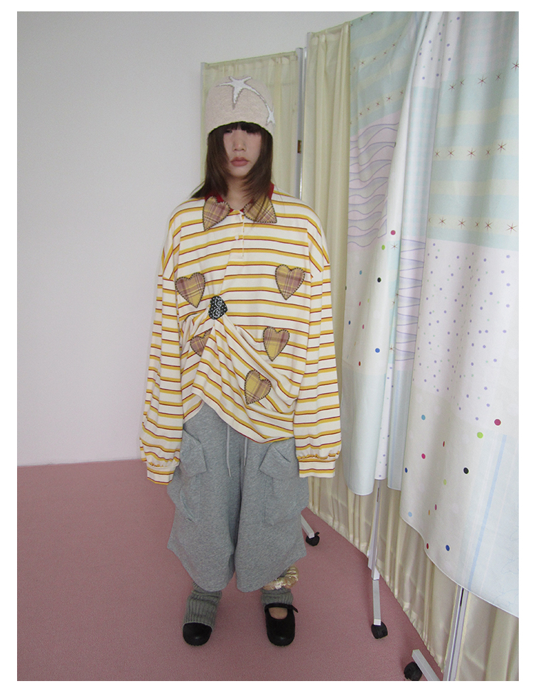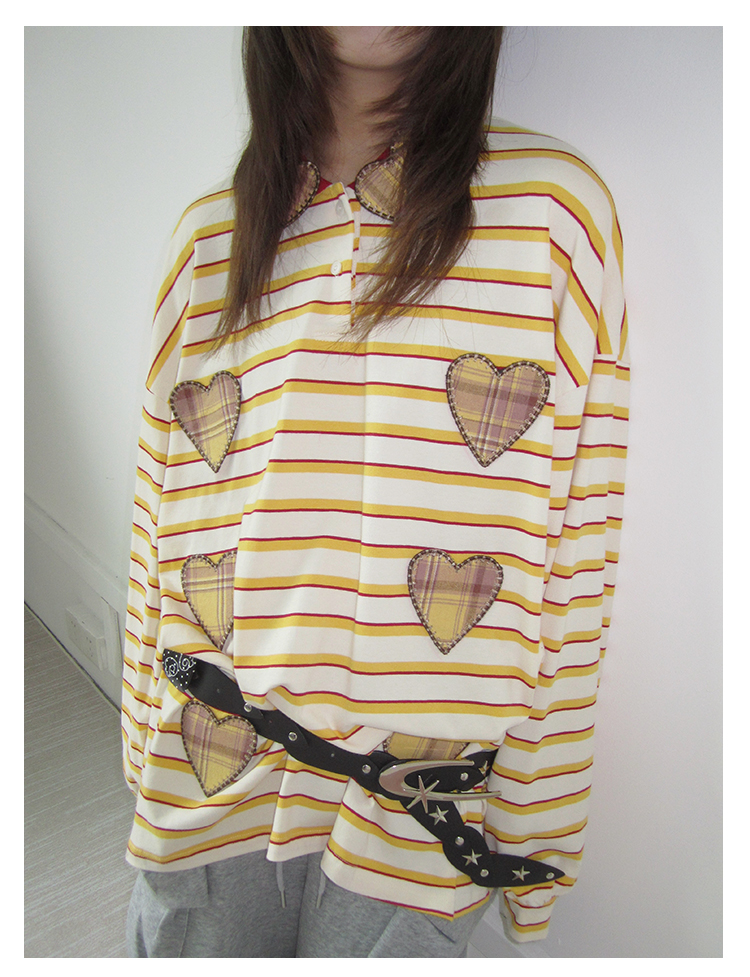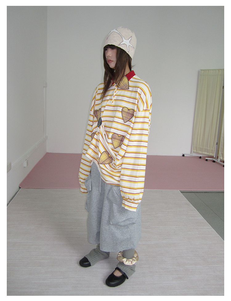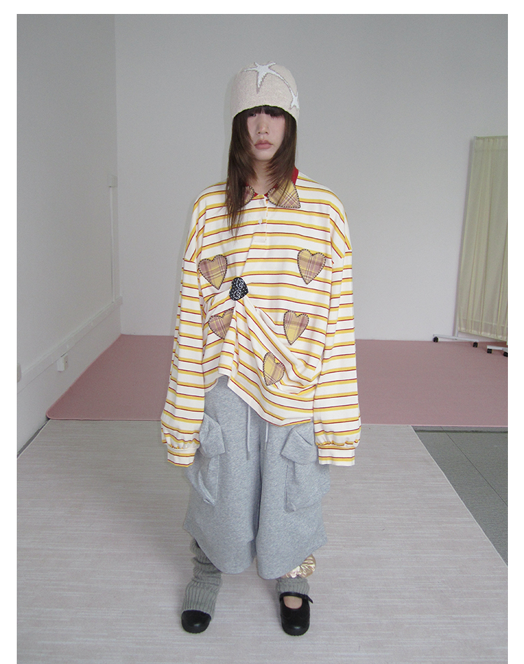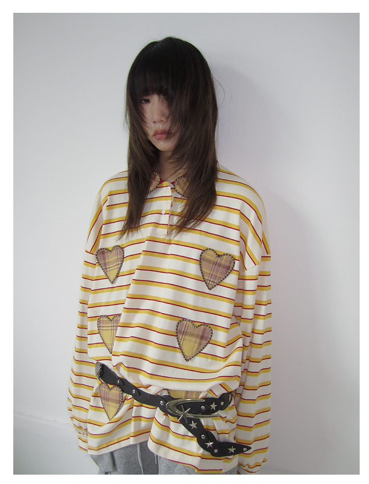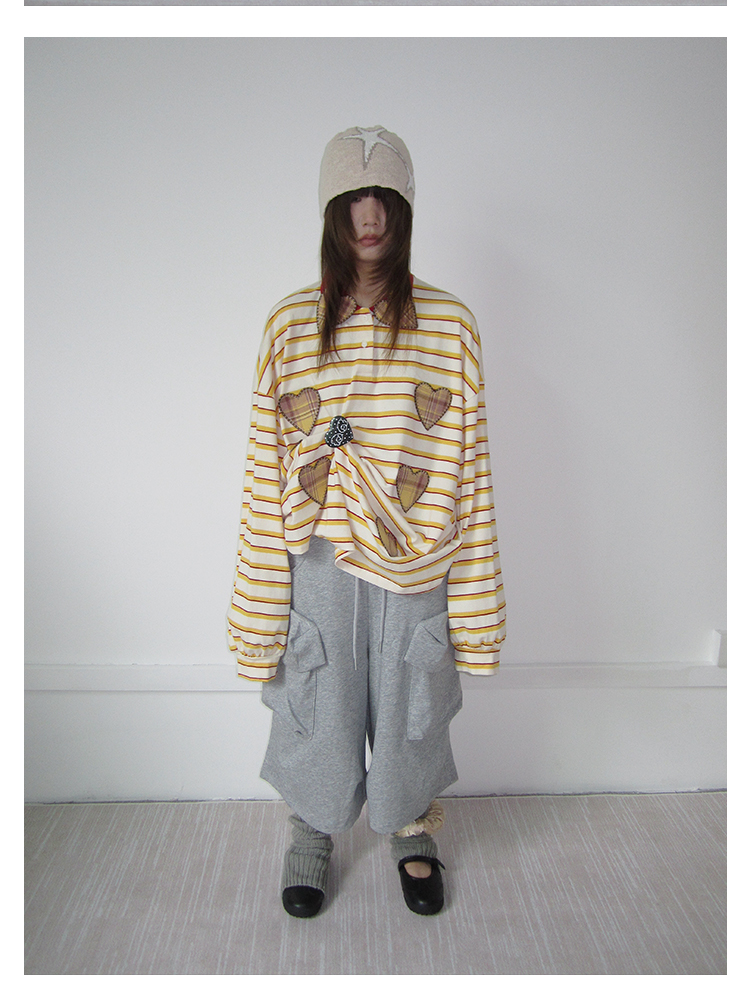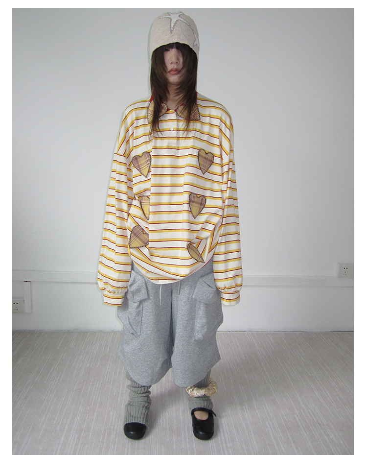 3MONTH striped three-dimensional decorative heart loose versatile sweatshirt