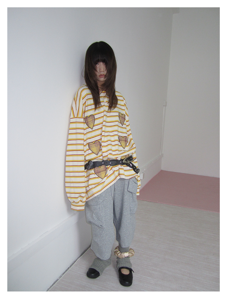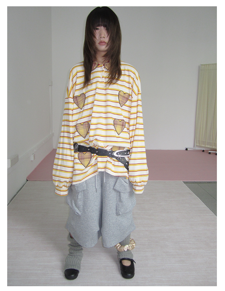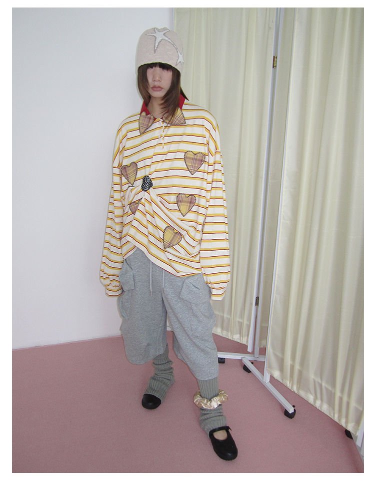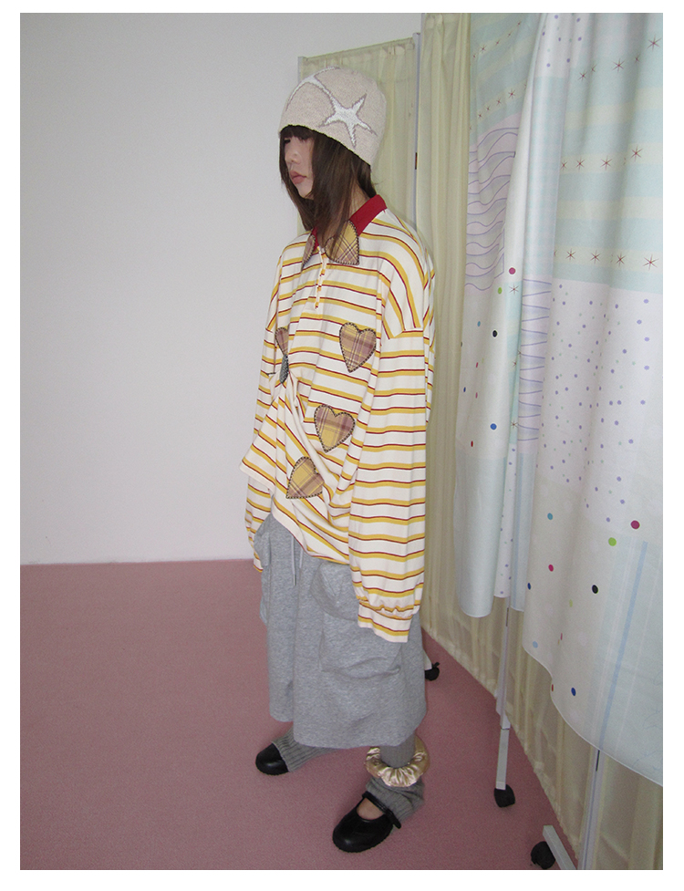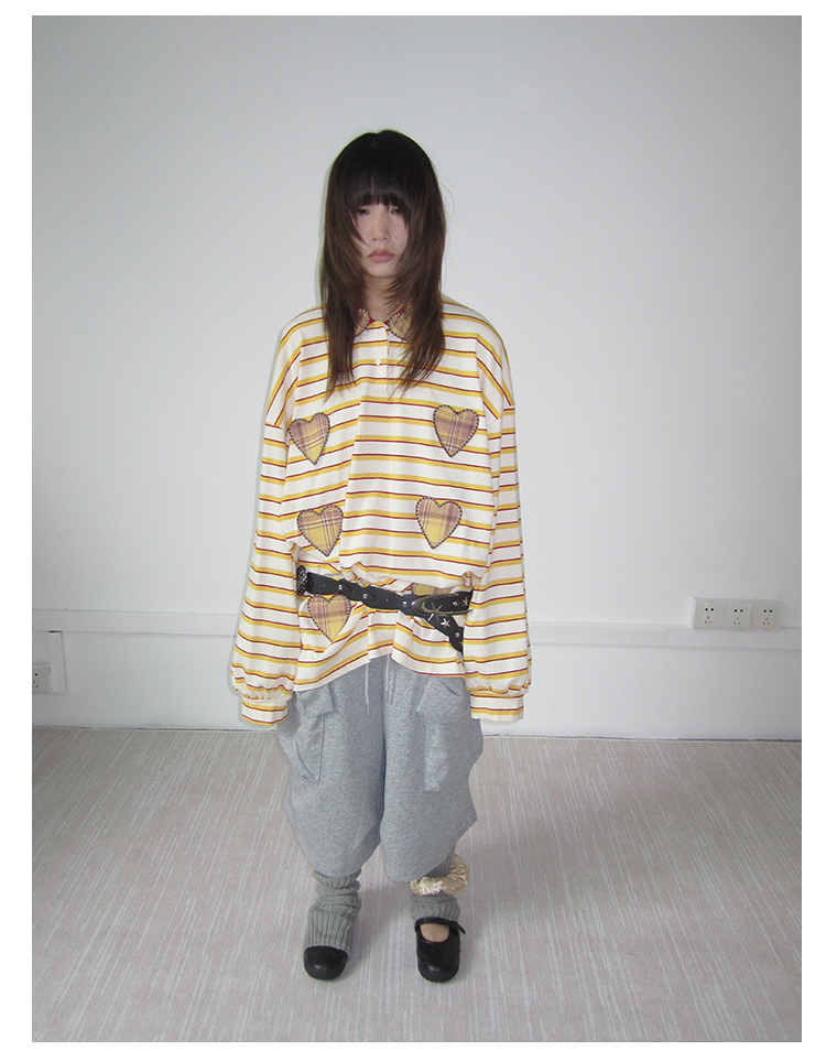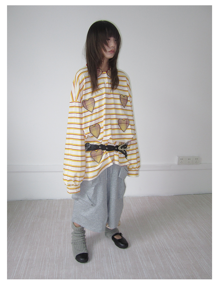 3MONTH striped three-dimensional decorative heart loose versatile sweatshirt