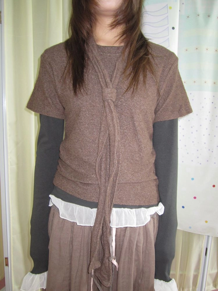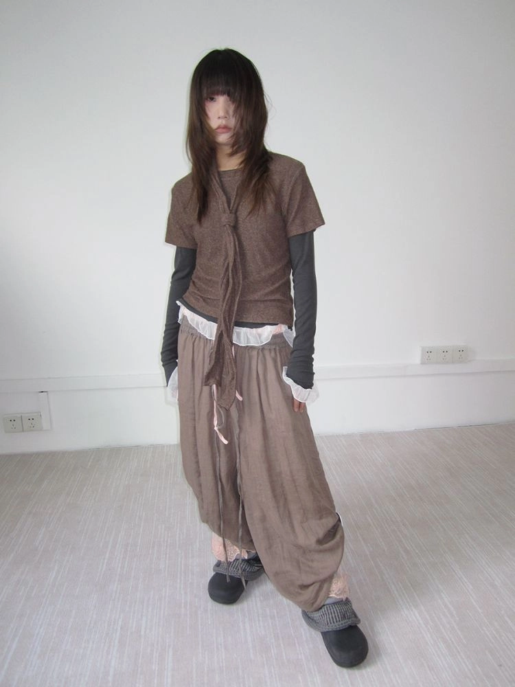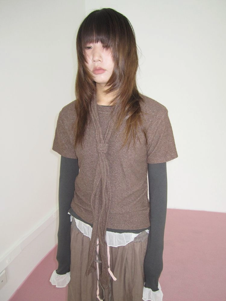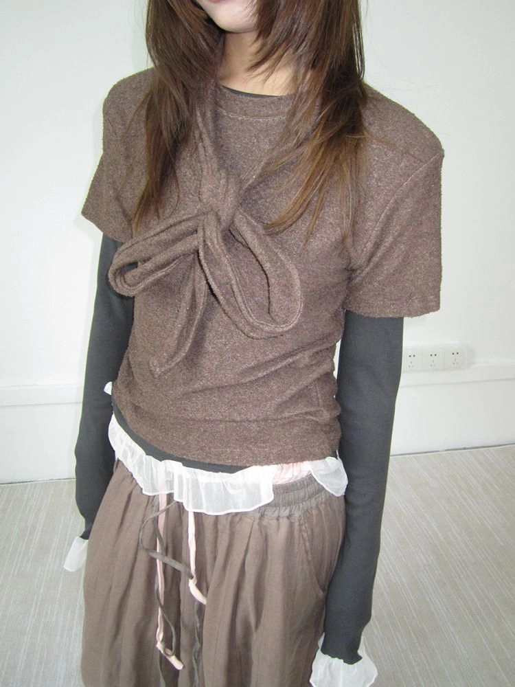 3MONTH round neck versatile loose T-shirt Brown with tieNEW