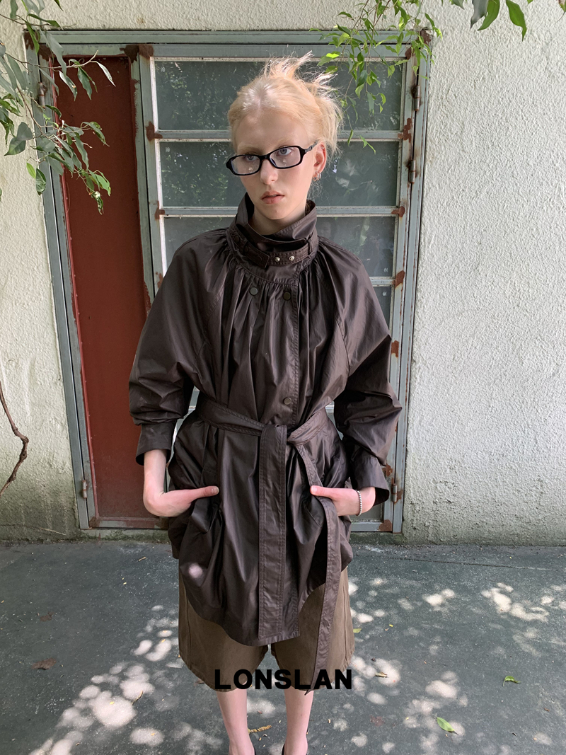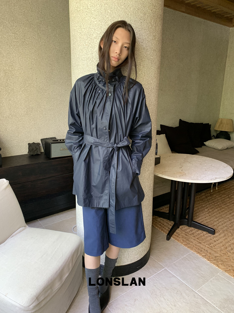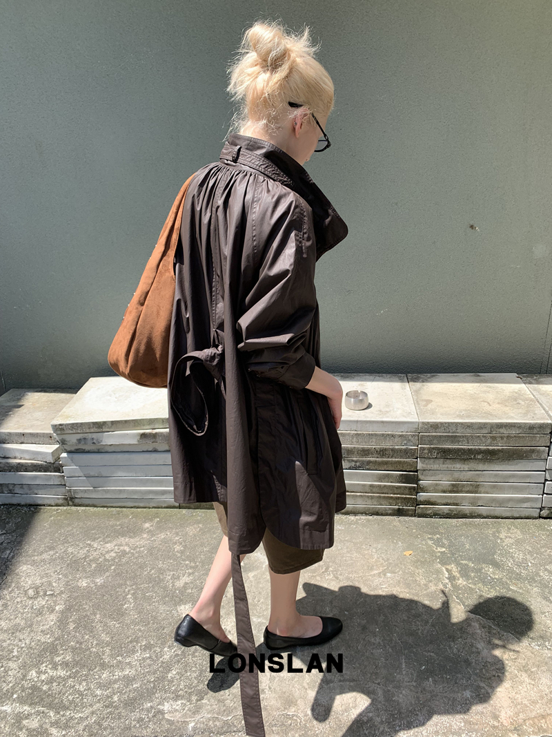 LONSLAN stand collar tie pleated waterproof leather windbreaker jacket