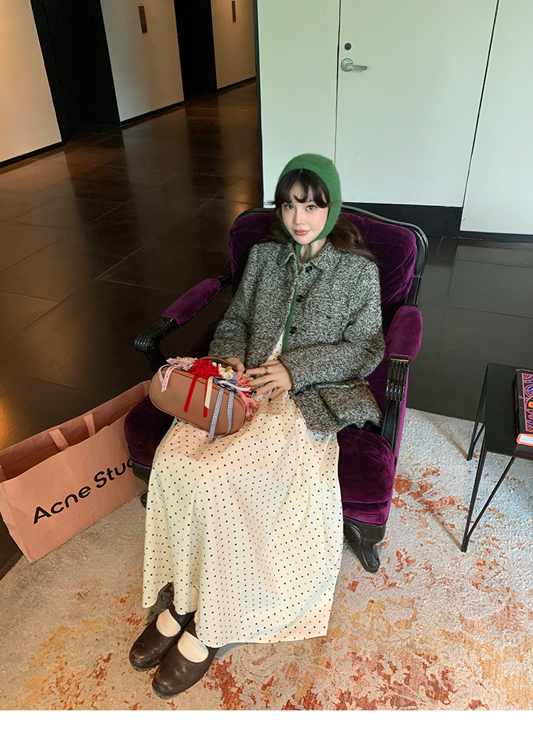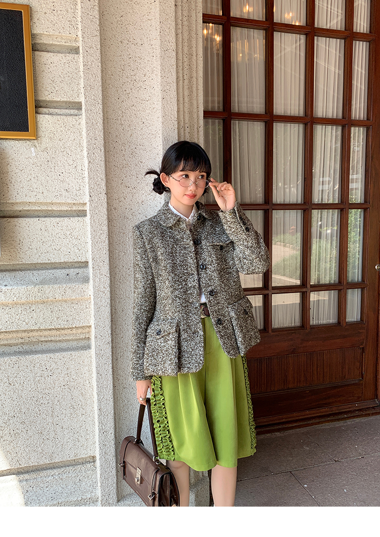 LRIB retro doll collar multi-pocket green herringbone wool short coat