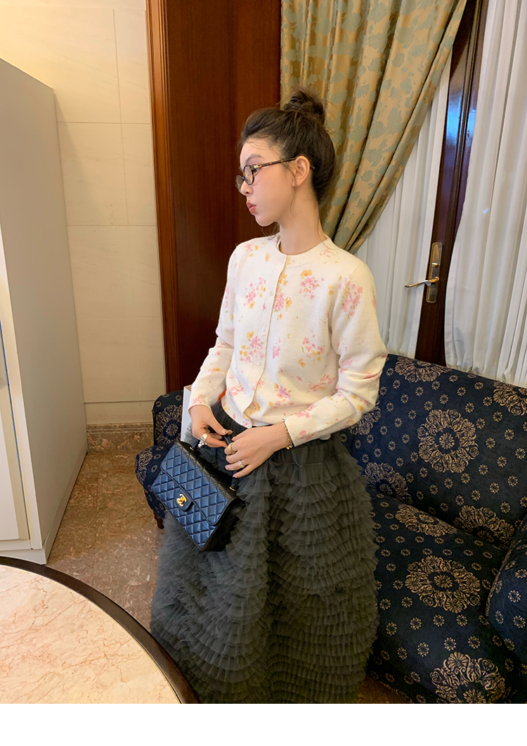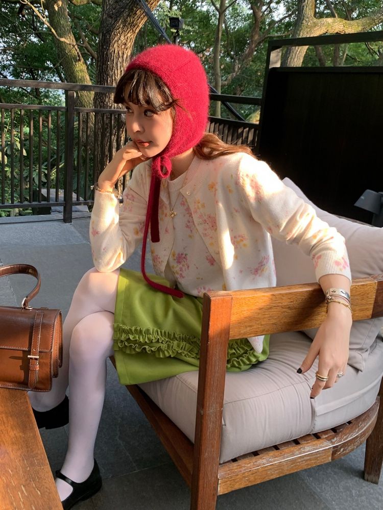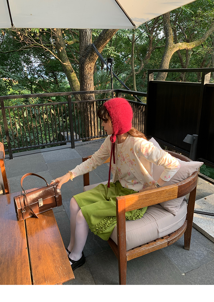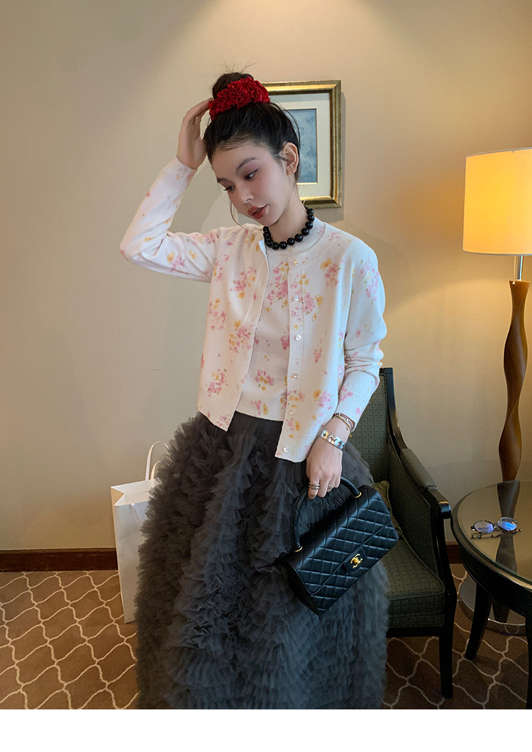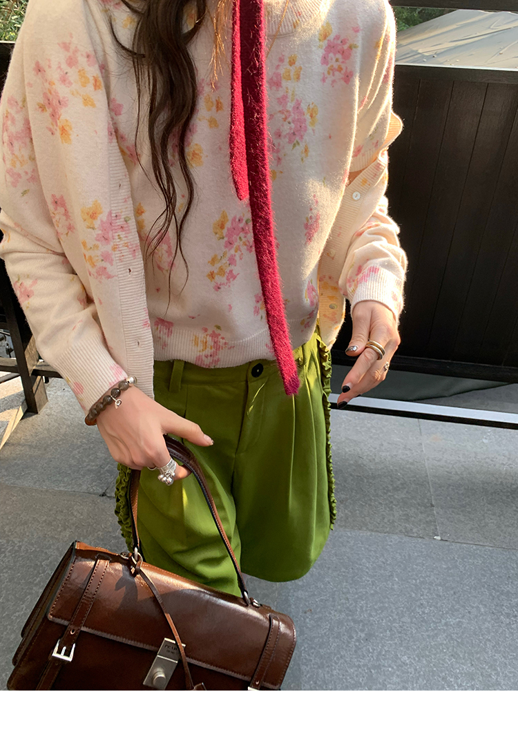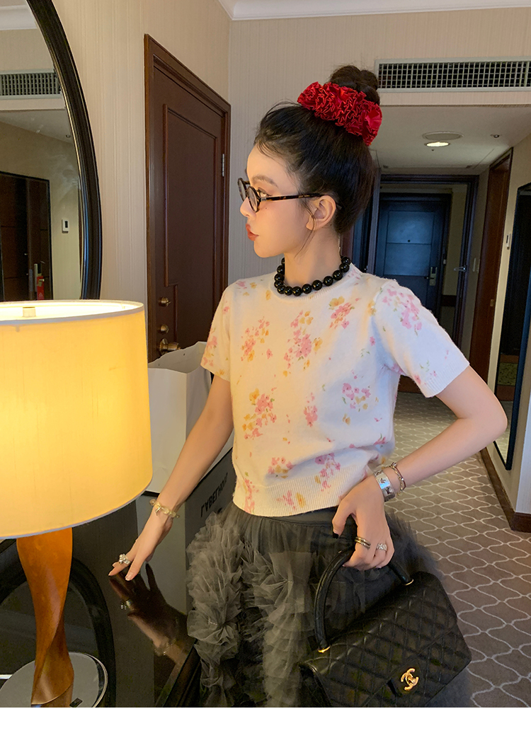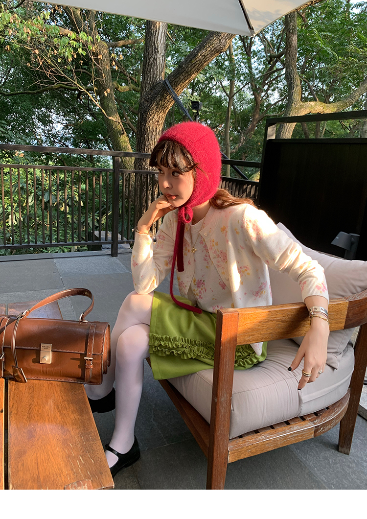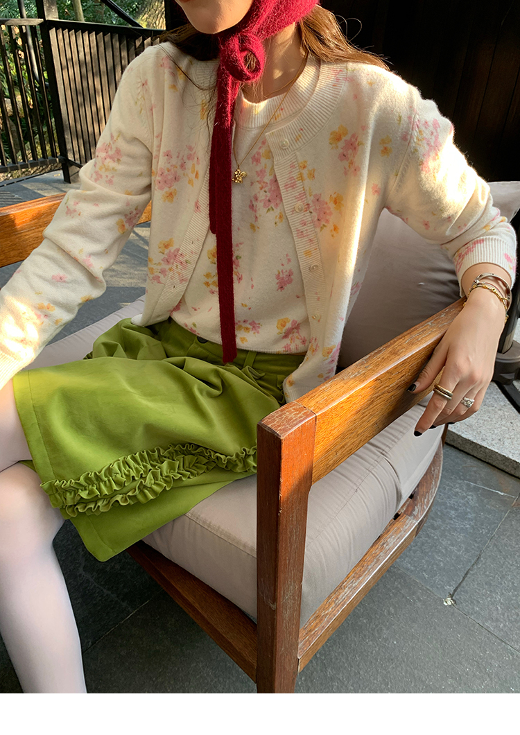LRIB pink floral wool round neck short-sleeved knitted cardigan two-piece set